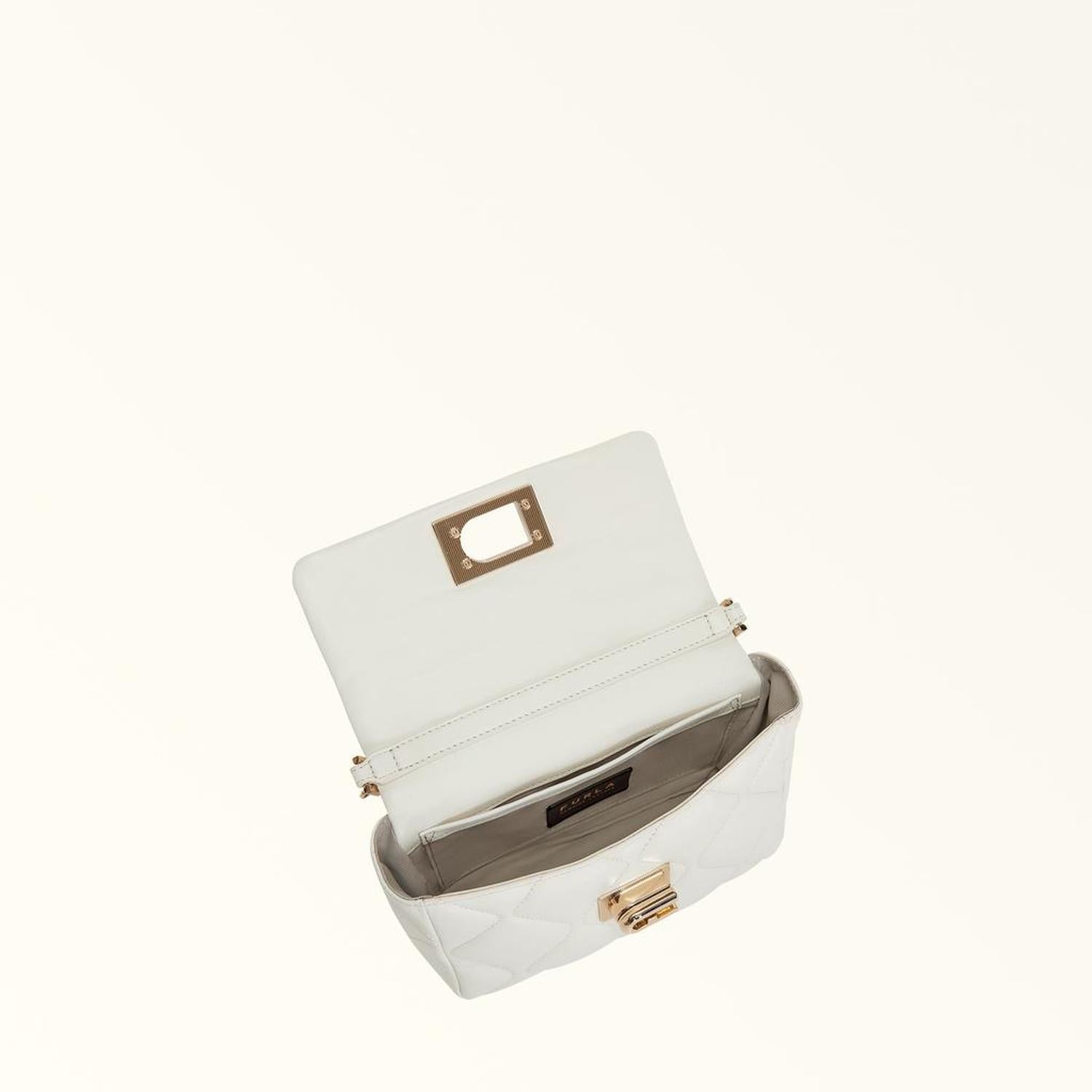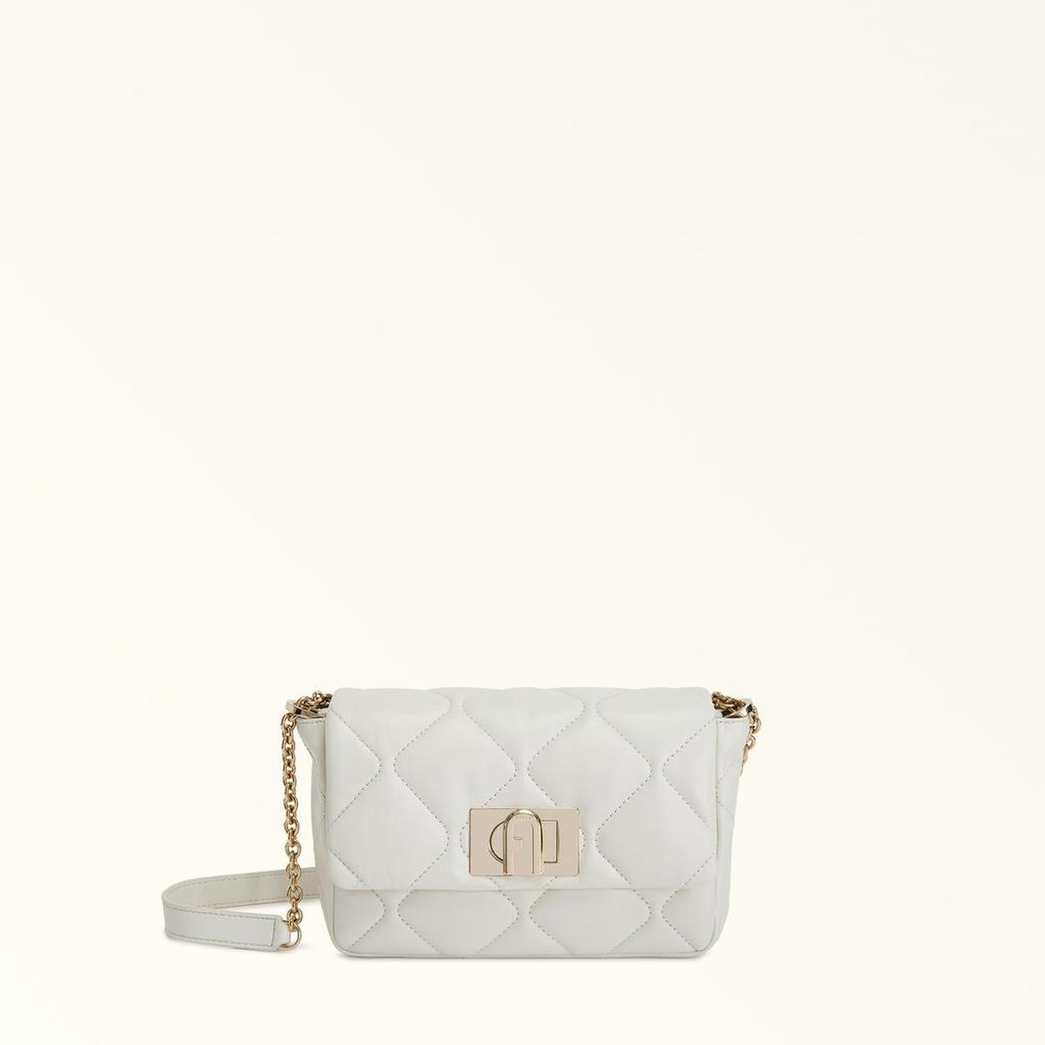 Crafted from soft puffy-effect quilted nappa leather, this elegant Furla 1927 mini bag is perfectly sized to hold your small essentials and personal effects. Wear it on the shoulder or crossbody, either way you're sure to turn heads with this stylish accessory. - Inside pocket - Open outside pocket on the back - Chain shoulder strap with leather sections - Twist closure with Arch logo