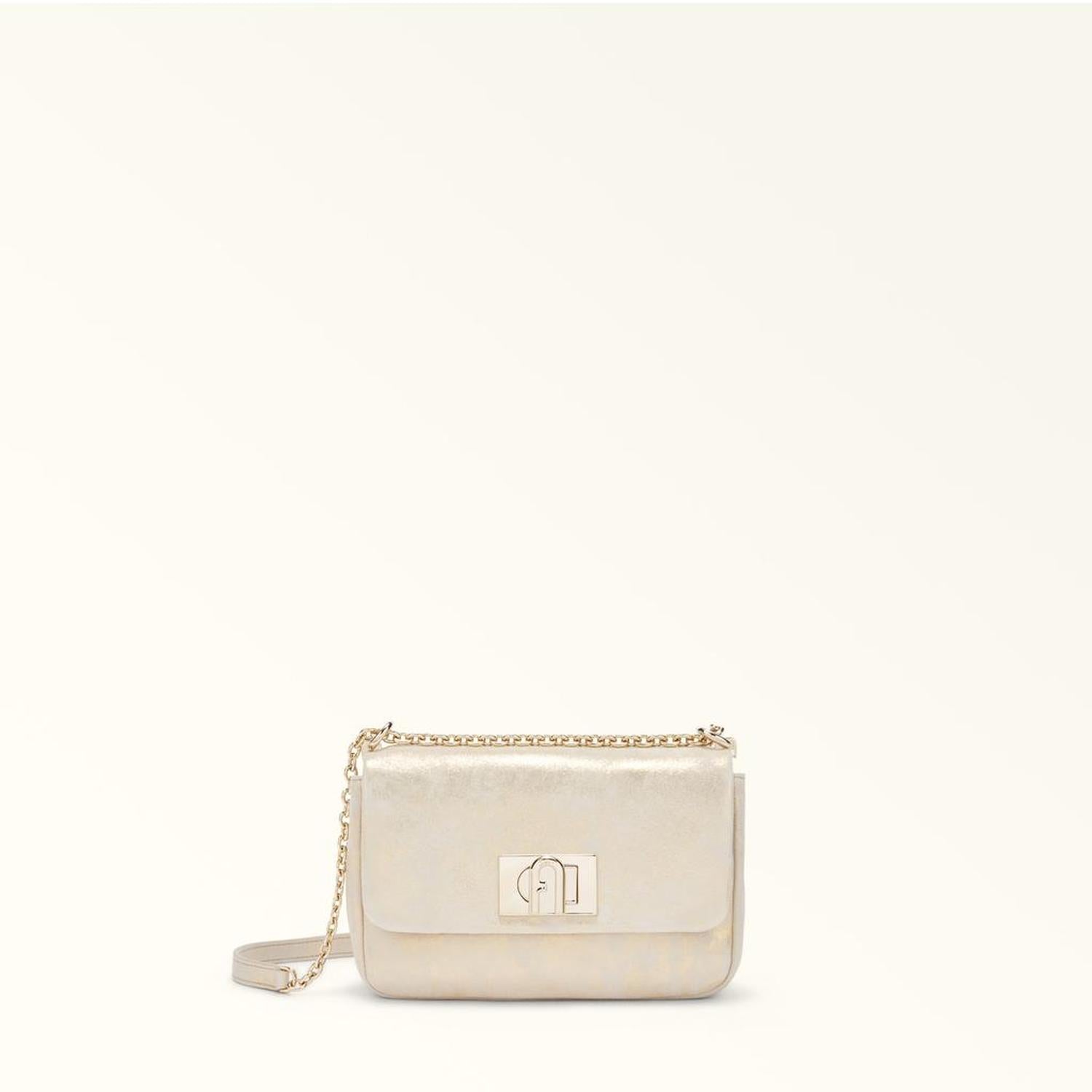 • This Furla 1927 mini bag is perfectly sized to hold your small essentials and personal effects, whether you opt for elegant daytime styling or the perfect accessory for a special evening out. Wear it on the shoulder or crossbody, either way you're sure to turn heads with this striking accessory styled in soft nappa leather with a metallic finish.