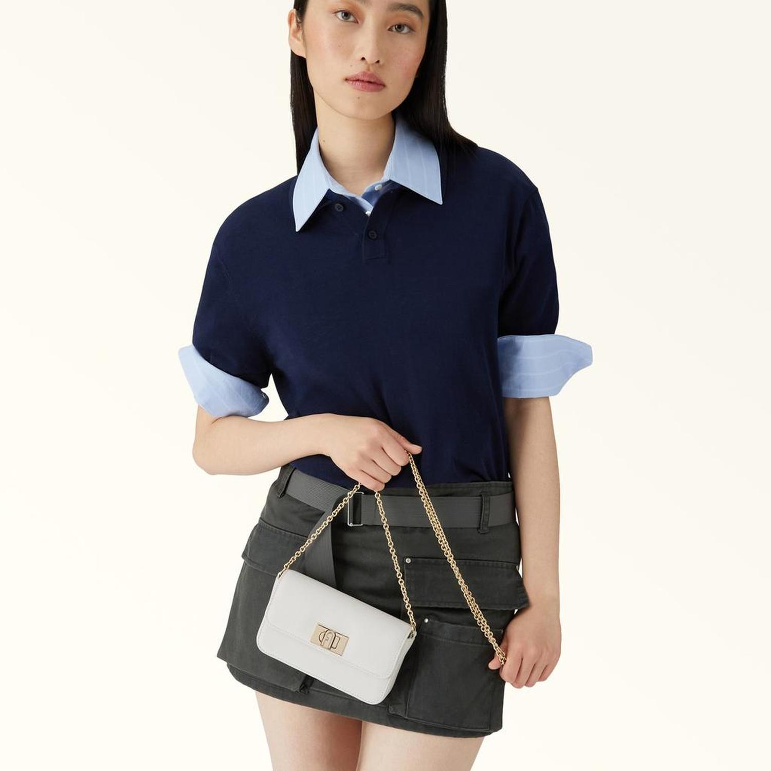 • This sweet Furla 1927 style is super compact. Made of precious leather with a printed grain texture, it features a thin chain strap for added versatility – transforming the bag into a shoulder or crossbody bag.