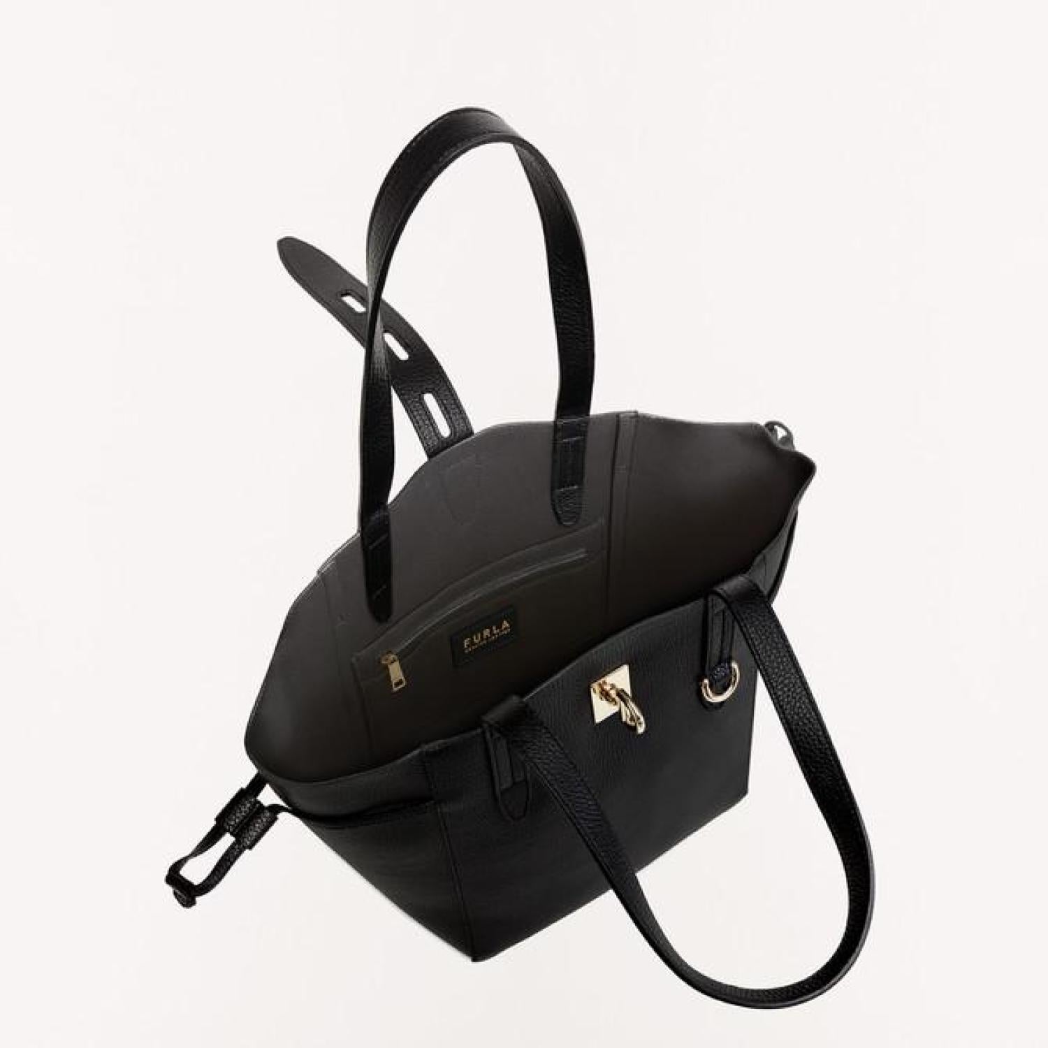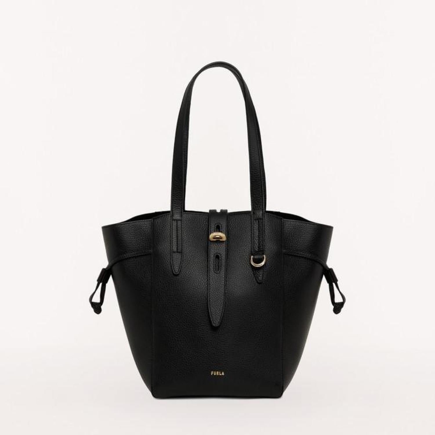 • The Furla Net tote bag in grained leather comes with handles to wear it also as a shoulder bag. It stands out for the peculiar turn lock closure with oval holes details on the leather lace. With side leather laces with drawstring for fit regulation; it ensures a perfect organization of your belongings. The accessory is enhanced by the gold punched Furla logo.