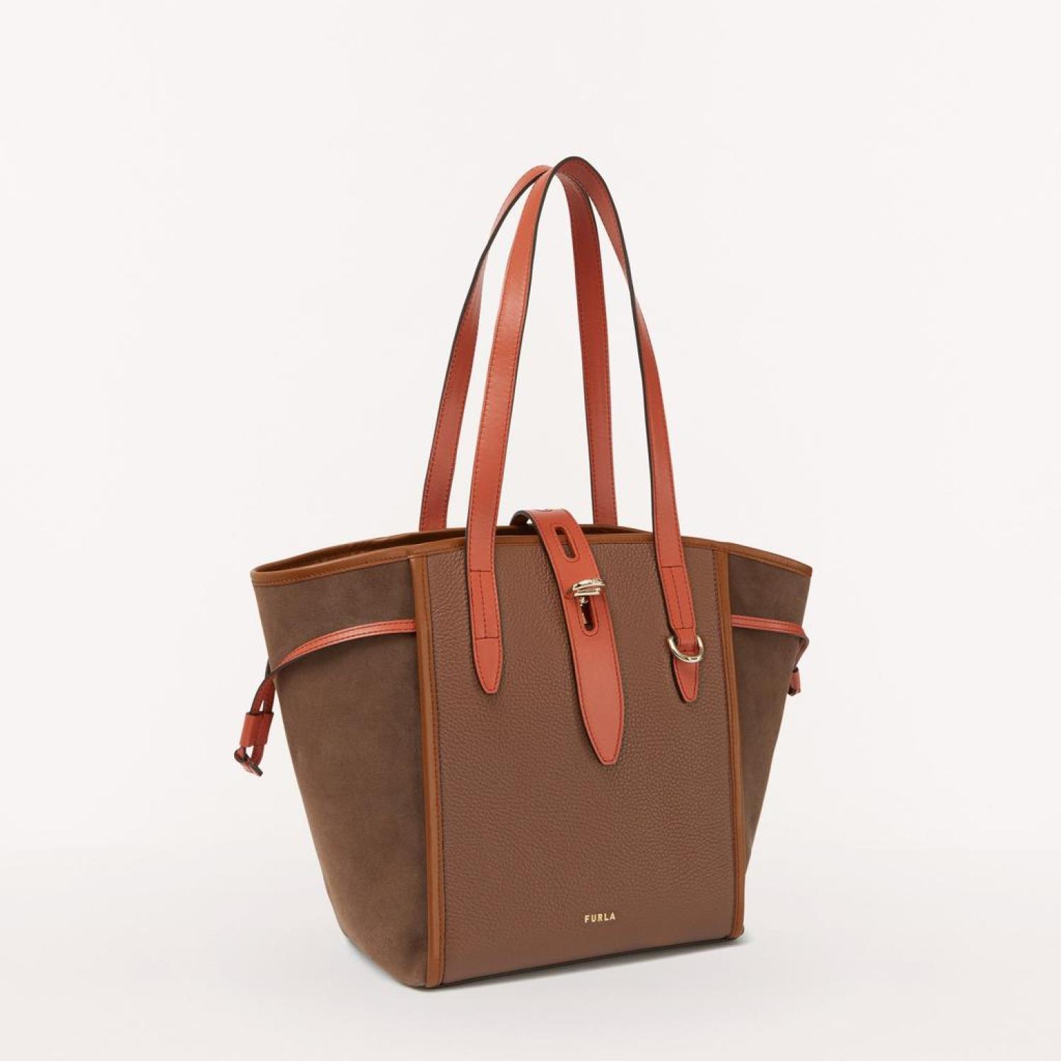 • Furla Net is a shopping bag made in a combination of grained calfskin, suede and colour-block Sorrento calfskin. The model features handles which allows it to be comfortably worn on the shoulder, and its distinctive metal twist closure makes it a unique accessory. The size of the bag can easily be adjusted using the drawstring ties on the side, allowing you to neatly store your personal belongings. The Furla logo punched on the front completes the accessory. - Inside pockets- Galvanised light gold finishes Dimensions 8.66 x 11.22 x 6.3 (w x h x d)