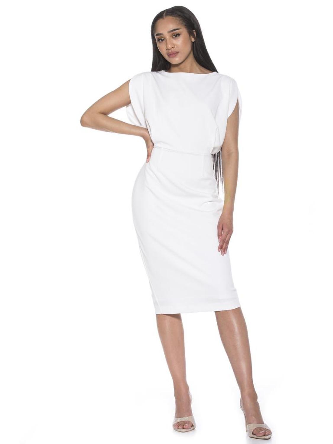 PRODUCT FEATURES Boat Neckline Draped Sleeve Cocktail Length Sheath Dress 95% Polyester, 5% Spandex Lining - 100% Polyester Machine Wash Imported Style D3993