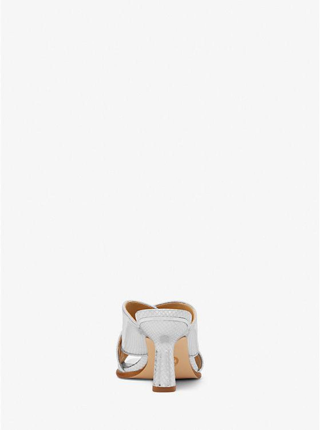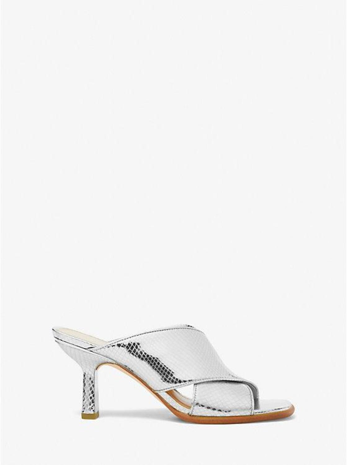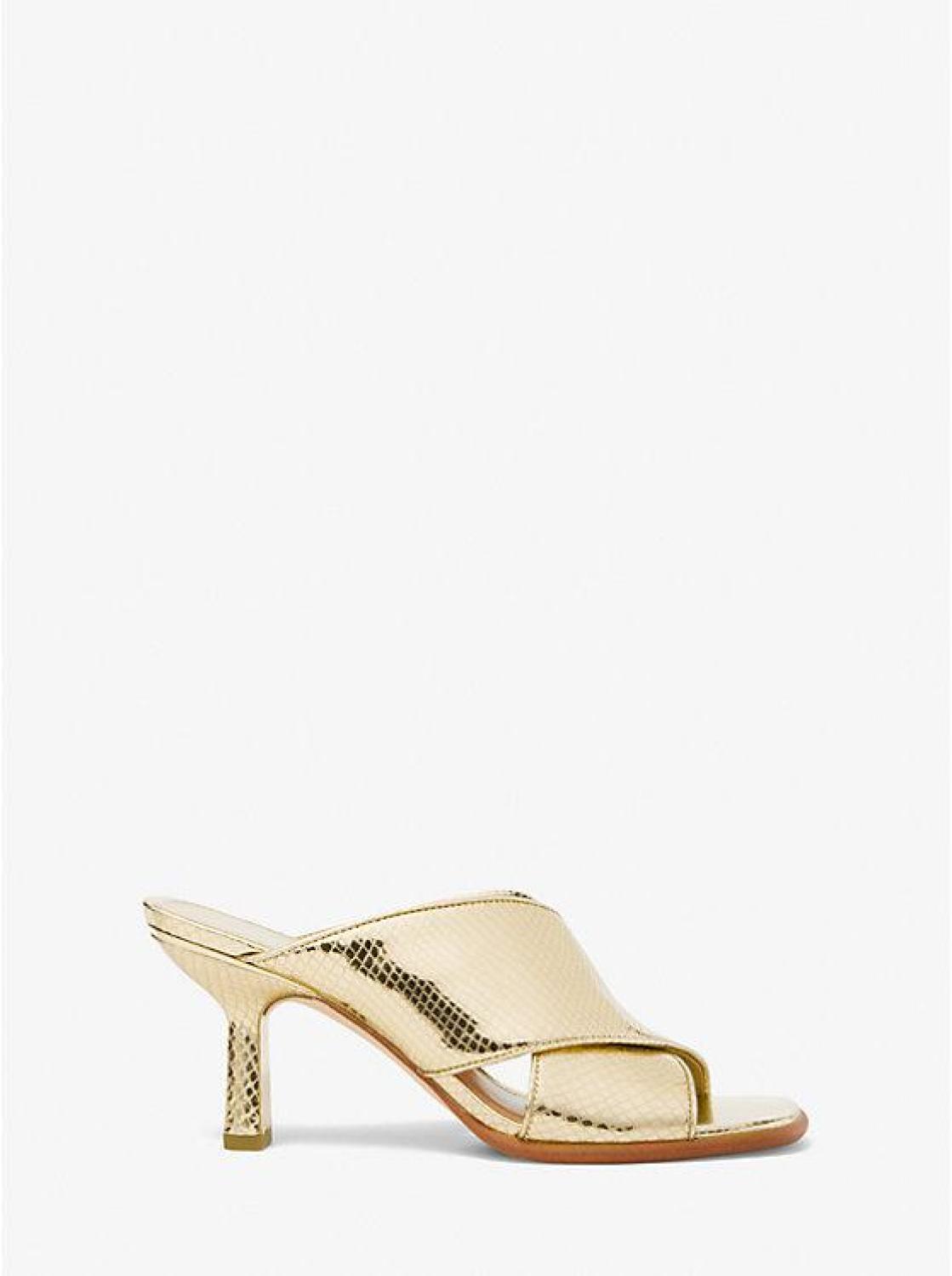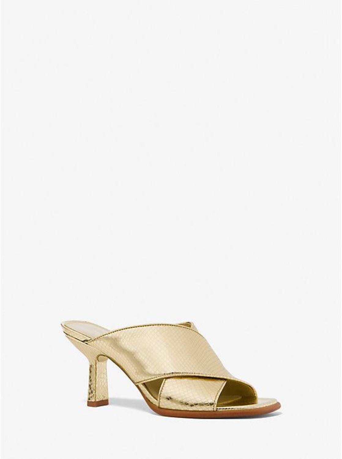 • The Gideon mules strike the perfect balance between glamour and comfort. Set on a sturdy kitten heel, this snake-embossed leather pair is defined by wide crossover straps and a sleek square toe. Keep emphasis on the metallic finish with the matching handbag.