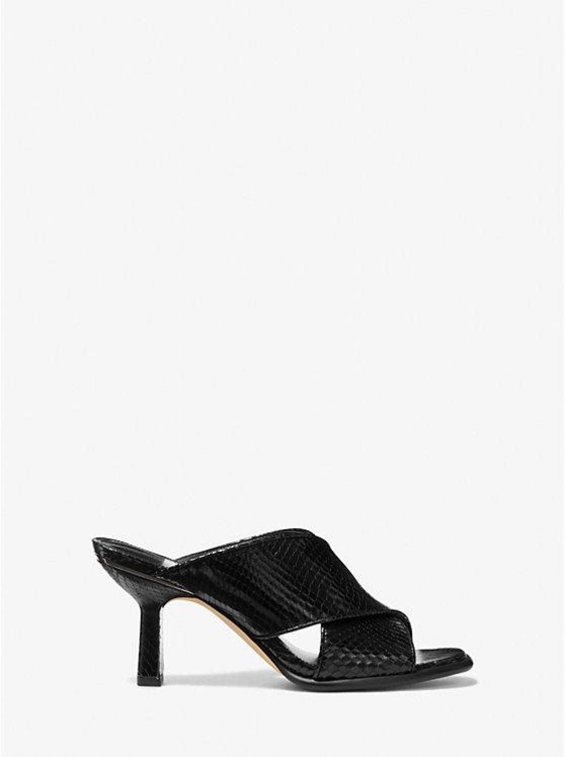 • The Gideon mules strike the perfect balance between glamour and comfort. Set on a sturdy kitten heel, this snake-embossed leather pair is defined by wide crossover straps and a sleek square toe. Keep them in focus with cropped denim and flirty skirts.