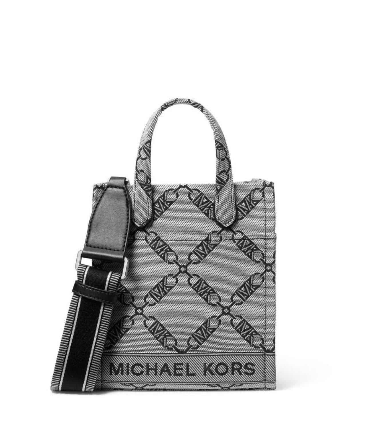 Enhance your style quotient without giving up the ease and convenience of carrying your stuff by choosing the MICHAEL Michael Kors® Gigi Extra Small North/South Shopper Tote Crossbody. Boasting a compact and elongated silhouette, the bag is constructed with cotton and polyester and adorned with a jacquard logo pattern throughout the exterior. It is equipped with a snap closure that opens into a capacious interior compartment with three card slots and is topped with dual carry handles for ease of carrying. Plus, the detachable and adjustable crossbody strap offers optimal styling options. One exterior back slip pocket. Polyester lining. Imported. Please note, the hardware color and interior lining may differ from the color shown in the photo. Measurements: Bottom Width: 6 3/4 in Depth: 3 in Height: 8 in
