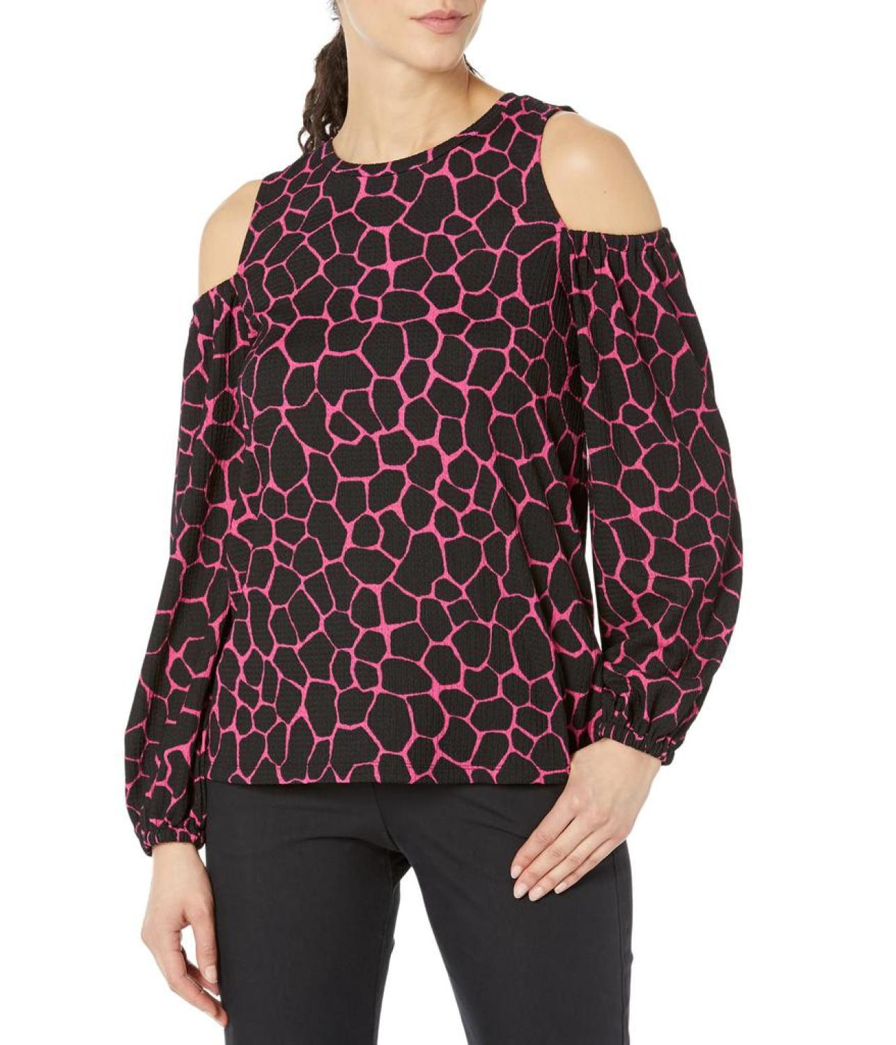 • Look and feel gorgeous in the giraffe-based print of the MICHAEL Michael Kors® Giraffe Cold-Shoulder Blouse.