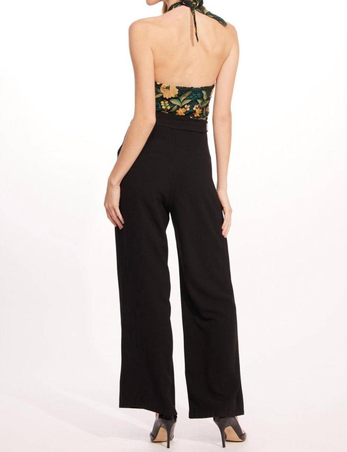 The perfect outfit choice when you you need something quick to throw on and still want to look efforlessly cool.The embroidered floral fabric on a V neck jumpsuit featuring pockets and a self tie at the waist provides an elevated all-in-one look that is perfect for your occasion! Surplice V neck. Halter tie with open back. Side pockets. Self tie at the waist