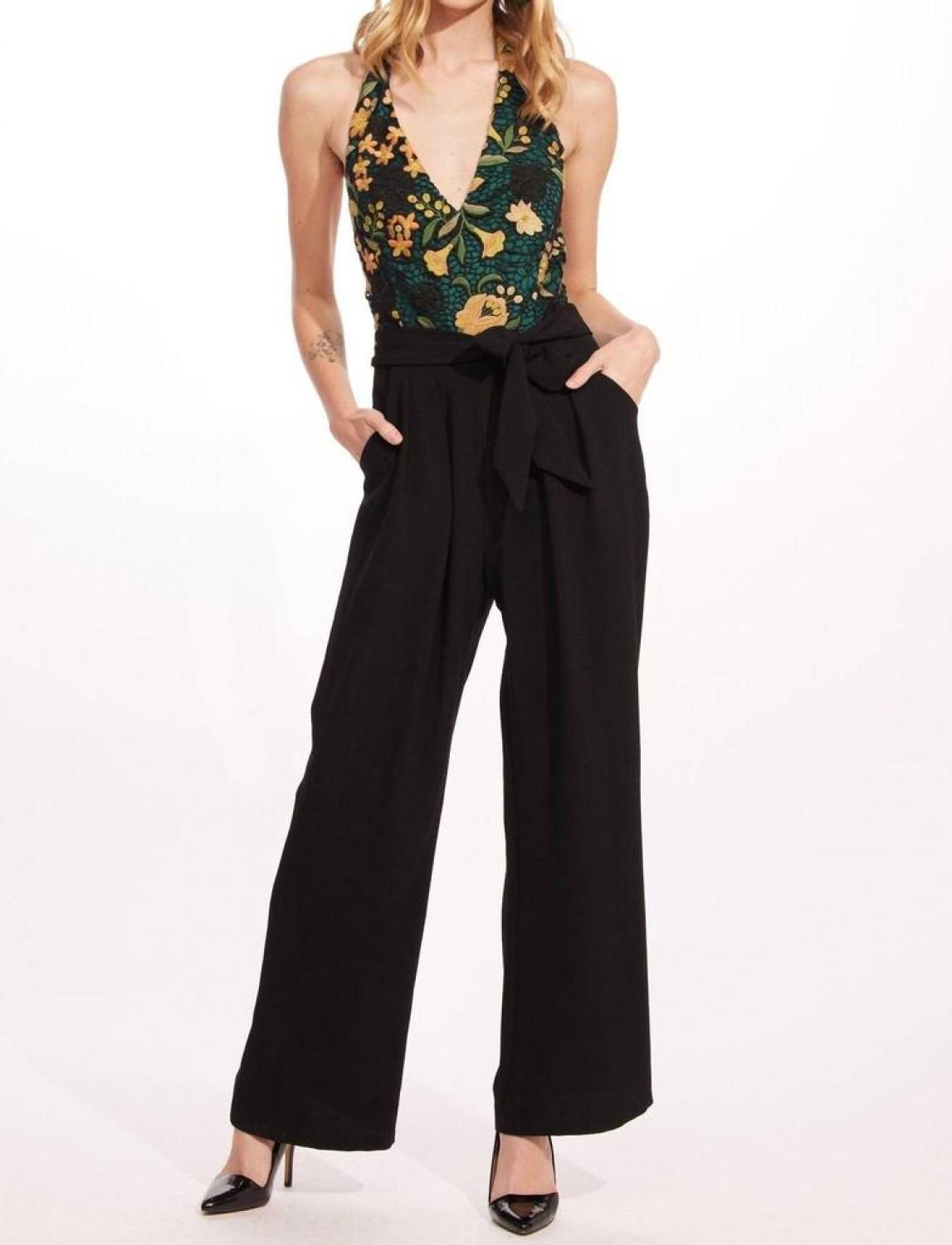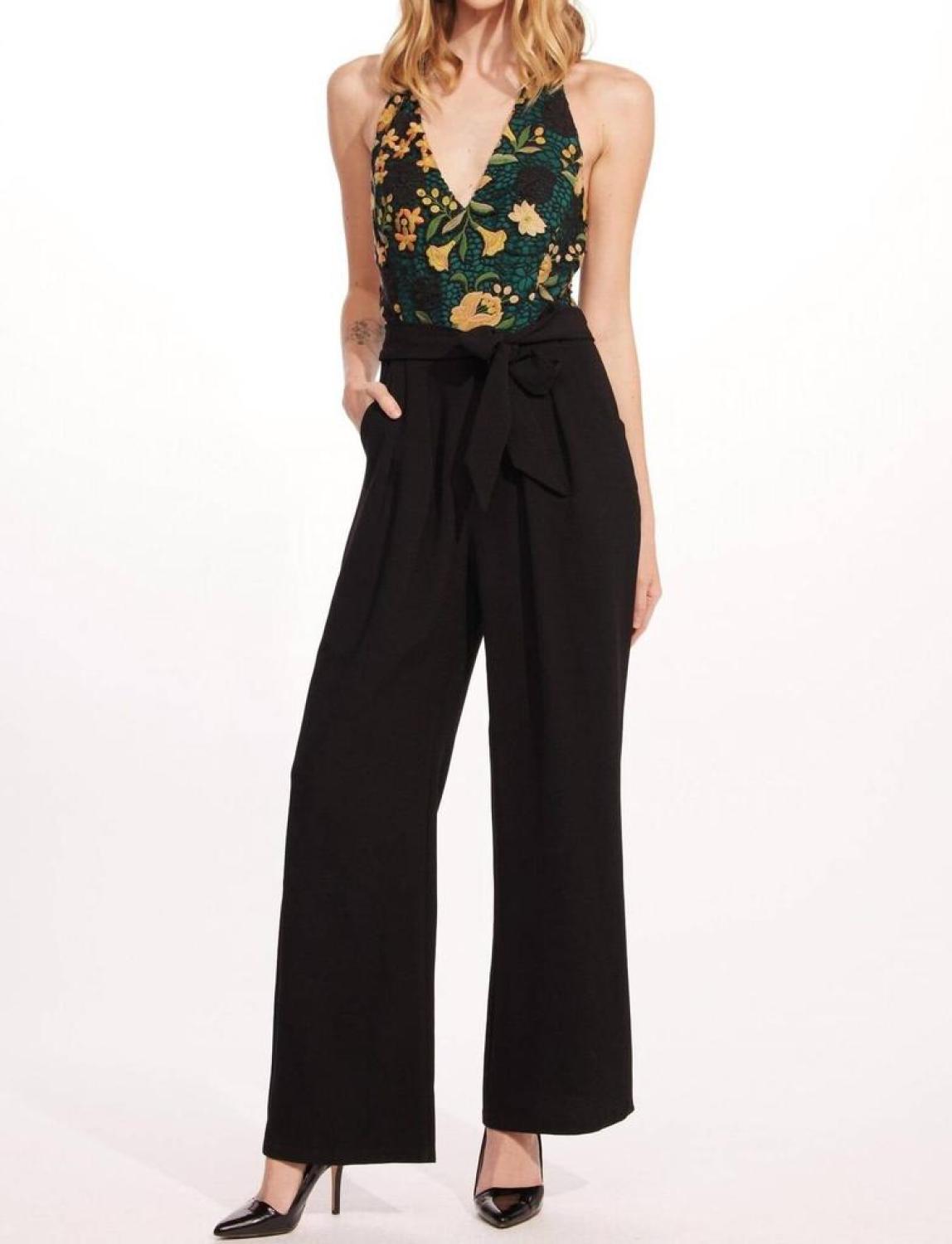 • The perfect outfit choice when you you need something quick to throw on and still want to look efforlessly cool.The embroidered floral fabric on a V neck jumpsuit featuring pockets and a self tie at the waist provides an elevated all-in-one look that is perfect for your occasion! Surplice V neck. Halter tie with open back. Side pockets. Self tie at the waist