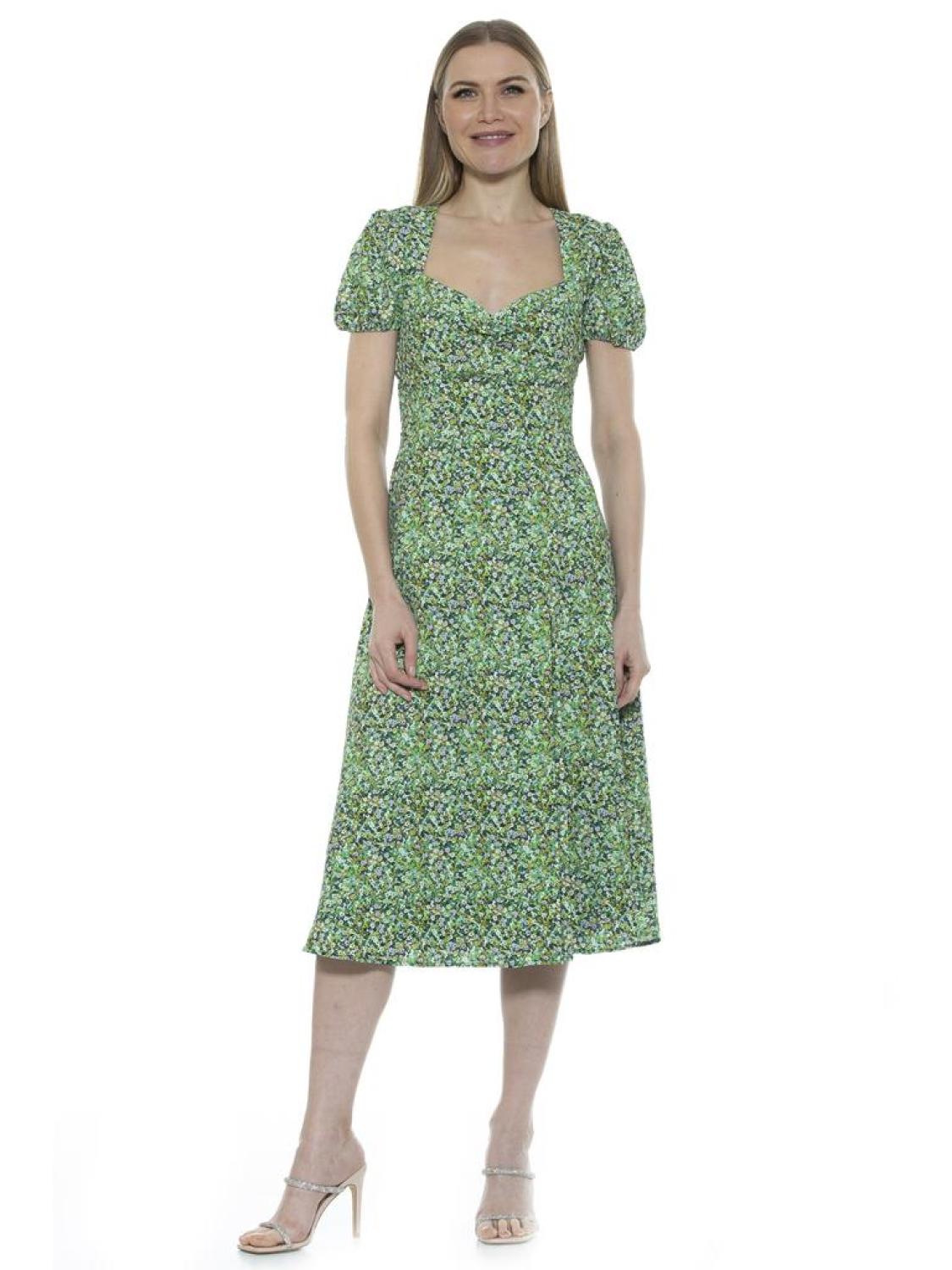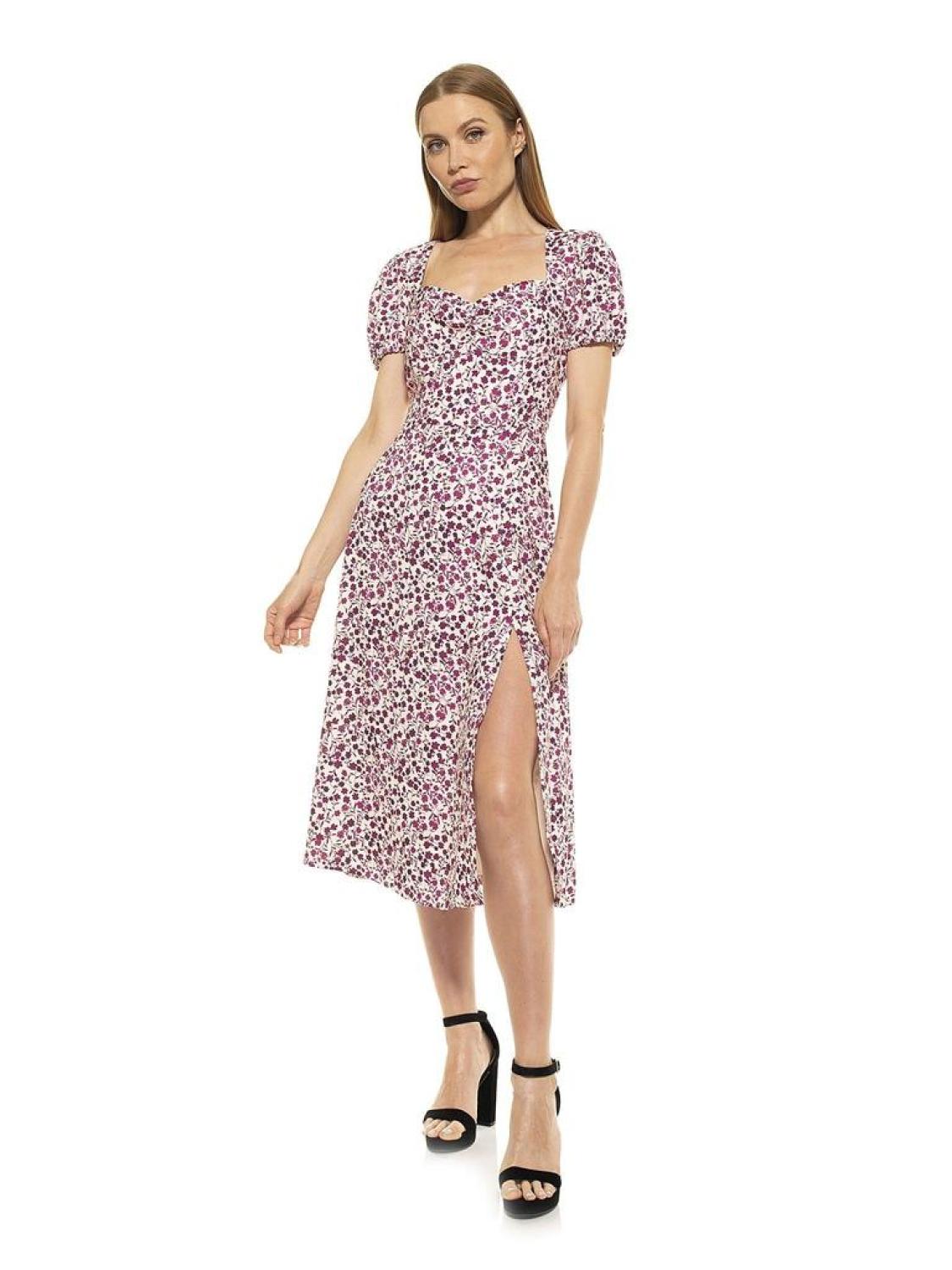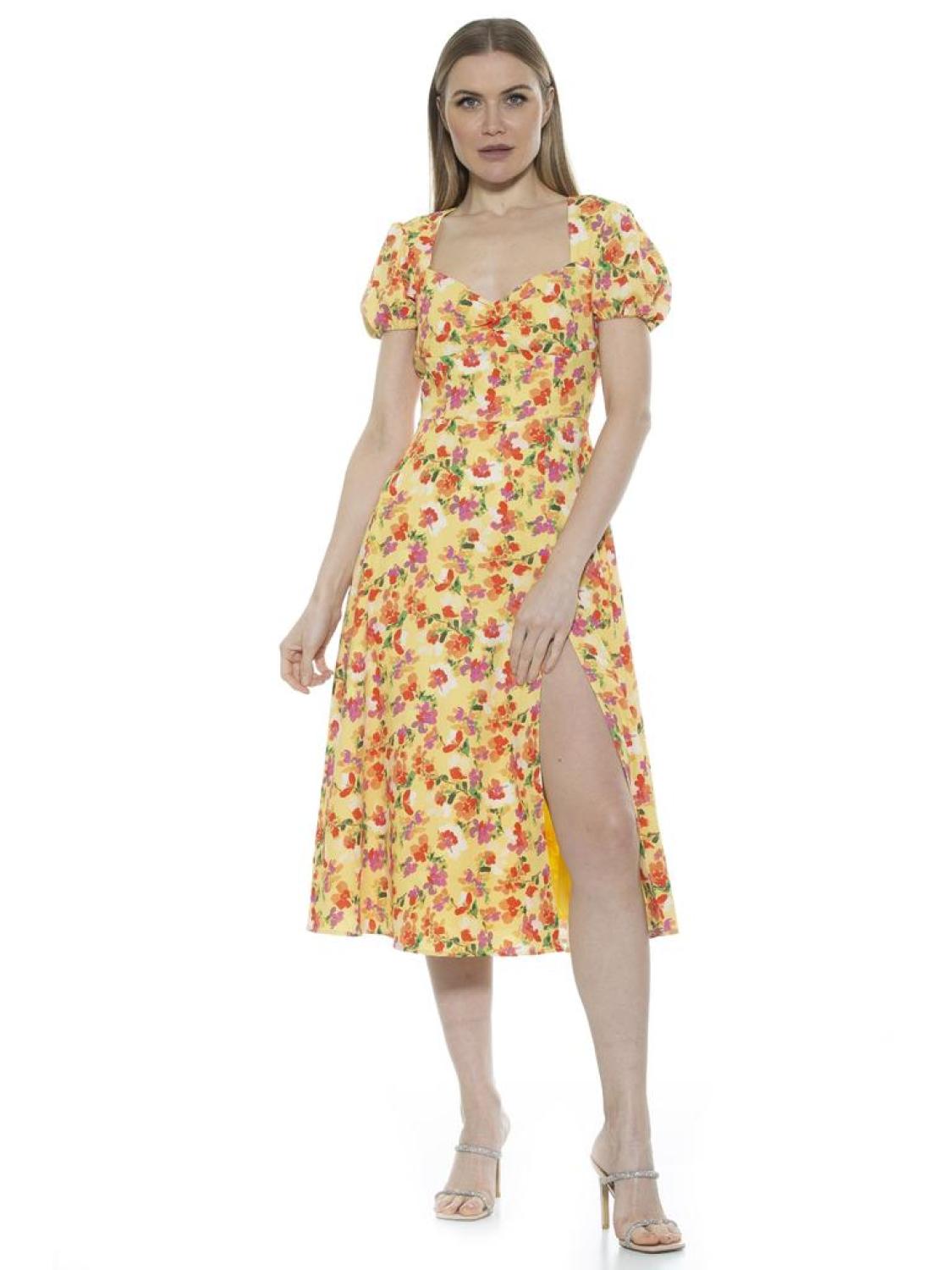 PRODUCT FEATURESSweetheart necklineShort cap sleevesAll-over exclusive print?�High front slit?�Midi Dress100% PolyesterLined - 97% Polyester, 3% SpandexMachine Wash?�ImportedStyle D3645