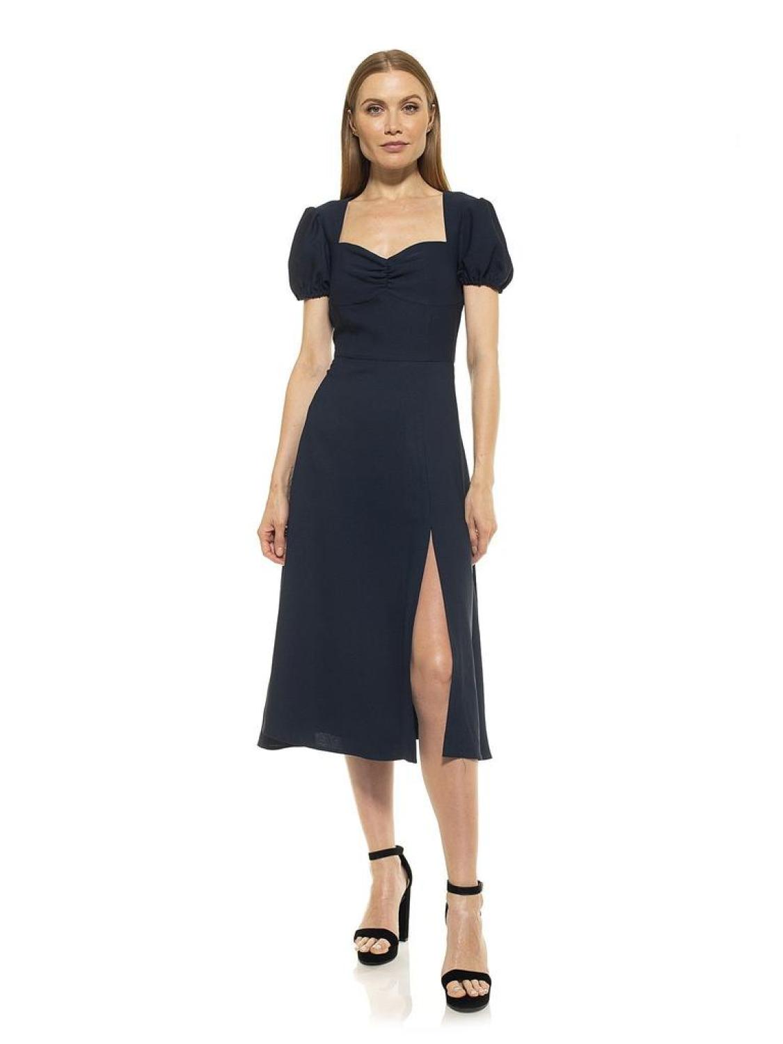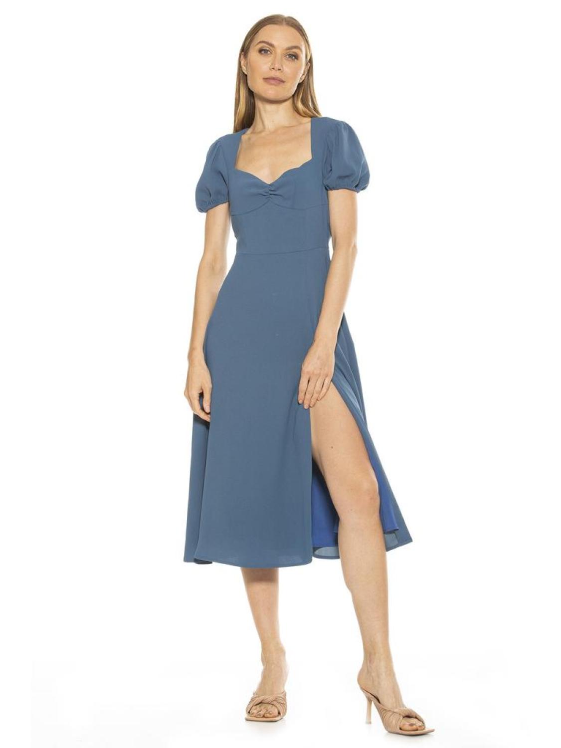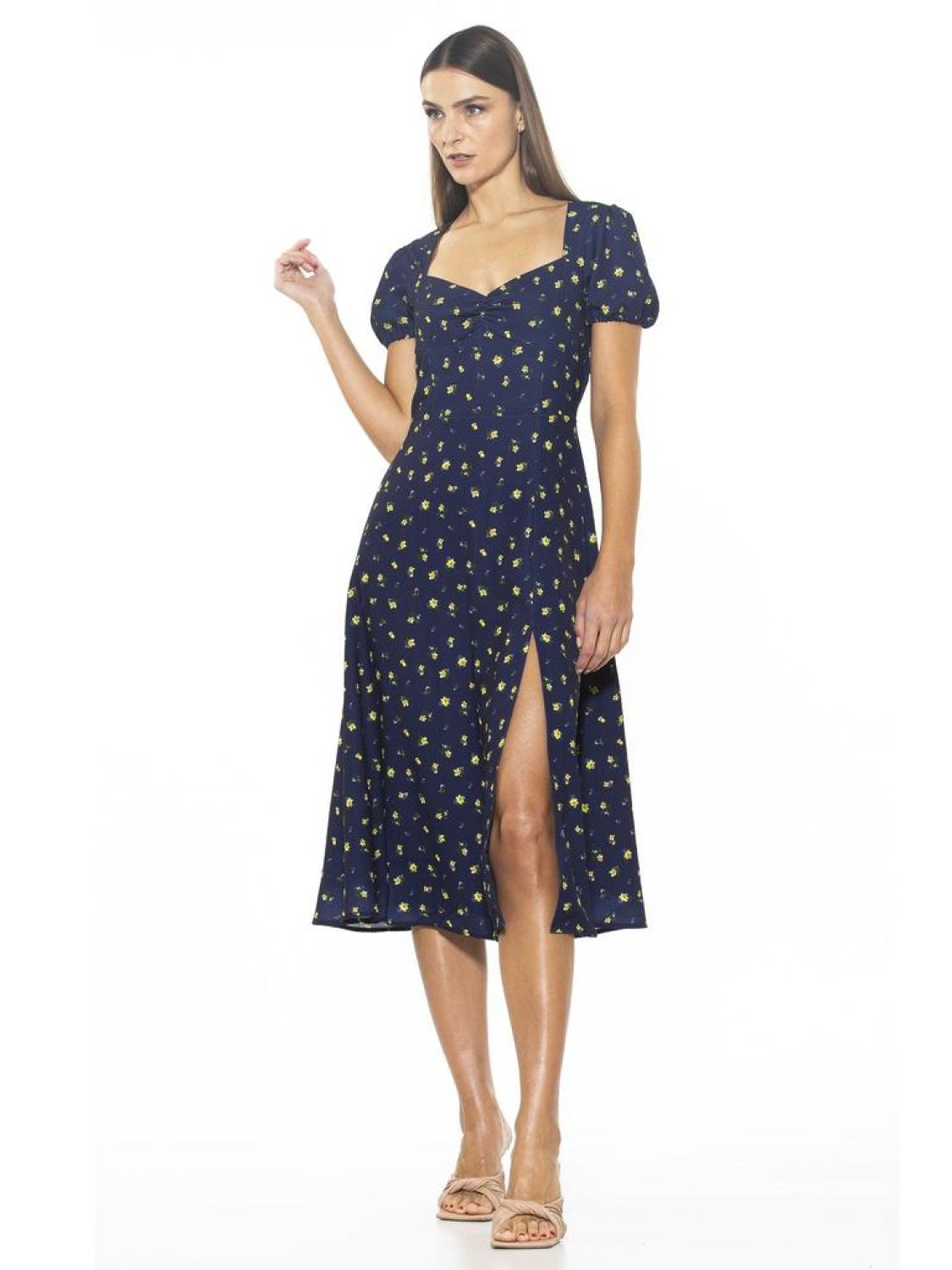 PRODUCT FEATURESSweetheart necklineShort cap sleevesAll-over exclusive print?�High front slit?�Midi Dress100% PolyesterLined - 97% Polyester, 3% SpandexMachine Wash?�ImportedStyle D3645