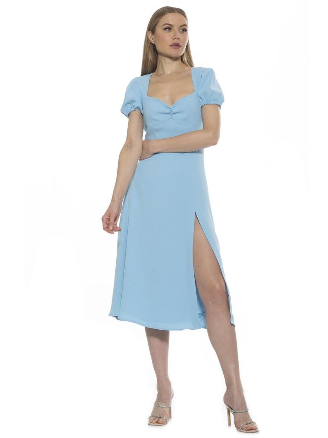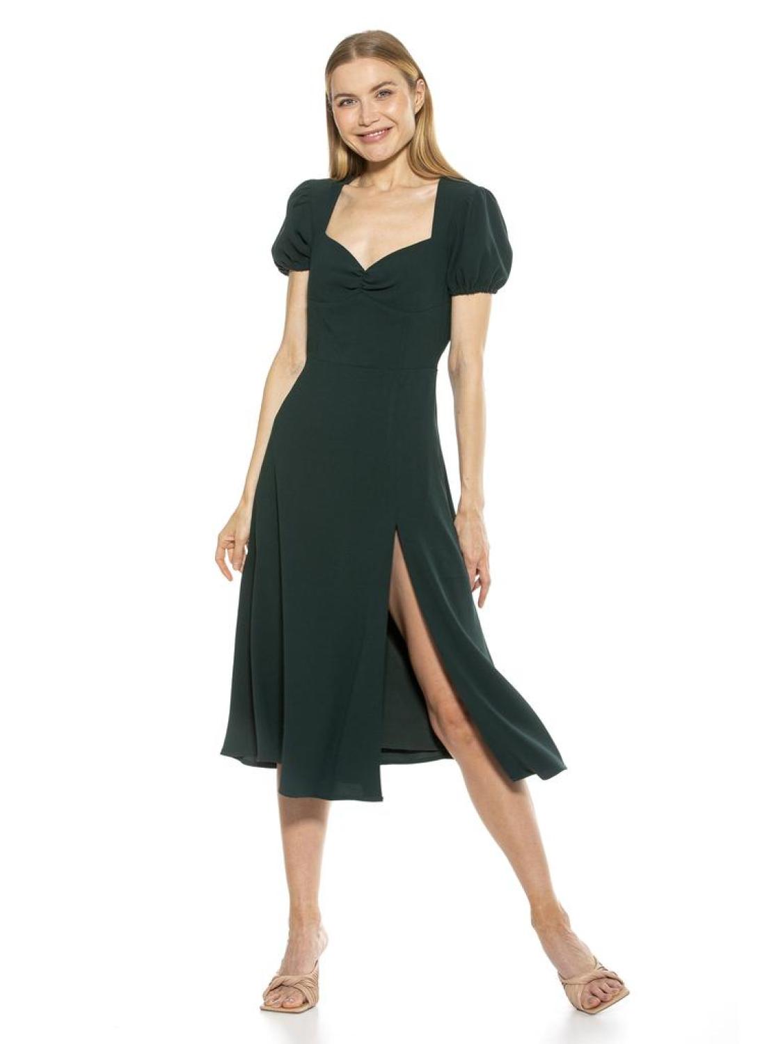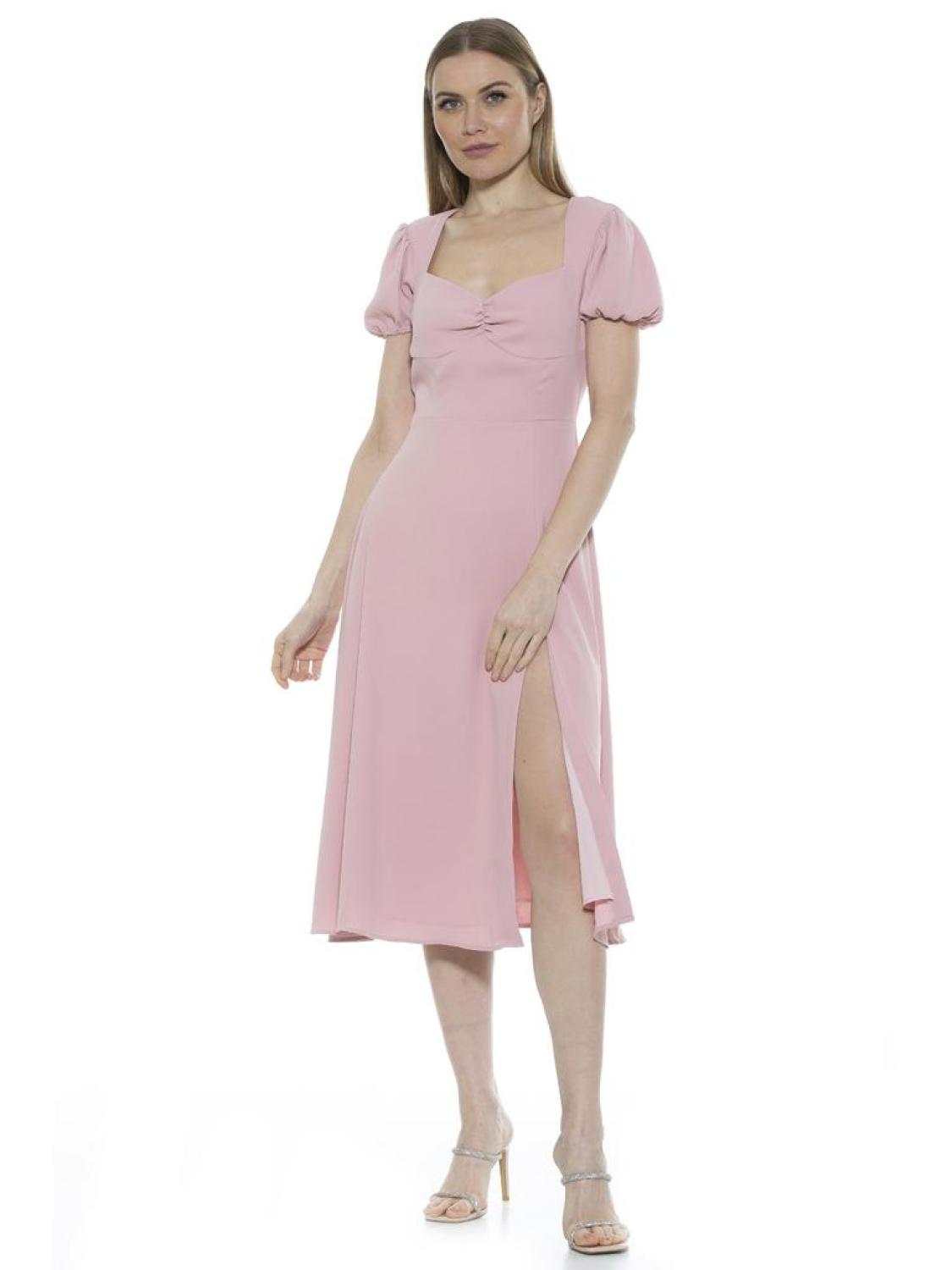 • PRODUCT FEATURESSweetheart necklineShort cap sleevesAll-over exclusive print?�High front slit?�Midi Dress100% PolyesterLined - 97% Polyester, 3% SpandexMachine Wash?�ImportedStyle D3645