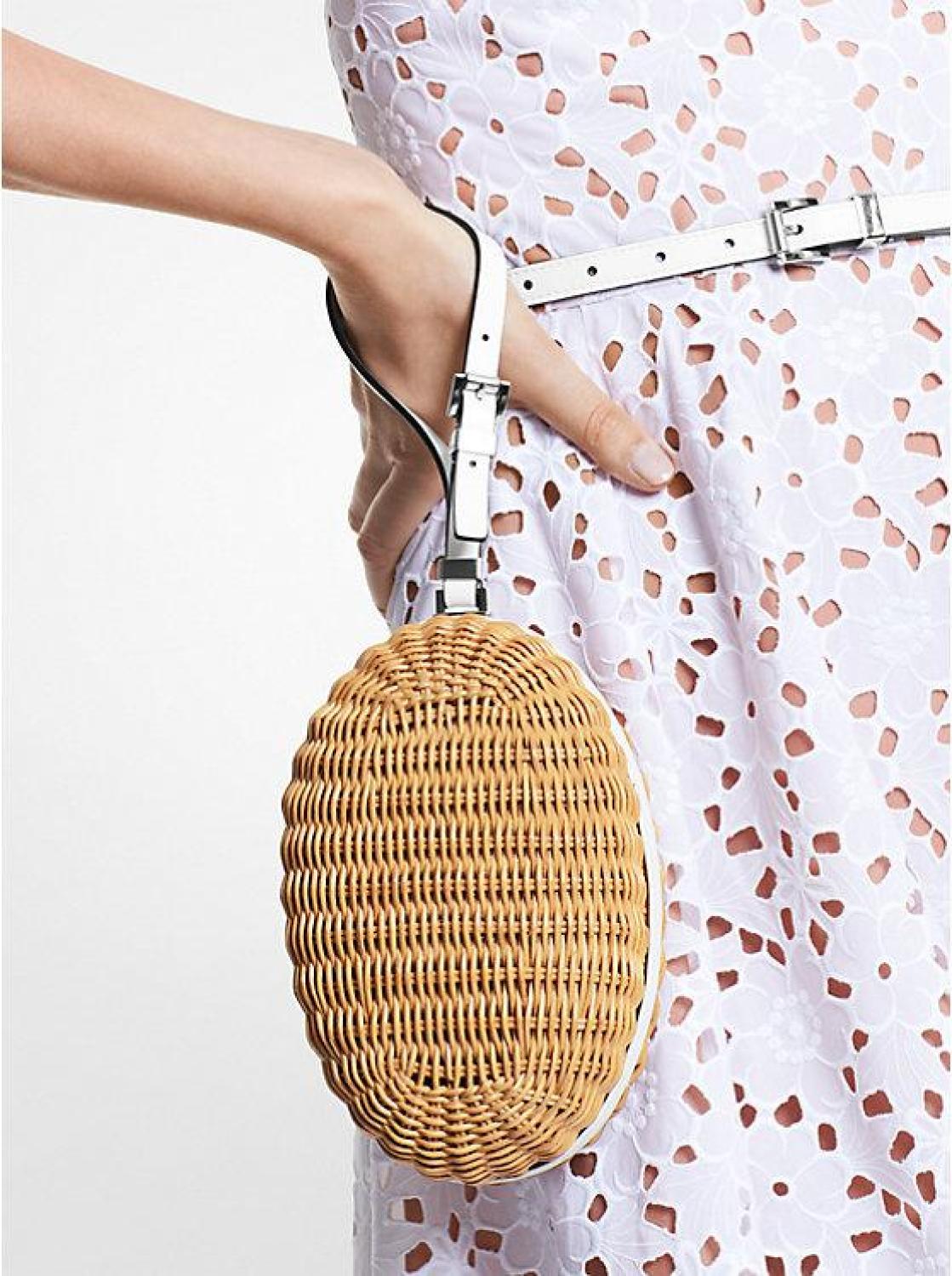 • A striking accessory from the Spring/Summer ’22 runway, our Gramercy minaudie re will add instant luxury to any look. Its woven rattan exterior is elevated by a smooth leather strap and polished hardware for a glamorous-yet-understated effect. Featuring a suede-lined interior, it looks especially chic alongside sharp tailoring. Made in Italy.