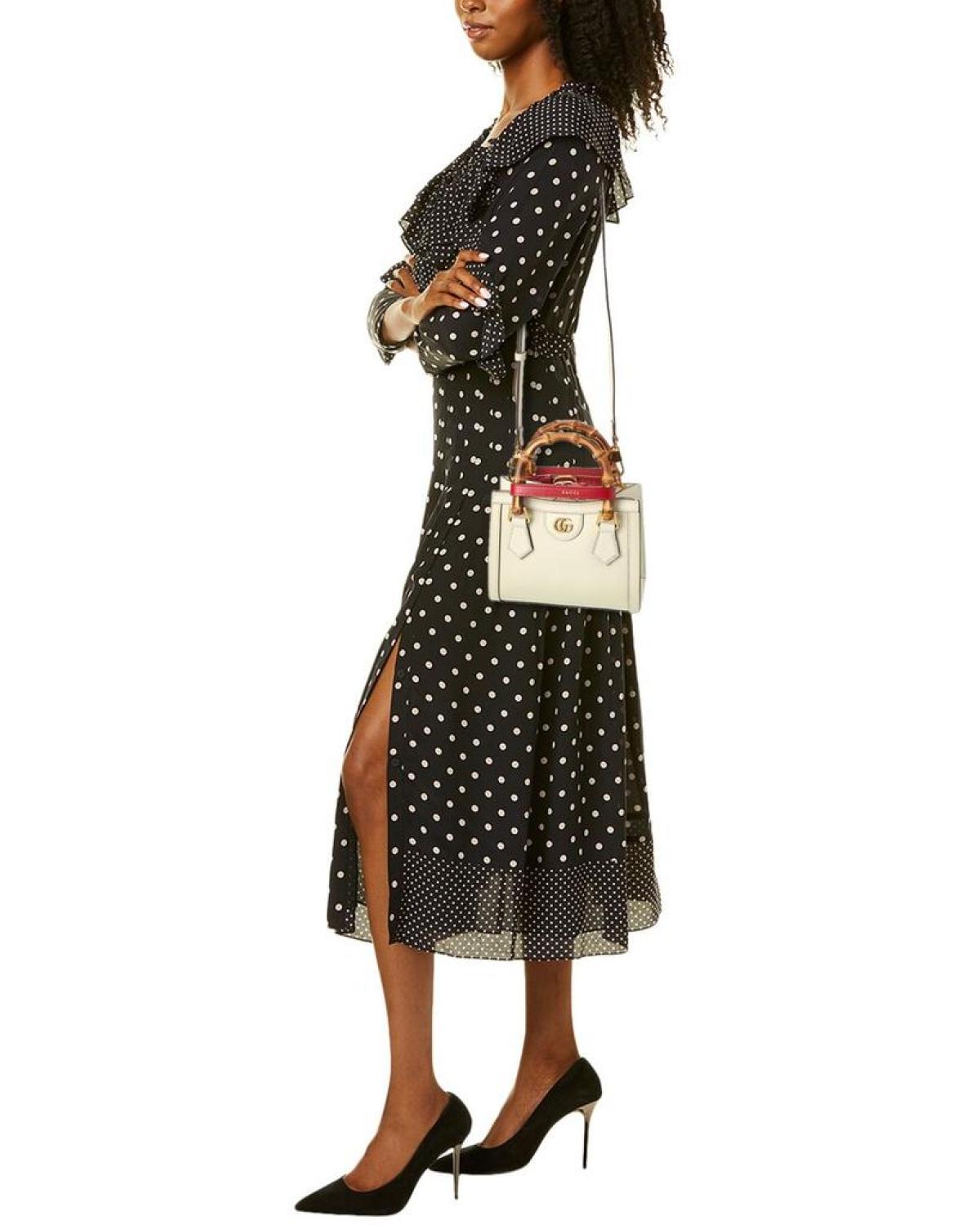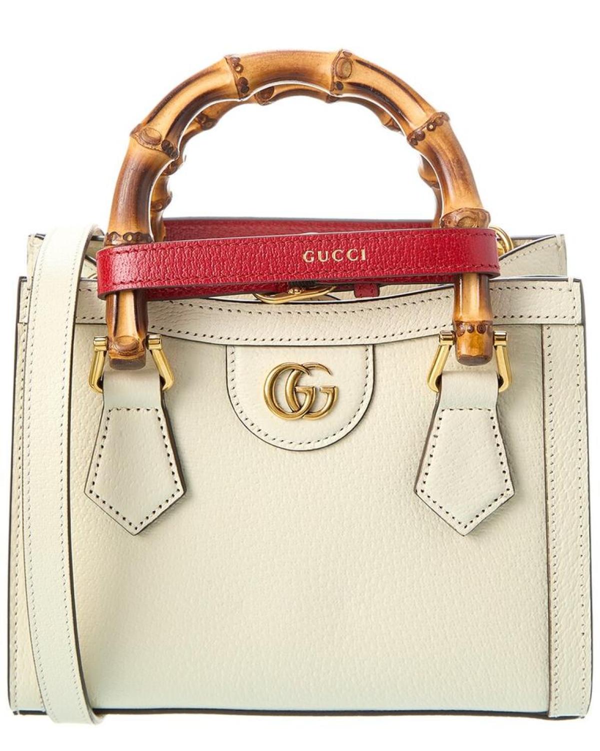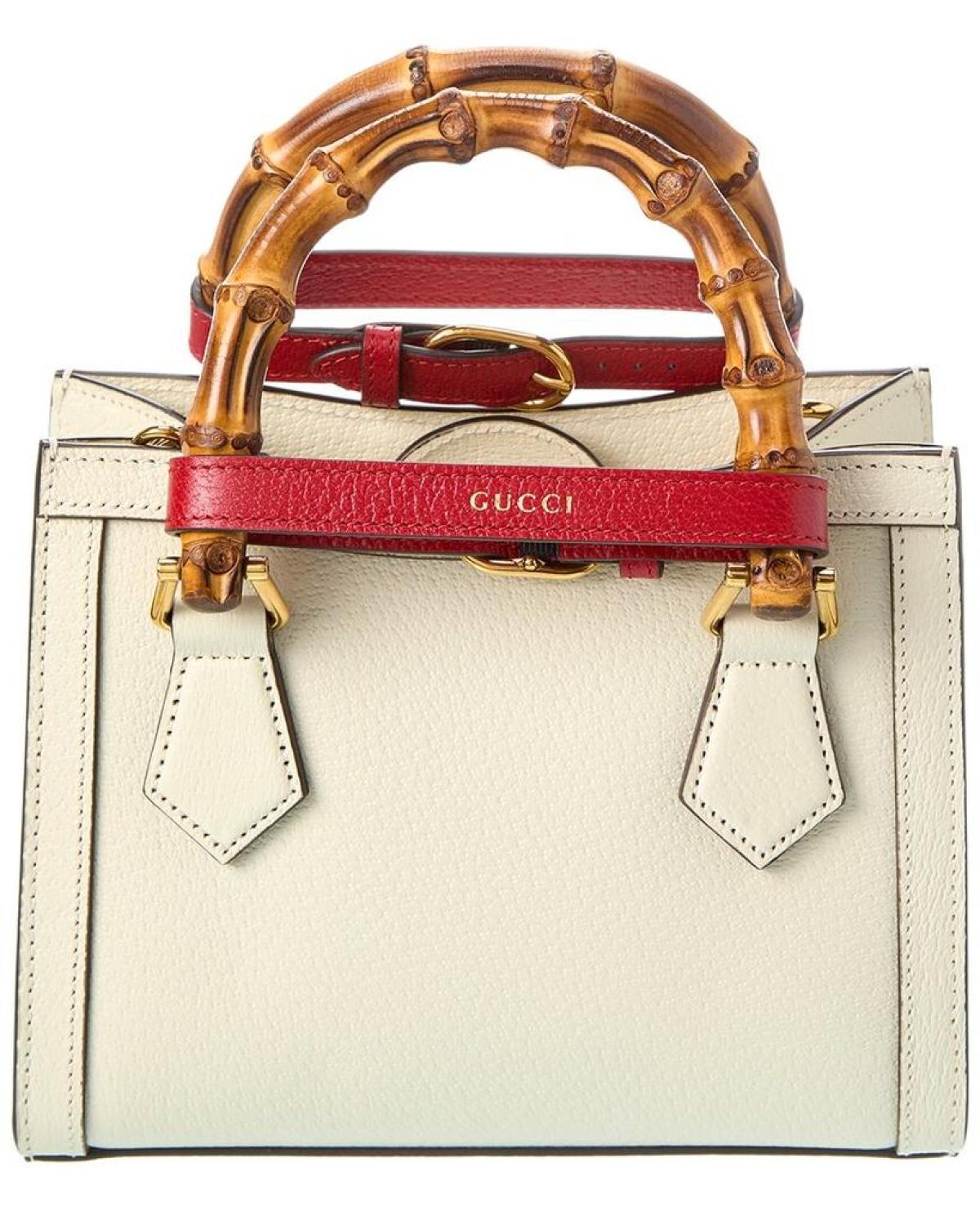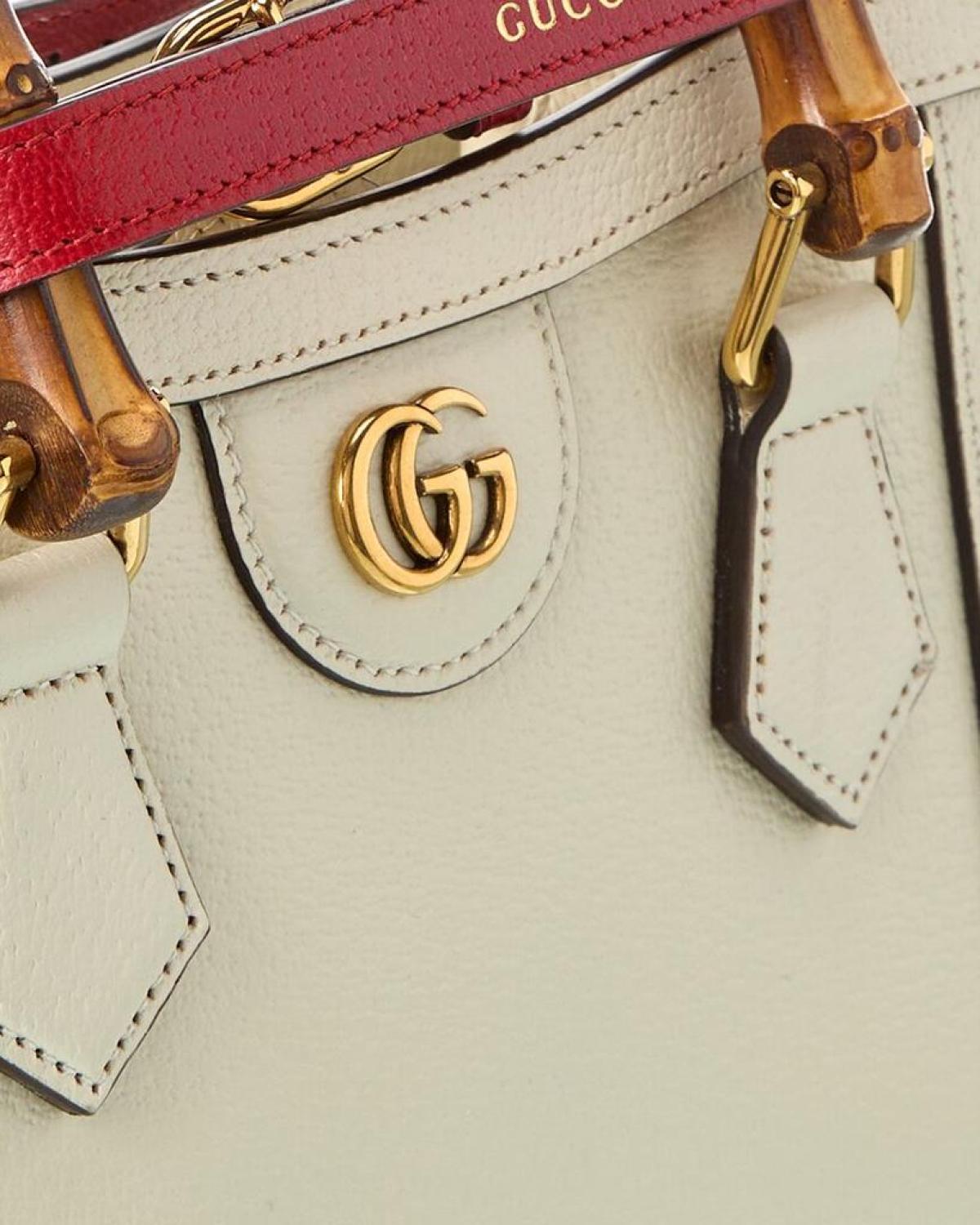• Elevate your style with the Gucci Diana Mini Leather Tote. This exquisite handbag, made in Italy, showcases the iconic red and white leather design with light fine gold hardware and the interlocking G logo. The bamboo top handles add a touch of sophistication, while the interchangeable shoulder straps provide versatility. The microfiber lining and interior pocket offer functional storage space. Measuring 8 inches wide by 6.3 inches high by 4 inches deep, this tote is perfect for everyday use. The magnetic closure ensures your essentials stay secure. Add a touch of Italian luxury to your wardrobe with this Gucci tote. Please note that slight variations may occur in measurements due to handcrafted manufacturing. All our products are guaranteed to be 100% genuine.