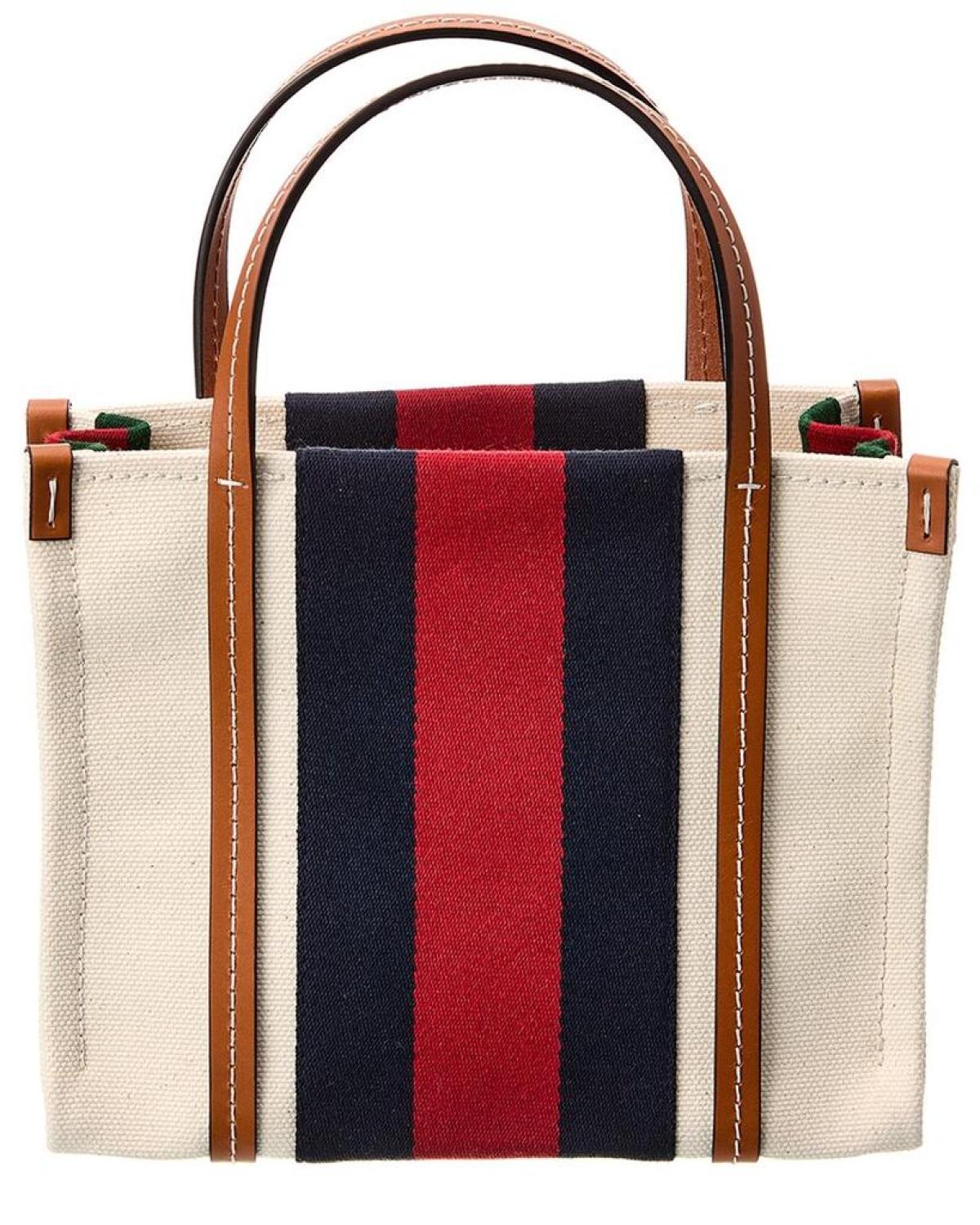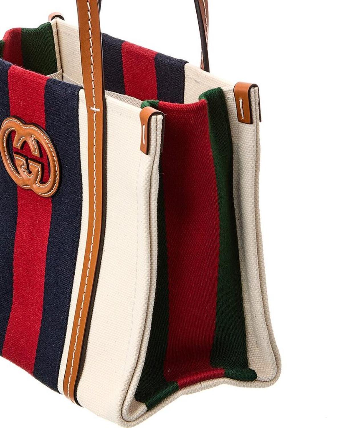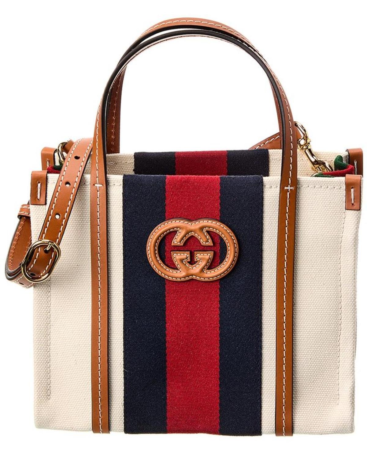 • Introducing the Gucci Interlocking G Mini Canvas & Leather Tote, a stylish and versatile handbag that embodies Italian luxury at its finest. Crafted from exquisite white canvas and brown leather, this tote features light fine gold hardware and a distinctive leather interlocking G logo accent. The iconic red and blue signature webbing stripe adds a touch of sophistication, making this a coveted accessory for fashion-forward women.Designed with meticulous attention to detail, the interior of this tote boasts a canvas lining and a convenient zippered pocket. Perfect for organizing your essentials, this pocket ensures everything stays in its place while you're on the go. With dimensions of 9 inches wide, 7 inches high, and 4.5 inches deep, this mini tote is compact yet spacious enough to carry all your daily essentials.The top handles offer a comfortable 4-inch drop, allowing you to carry it effortlessly in your hand or on your forearm. For added versatility, the adjustable and removable shoulder strap provides a generous 24-inch drop, allowing you to wear it crossbody or over the shoulder.Featuring an open top design, this Gucci tote provides easy access to your belongings, ensuring convenience and functionality. It's important to note that all measurements were taken by hand and are approximate, so slight variations may occur.Rest assured, this Gucci Interlocking G Mini Canvas & Leather Tote is 100% genuine. While in some cases we purchase merchandise from trusted independent suppliers rather than directly from the brand owner, we proudly stand by the authenticity of every product sold on our site.Elevate your style with the Gucci Interlocking G Mini Canvas & Leather Tote and experience the true essence of Italian luxury redefined.