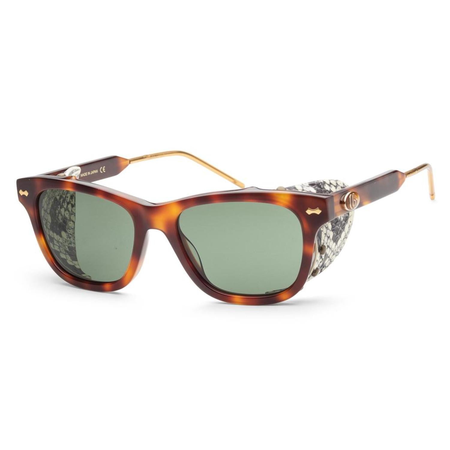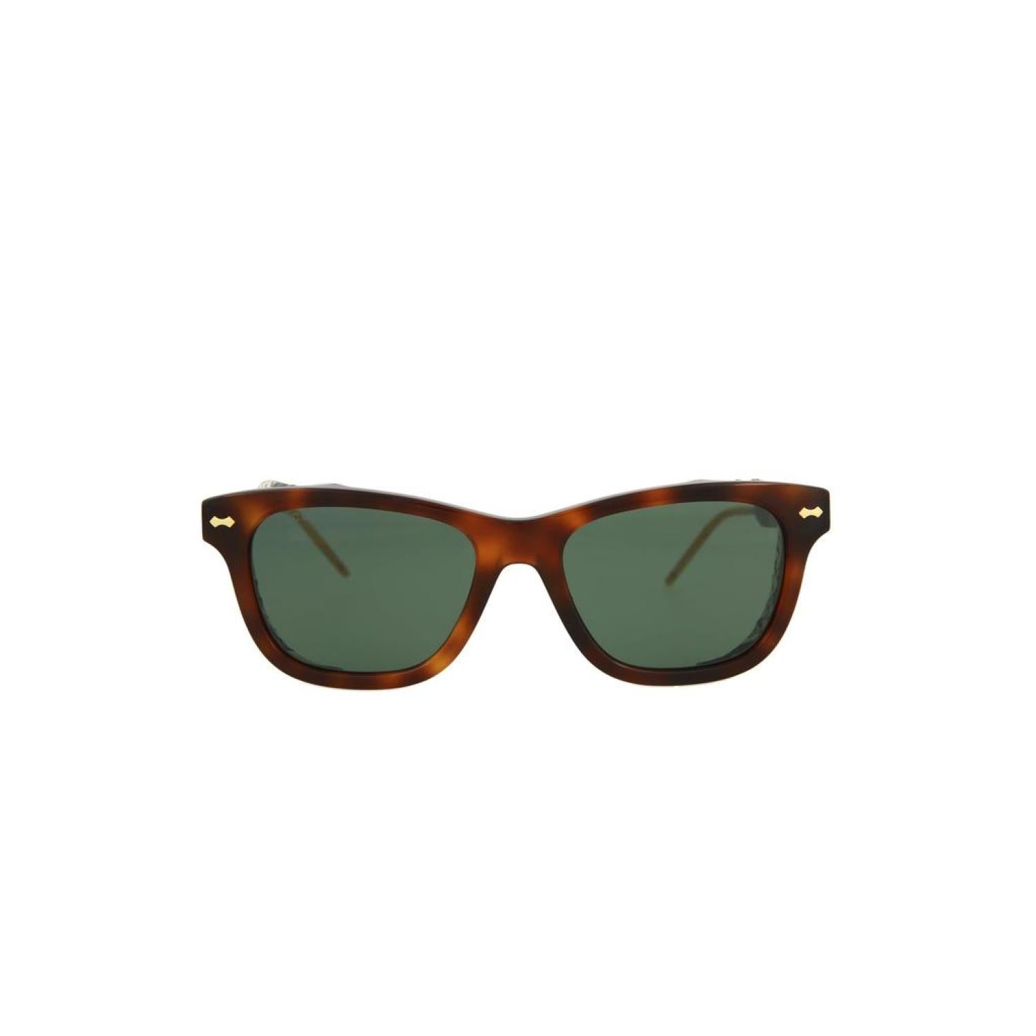 The Gucci men's Sunglasses measure at a 54 mm lens width, 19 mm bridge width, and 145 mm arem length. The frame is rectangular-shaped havana havana. The lens is 100% UV protection non-polarized green. (GG0671S-30008586002)