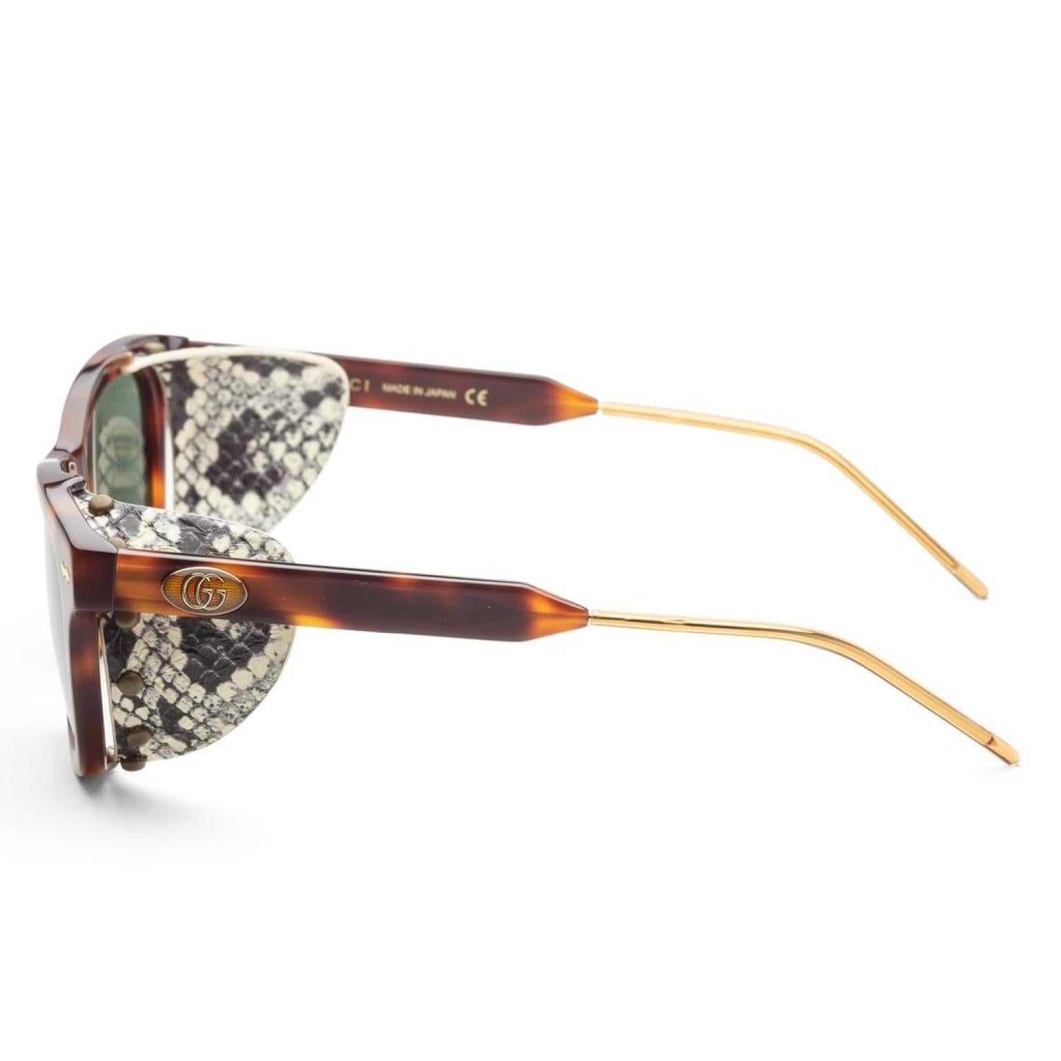 • The Gucci men's Sunglasses measure at a 54 mm lens width, 19 mm bridge width, and 145 mm arem length. The frame is rectangular-shaped havana havana. The lens is 100% UV protection non-polarized green. (GG0671S-30008586002)