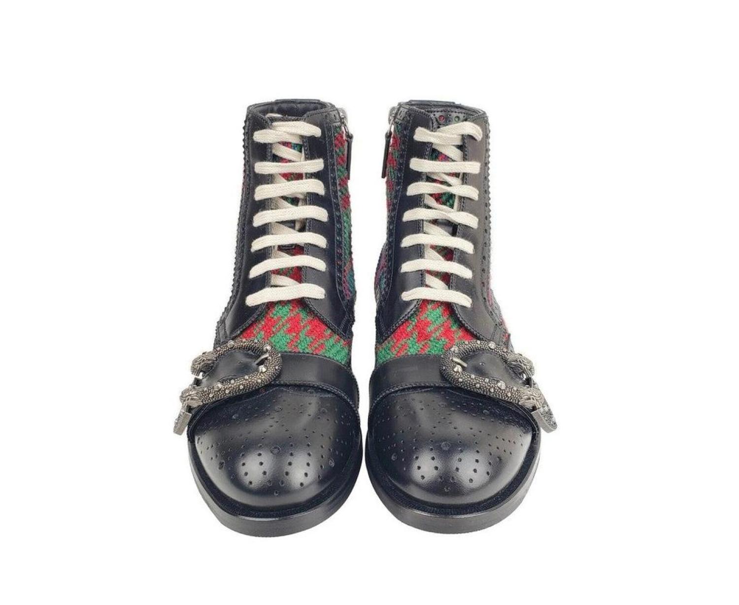 Made of Leather; Leather lining; Leather sole Lion Head Buckle; Style - Bootie Measurements - Size - 7.5 EU / 8 US; Insole Length - 10.75 Inches; Width - Medium Original Gucci box, tags, and authenticity card included Made in Italy