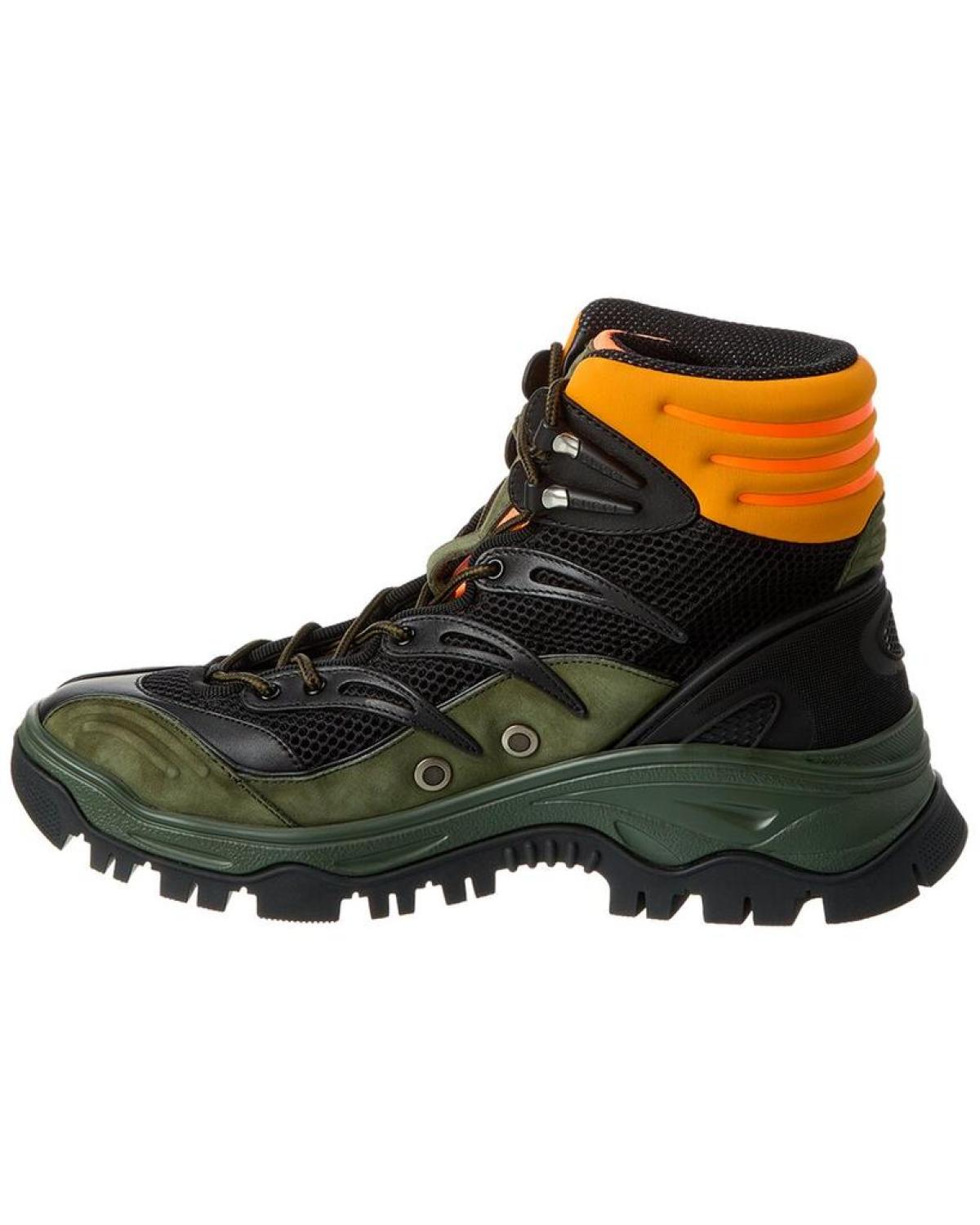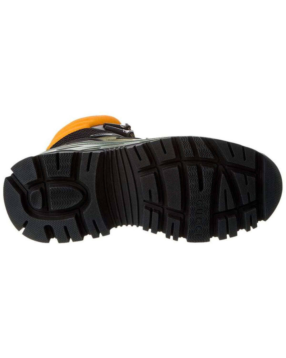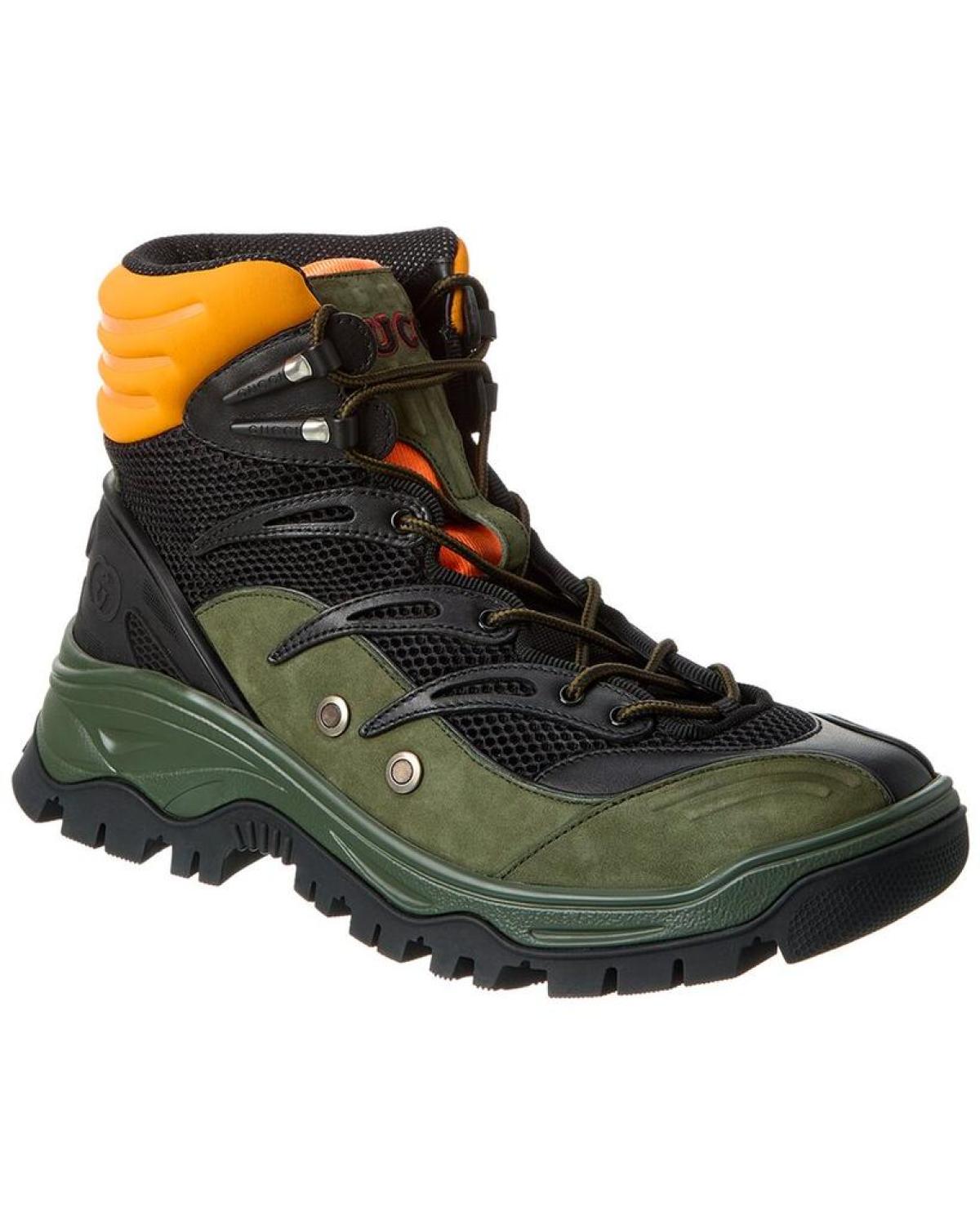 • Step out in style with the Gucci Mesh & Suede Boot. A perfect addition to any fashion-forward man's shoe collection, this chukka boot boasts Italian luxury at its finest. The eclectic and coveted Gucci brand has redefined Italian luxury with their latest offering in black, green and orange mesh, leather and suede. Boasting dark silver hardware and a padded collar, this chunky-soled boot is ready to make a statement with a lace-up closure and lightly padded insole for added comfort. The rubber lug sole provides marked traction while the 2-inch heel and 1-inch platform make for an elevated look. The 5-inch shaft and 12.5-inch boot circumference make for a perfect fit. Please note that all measurements are approximate and were taken from a size 9; slight variations may occur. Please refer to the size chart for US conversions as size selections are UK. Made in Italy, you can be assured of the highest quality construction. Our products are 100% genuine and in some cases purchased from trusted independent suppliers rather than directly from the brand owner. No matter what, we stand by the authenticity of every product sold on our site.