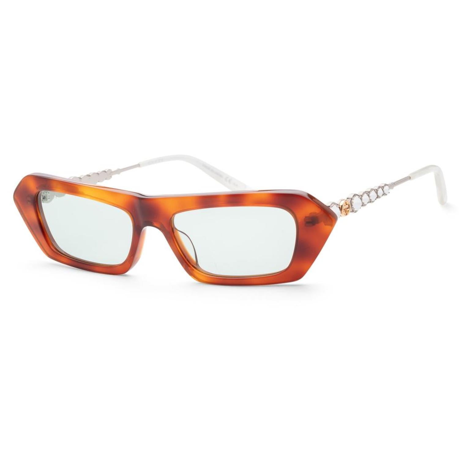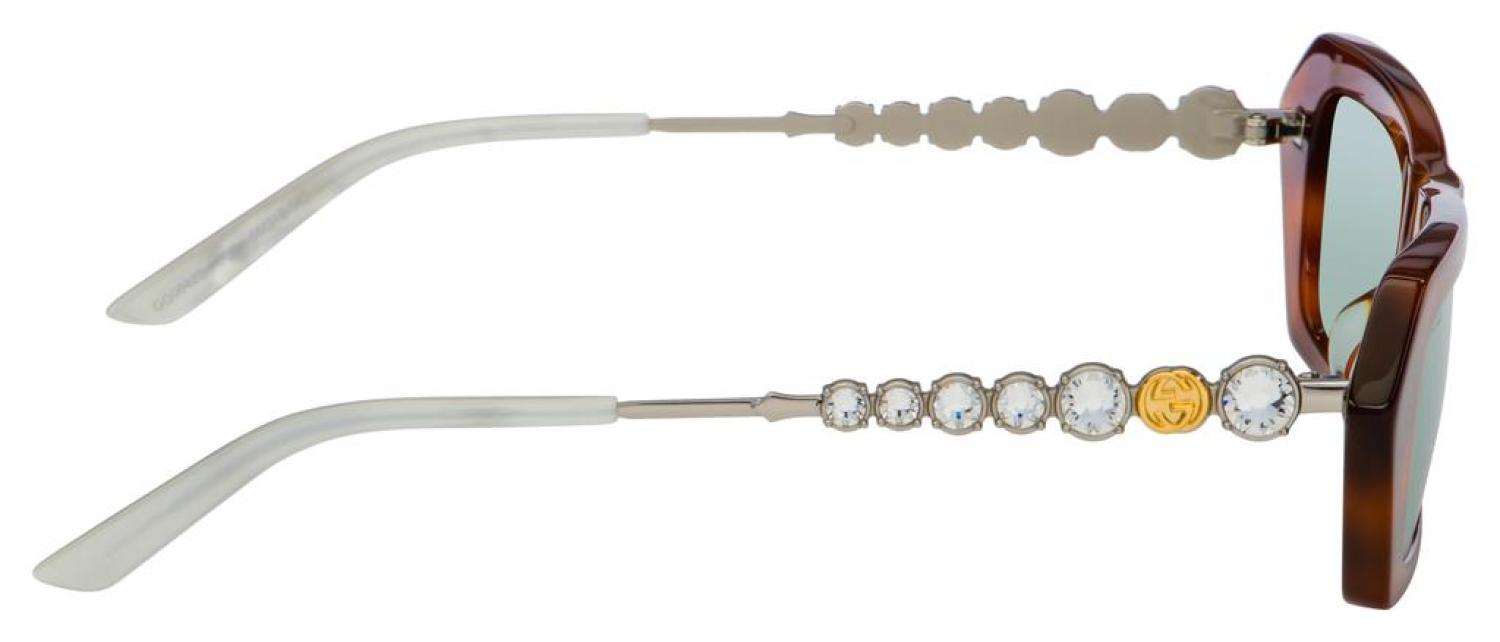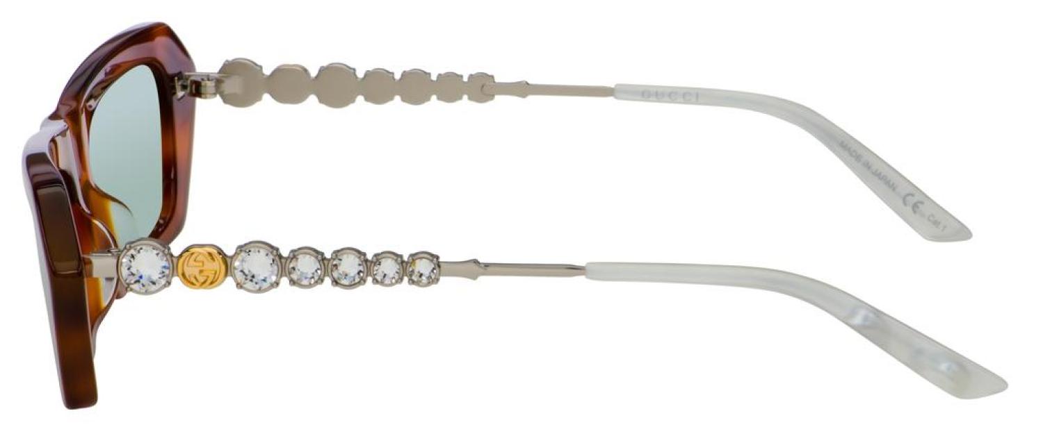 The Gucci women's Sunglasses measure at 56 mm lens width, 18 mm bridge width, and 140 mm arm length. The frame is rectangular-shaped havana/silver acetate. The lenses are non-polarized green. Made in Italy (GG0642S-003)