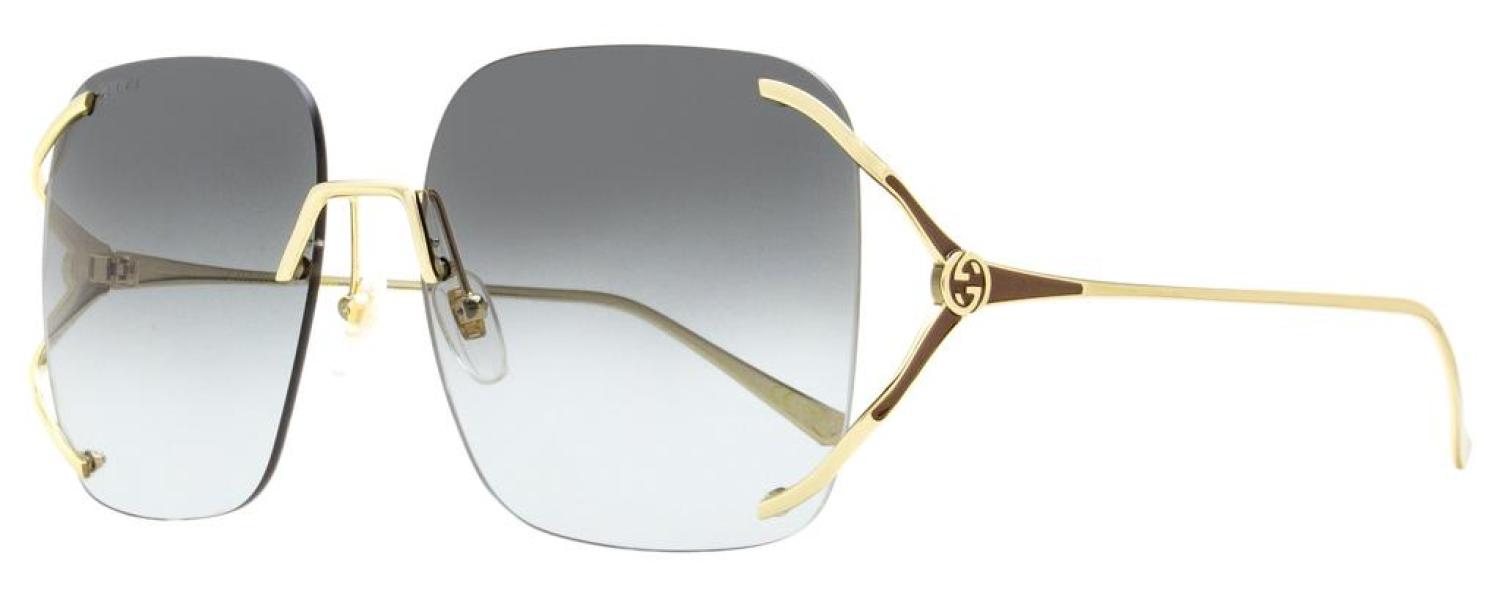 • The Gucci GG 0646 Sunglasses feature a large rimless square shape for women. The made in Japan metal features Fork temples that are decorated with colored enamel and the interlocking GG logo. Crafted of the highest quality materials, Gucci's world renowned brand and bold designs have made their Sunglasses exceptionally desirable. Providing 100% UV protection from the suns harmful rays these sunglasses are functional in addition to being fashionable. Frame Material - Metal Frame Color - Gold Lens Color - Gray Gradient Size - 60-17-135 Made in Japan Includes original case and cloth