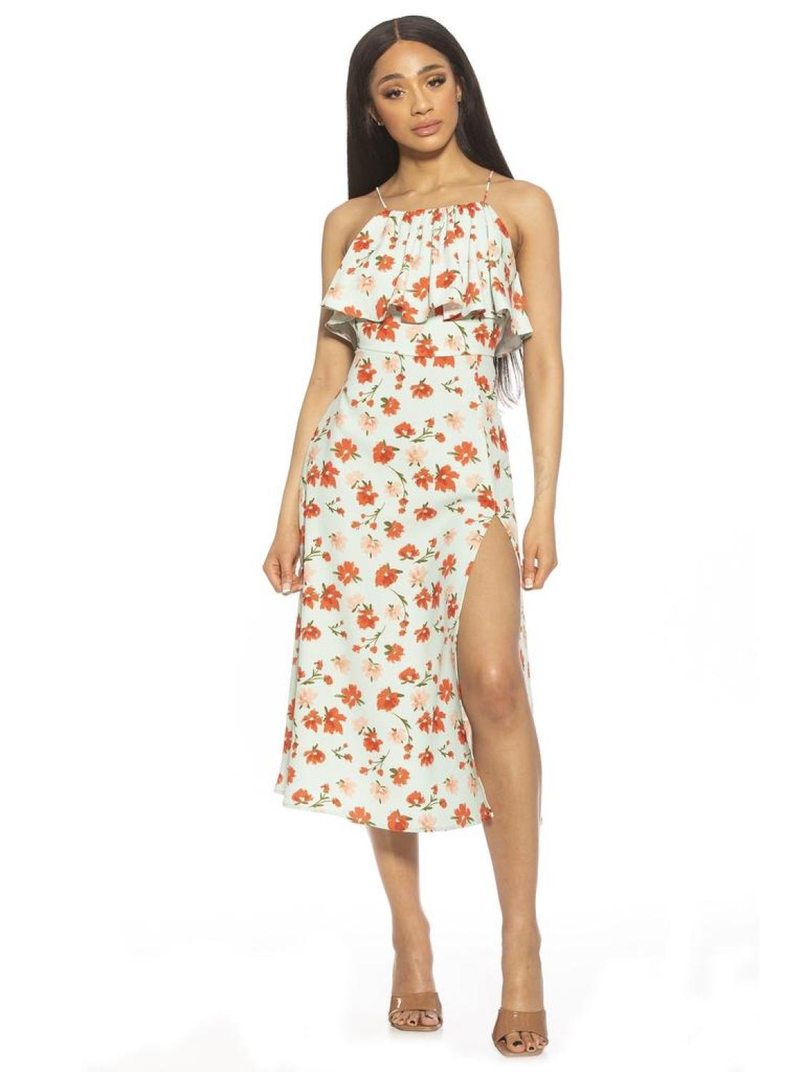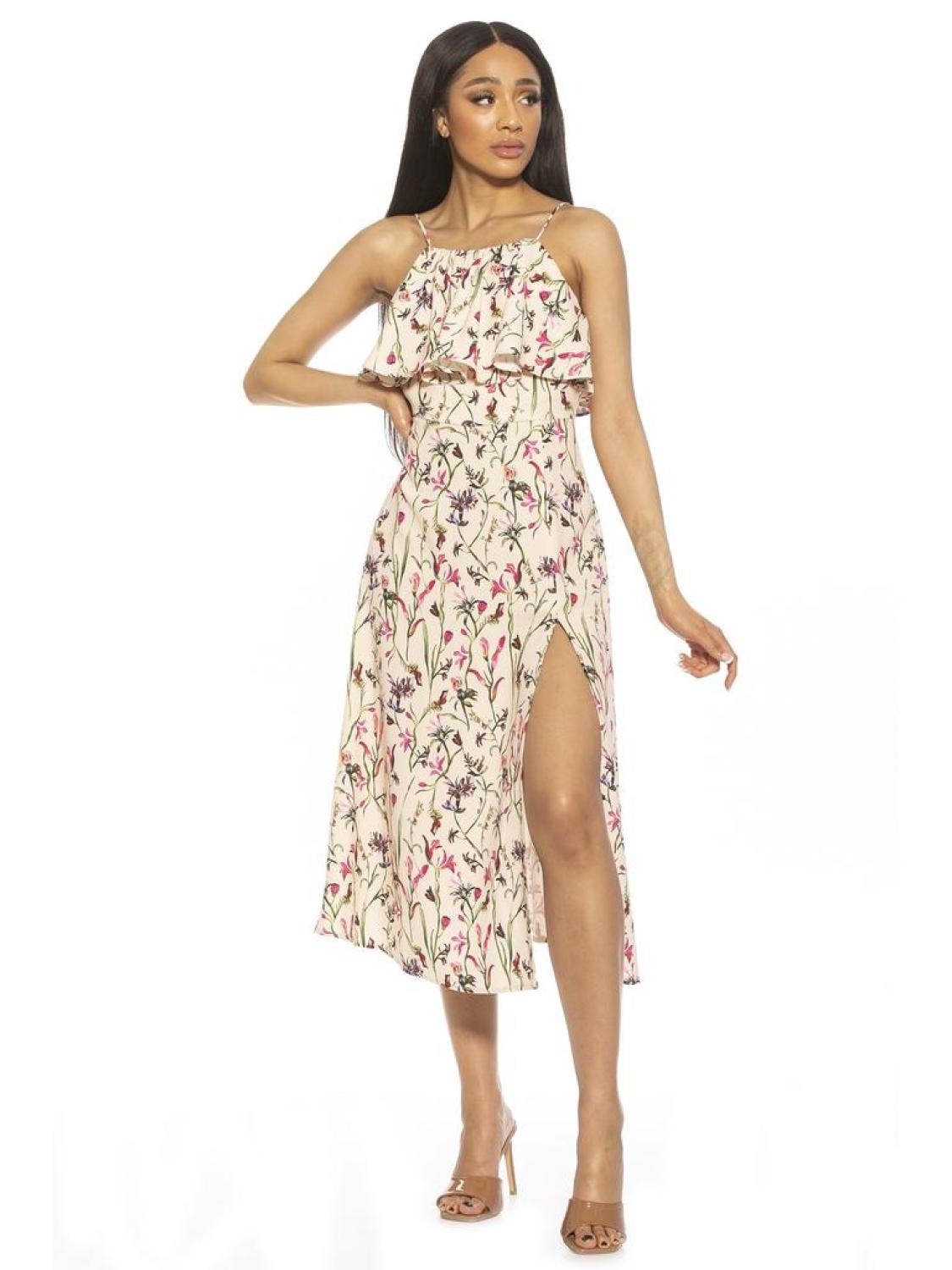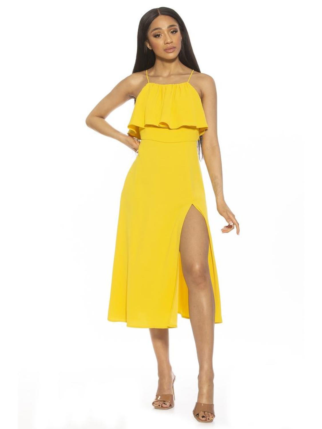 PRODUCT FEATURES 46" length Halter neckline Sleeveless No pockets Fit and flare silhouette Midi length 100% Polyester Lined - 97% Polyester, 3% Spandex Machine wash - Delicate Imported Style D3913