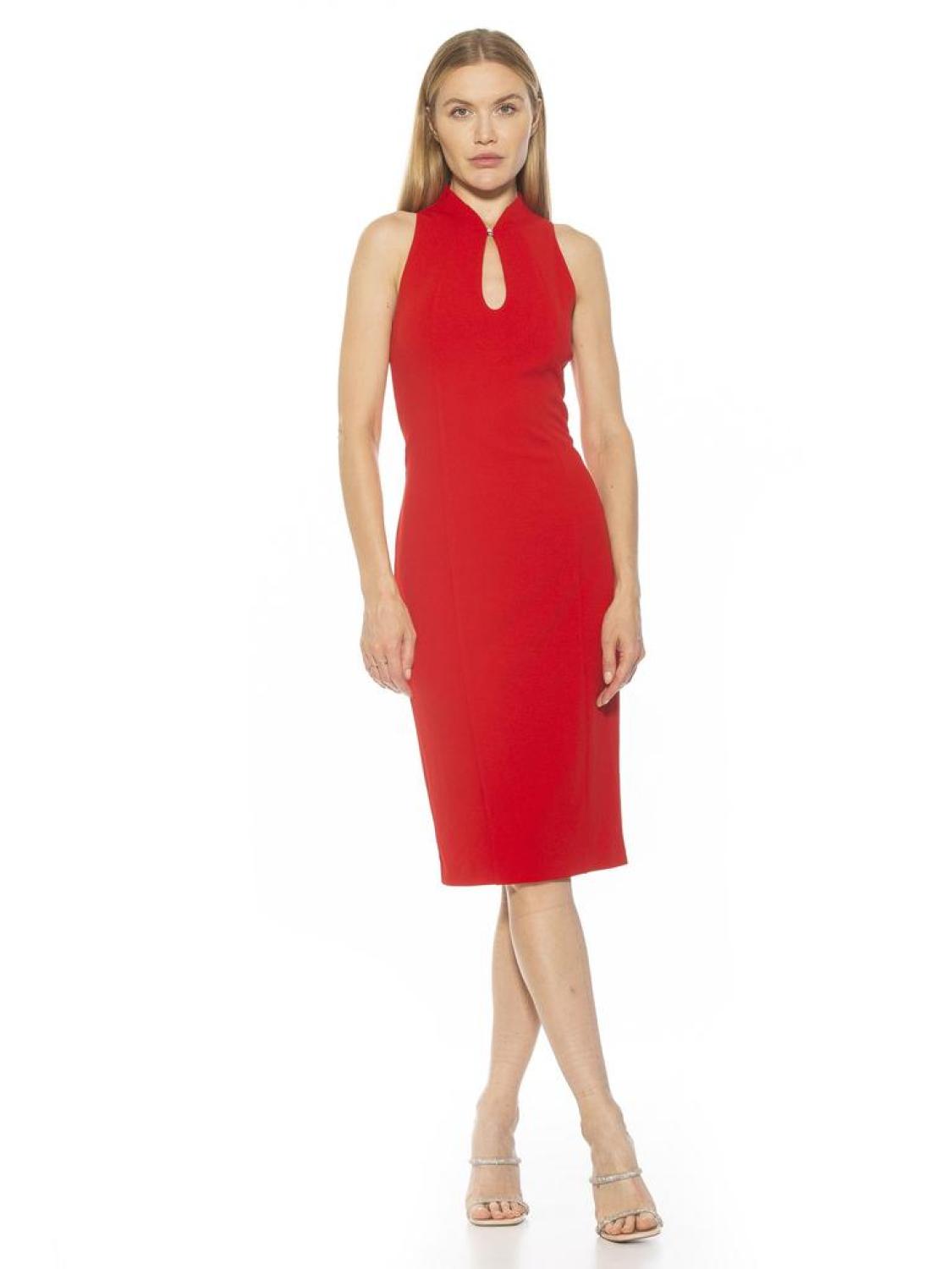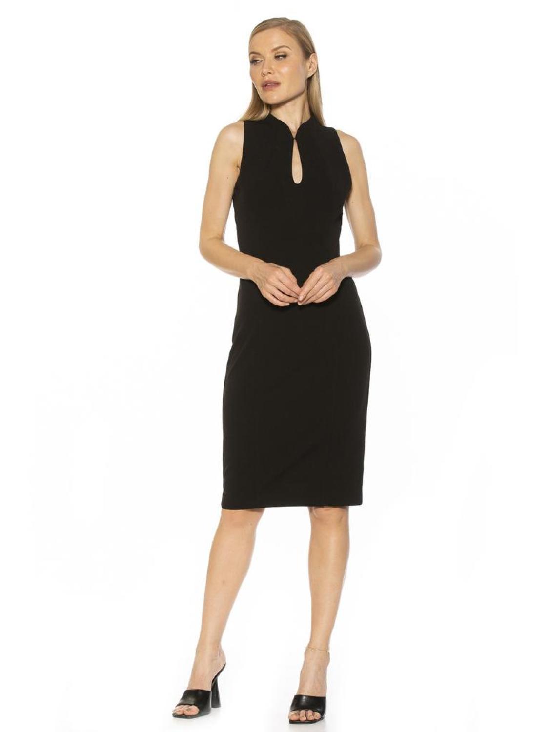 PRODUCT FEATURES Keyhole Sleeveless Dress Form Fitting Sheath Dress 95% Polyester, 5% Spandex Lining 100% Polyester Machine Wash Imported Style D3982