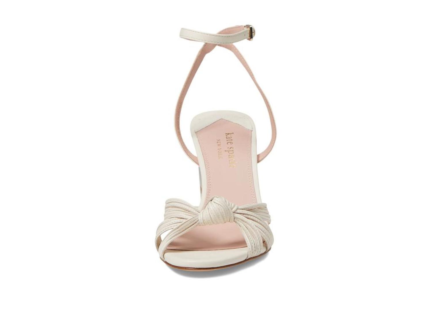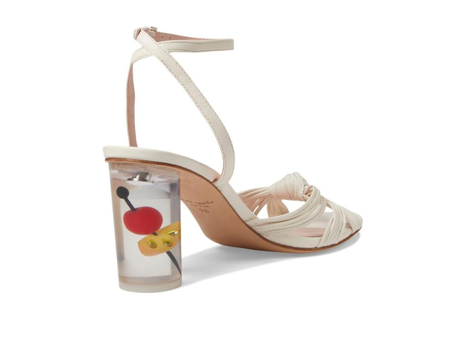 Go from day to night with the Kate Spade New York® Happy Hour strappy sandals featuring a knotted detail across the toes and a unique clear heel displaying a lemon and cherry cocktail topper. Open-toed heels crafted with a leather upper, insole, lining, and outsole. Halo strap around the ankle featuring a buckle closure. Imported. Product measurements were taken using size 9, width M. Please note that measurements may vary by size. Measurements: Heel Height: 3 1/2 in Weight: 11.25 oz-