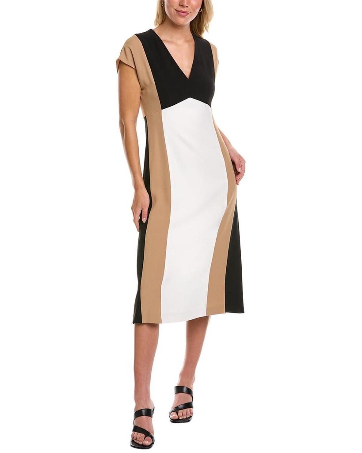Introducing the Hugo Boss Dress - the epitome of sophisticated style and elegance in women's clothing. This stunning dress is perfect for the modern, confident woman who appreciates timeless design and impeccable craftsmanship.From the renowned brand Hugo Boss, known for their expertise in businesswear and athleisure, comes this beautifully tailored dress. Crafted with an individualist perspective, it effortlessly blends classic elements with contemporary details.In a sleek black hue, this dress features a flattering V-neckline and elegant cap sleeves, exuding femininity and grace. The eye-catching colorblocked design adds a touch of modernity and uniqueness to this timeless silhouette.Measuring approximately 48 inches from shoulder to hem, this dress offers a sophisticated length that is both refined and versatile. The model is 5'11 and is wearing a size 4, showcasing the impeccable fit of this piece. Please note that measurements may vary slightly by size.Designed with convenience in mind, this dress is equipped with a center back zipper, ensuring easy on and off. Expertly crafted from a blend of 72% acetate and 28% viscose, it boasts both comfort and durability. Cleaning is a breeze as it is machine washable, giving you peace of mind.Indulge in the luxury of wearing this Hugo Boss Dress, imported for your utmost satisfaction. Experience the impeccable quality and craftsmanship that Hugo Boss is renowned for, making a statement with every step you take. Elevate your wardrobe with this stunning dress and embrace the elegance it brings to any occasion.
