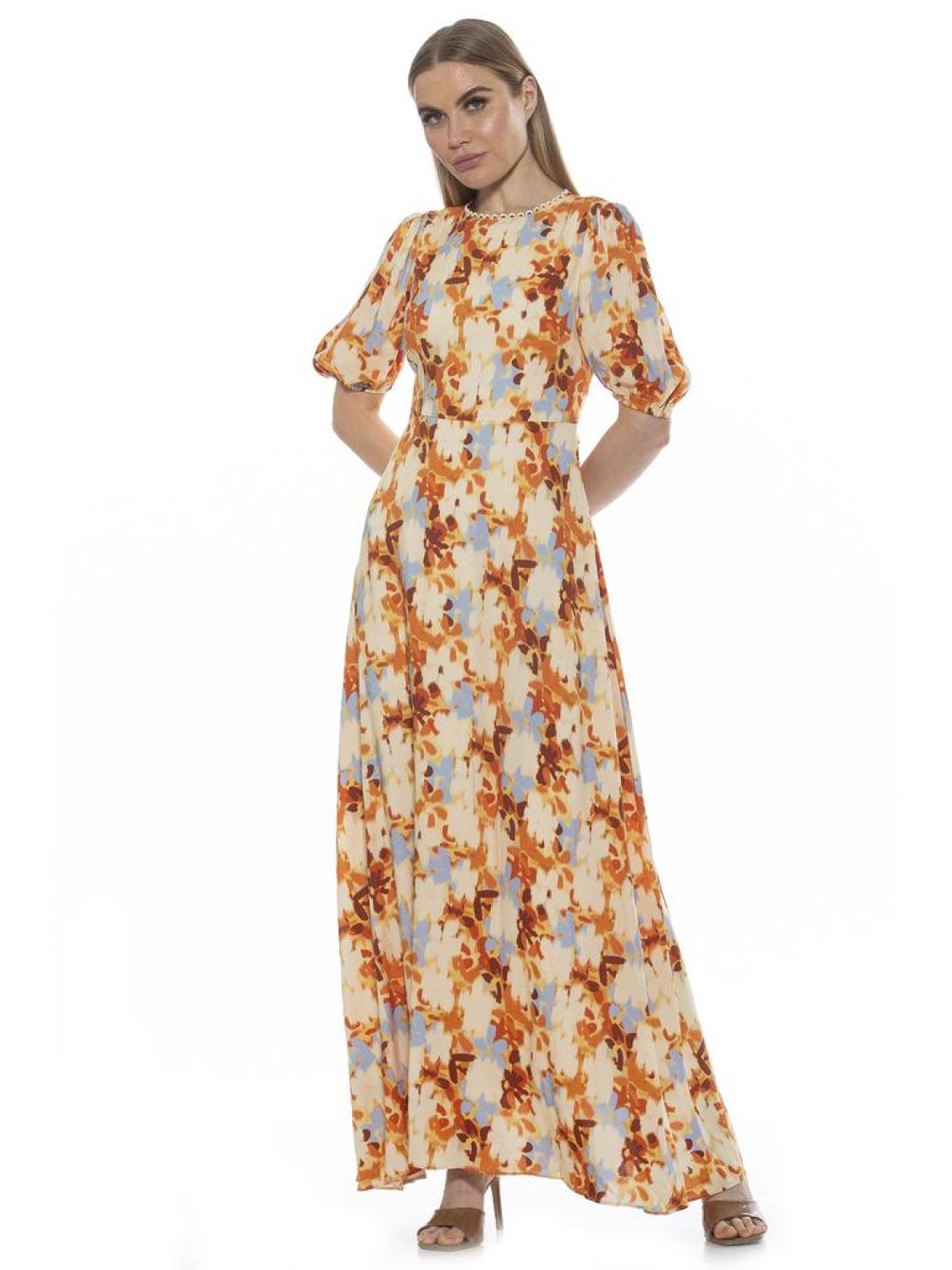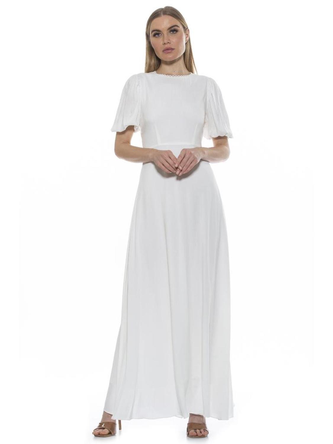 The Imogen is a maxi dress, with bubble sleeves. It has a backless back with a tie back and eyelet neck detail.?�PRODUCT FEATURES Eyelet detail around the neck Crew neck Bubble Sleeves Backless Sentched waist?� Maxi Dress 100% Rayon Lining - 97% Polyester, 3% Spandex Machine Wash Imported Style D4010