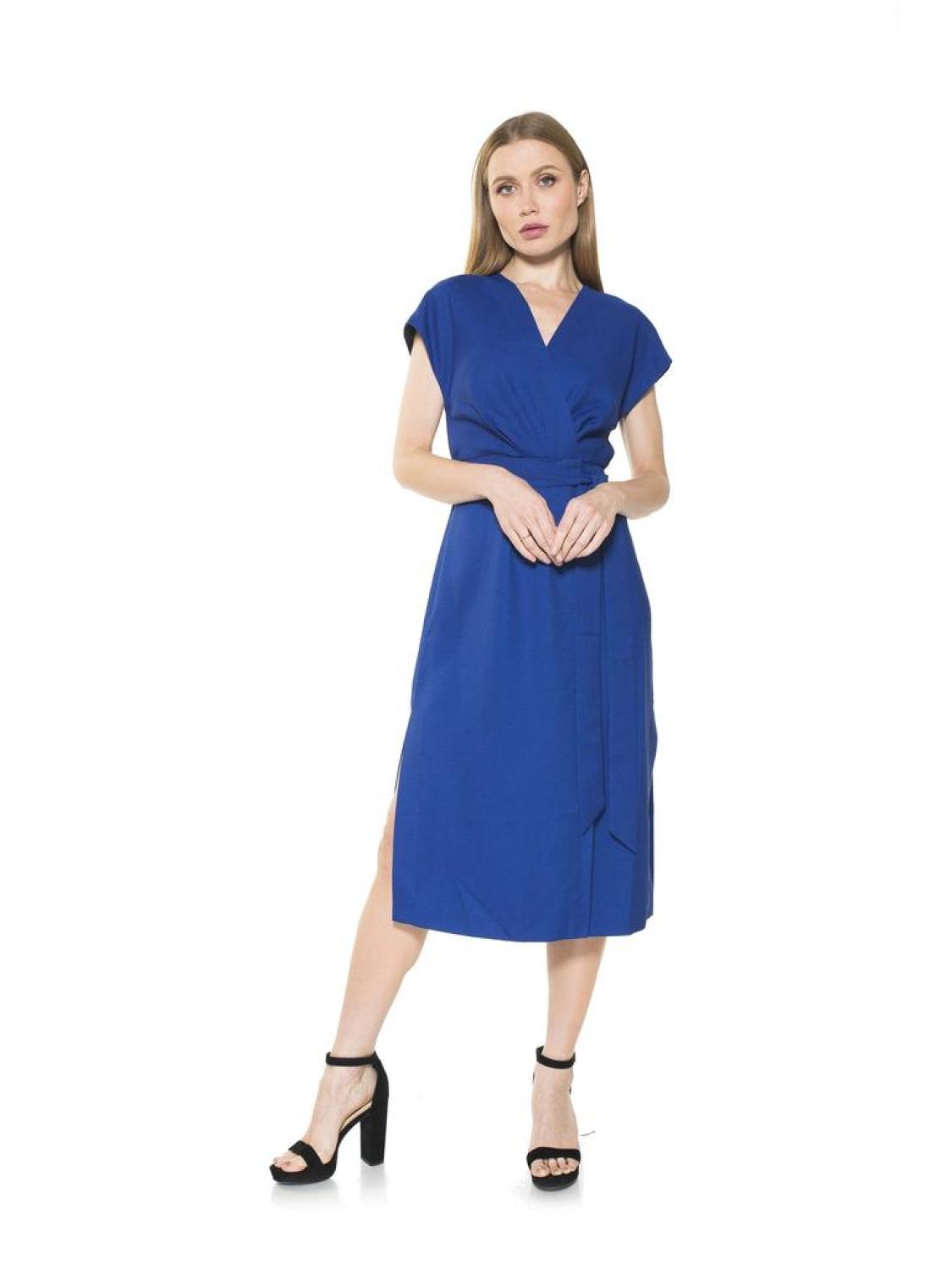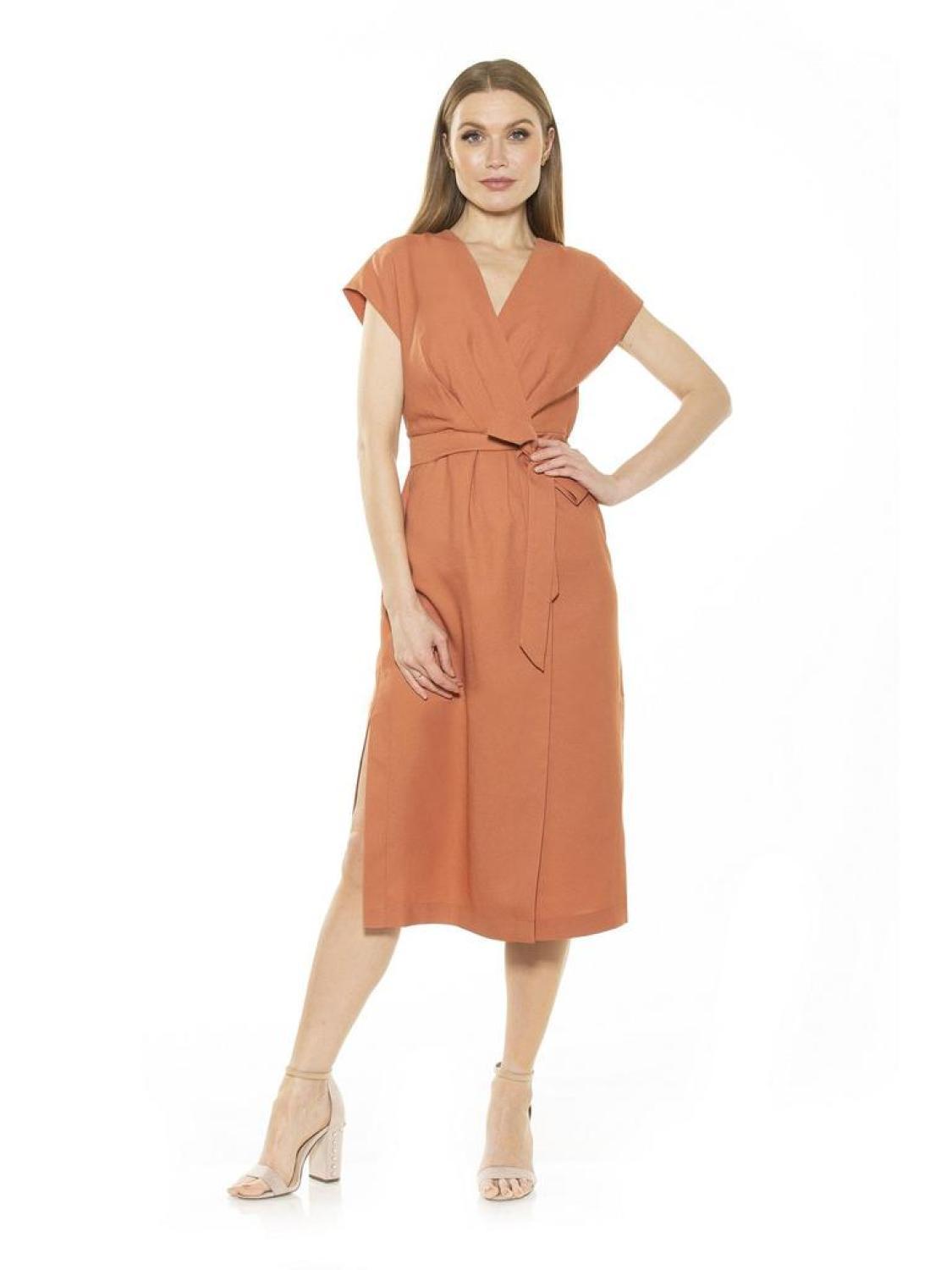 PRODUCT FEATURES Wrap Style Dropped Shoulder V Neckline Short cap sleeves All-over geometric print Below the knee length Side slit 100% Polyester Lined - 100% Polyester Machine wash cold, tumble dry low Imported Style D3684