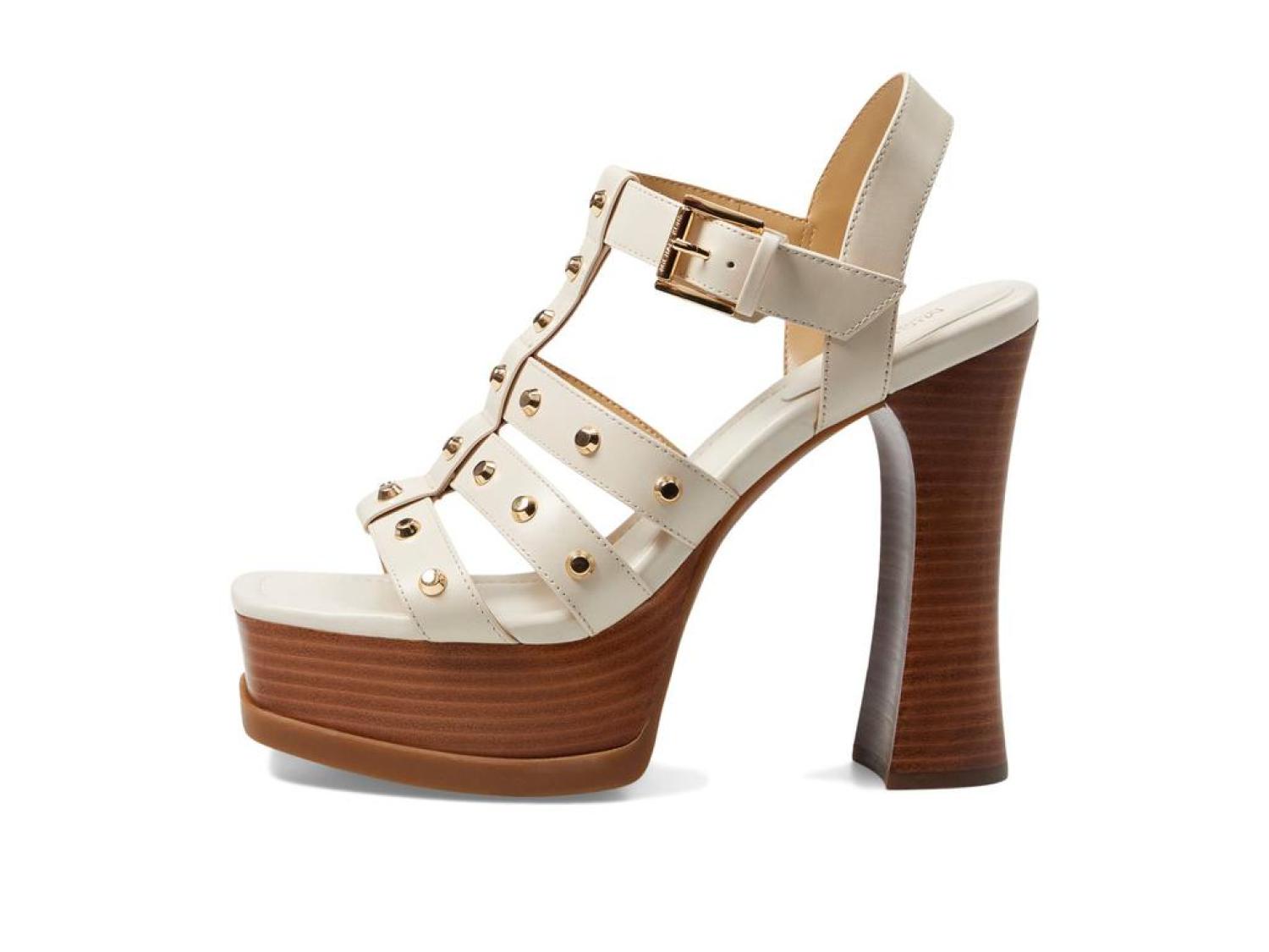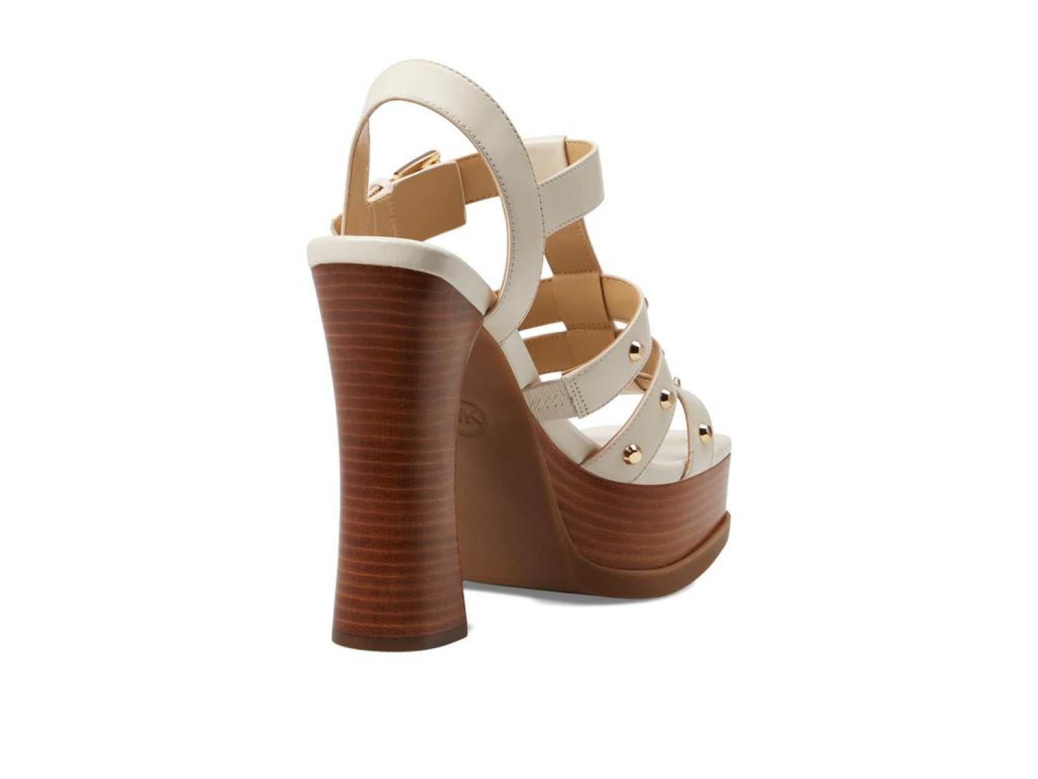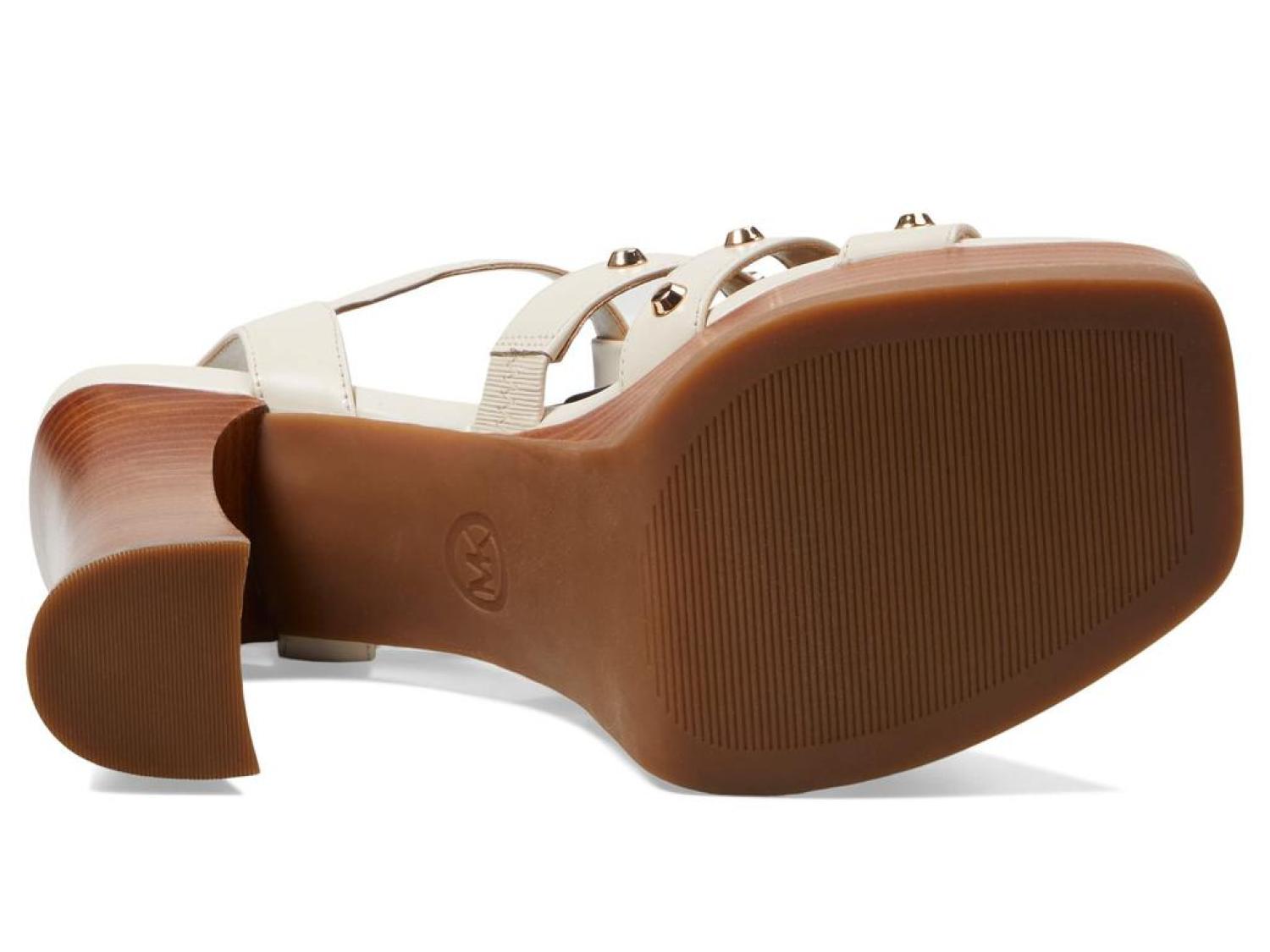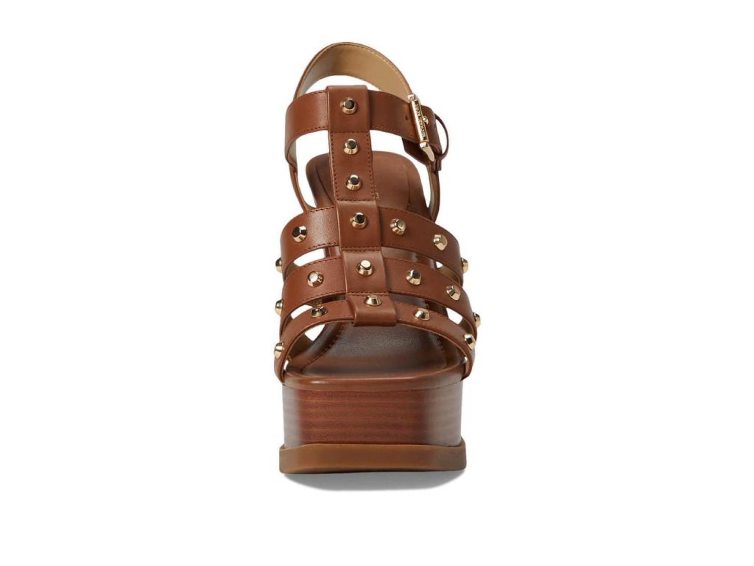 Boost up your style and attitude wearing the MICHAEL Michael Kors® Jagger Platform Sandal. Leather upper. Polyurethane blend lining and synthetic footbed. Buckled closure. Stud detailing on the straps. Open round toe design. Stacked heel. Rubber outsole. Imported. Product measurements were taken using size 7, width M. Please note that measurements may vary by size. Measurements: Heel Height: 5 in Platform Height: 1 in-