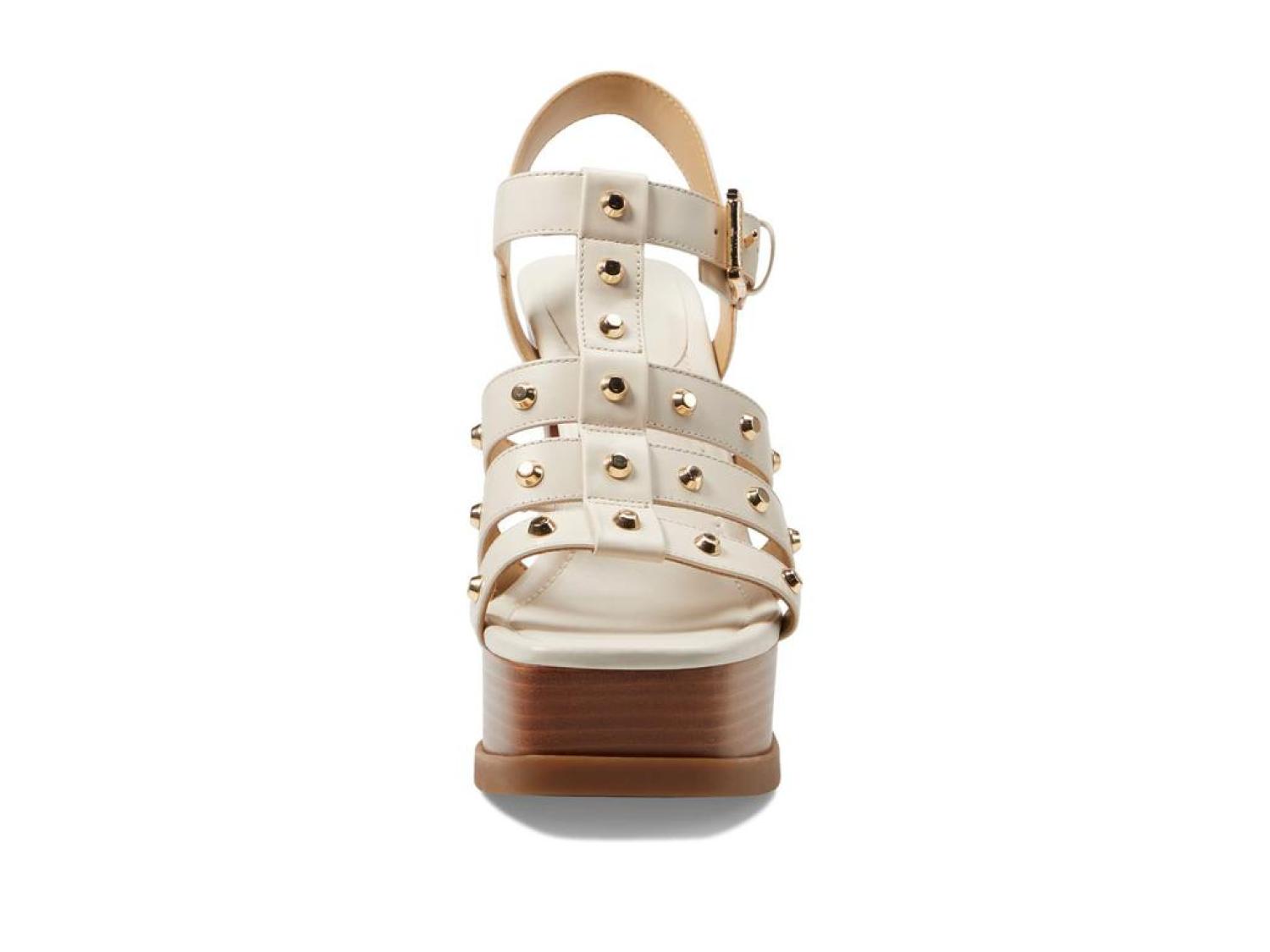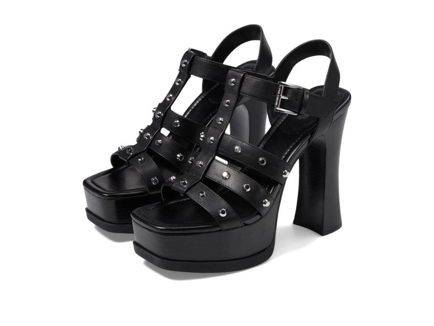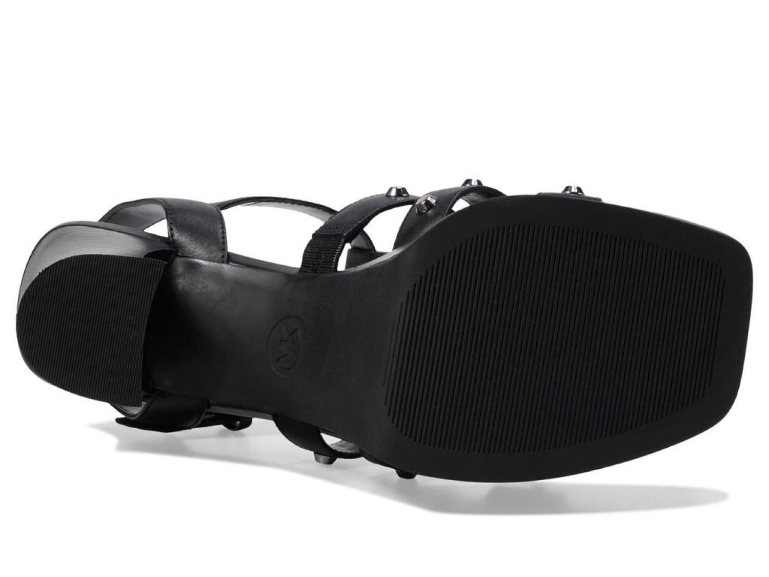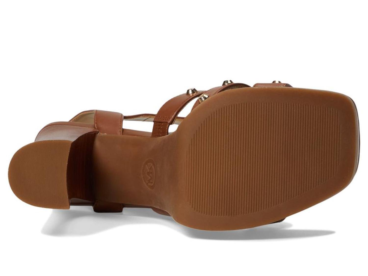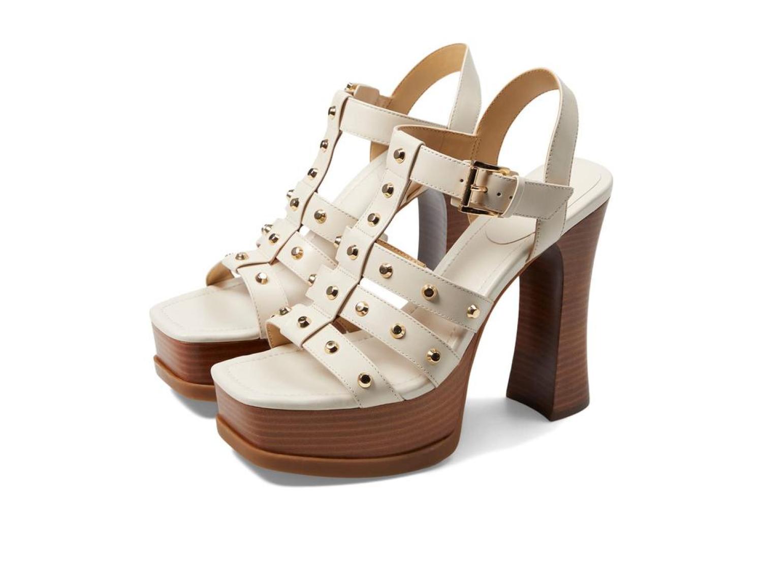 Boost up your style and attitude wearing the MICHAEL Michael Kors® Jagger Platform Sandal. Leather upper. Polyurethane blend lining and synthetic footbed. Buckled closure. Stud detailing on the straps. Open round toe design. Stacked heel. Rubber outsole. Imported. Product measurements were taken using size 7, width M. Please note that measurements may vary by size. Measurements: Heel Height: 5 in Platform Height: 1 in-
