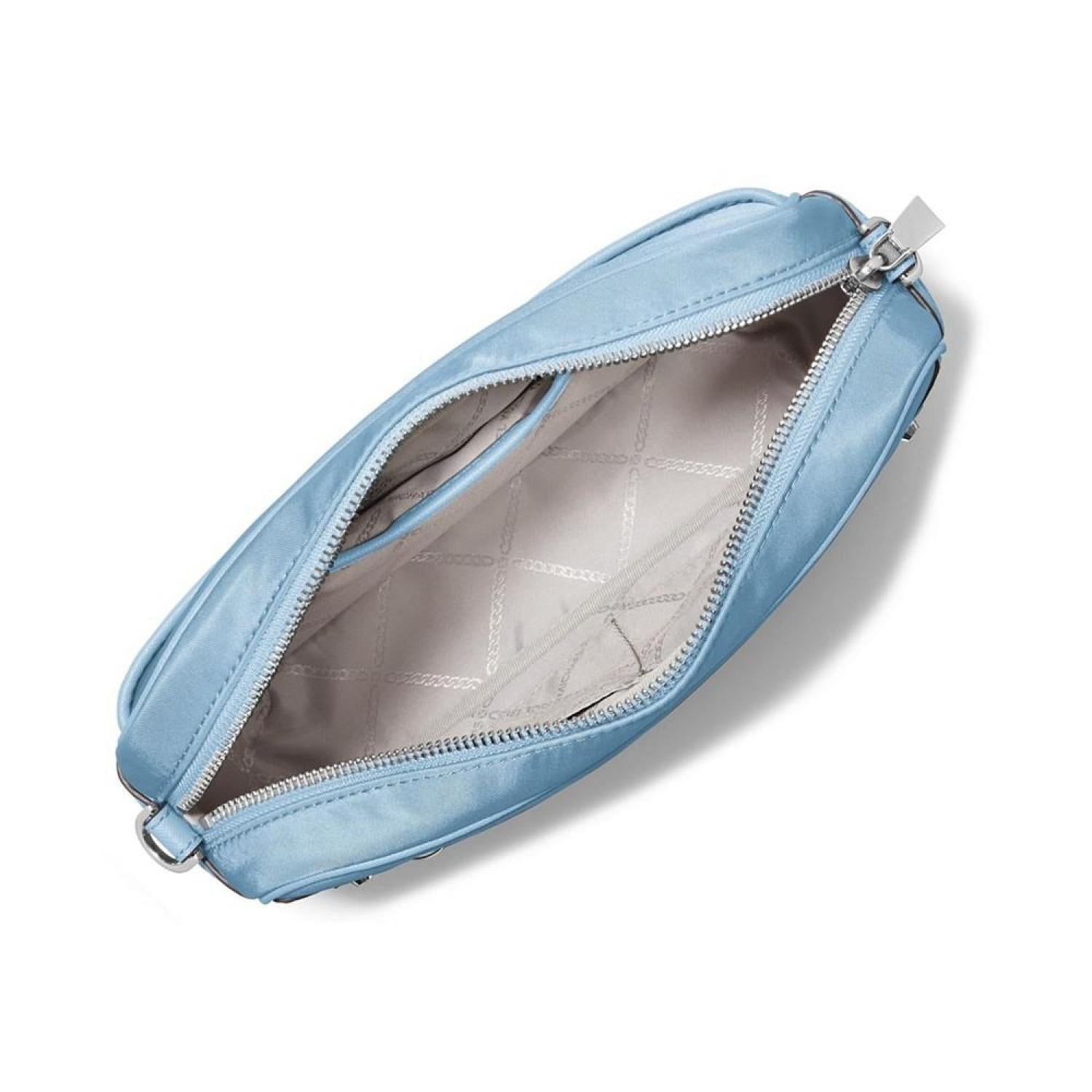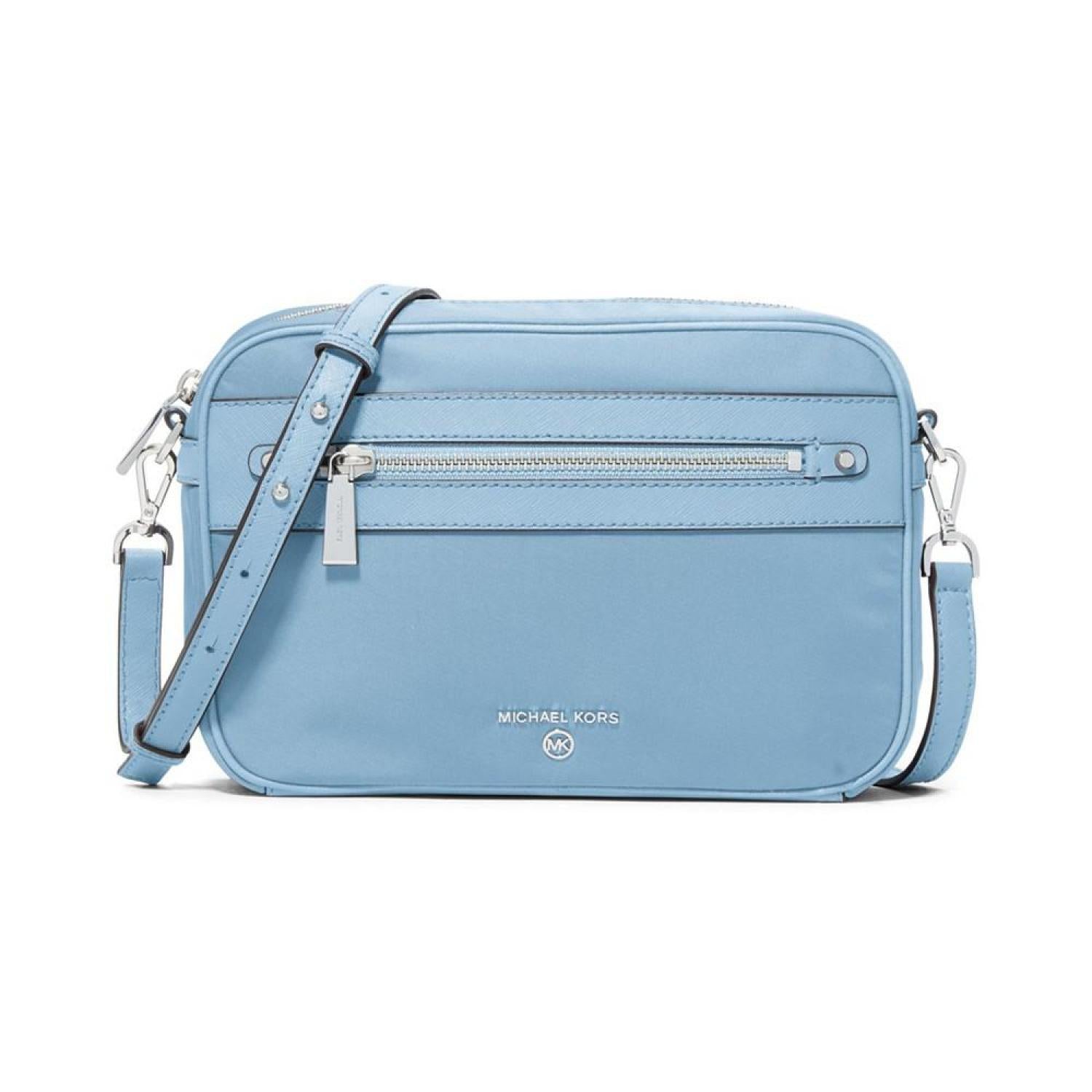Get this signature design in a smaller size. The MICHAEL Michael Kors Jet Set Charm crossbody bag is holds all of your essentials for on the go. 9.5W x 6.5 H x 2.5D Small sized bag Material: Light Weight Gabardine; Trim: Saffiano Leather; Lining: 100% Polyester Zip Closure Interior: 1 Back Slip Pocket, 2 Front Slip Pockets Exterior: 1 Back Slip Pocket, 1 Front Zip Pocket Gold-tone hardware 0.76 lbs Leather/nylon Imported