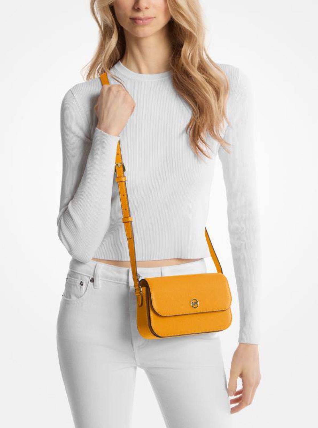 • Easy meets elevated. Featuring a sleek fold-over design, this crossbody bag is crafted from luxe pebbled leather and finished with our understated logo charm. The interior keeps you organized while on the go with two separate compartments and built-in card slots.
