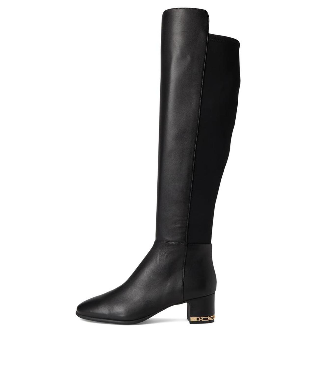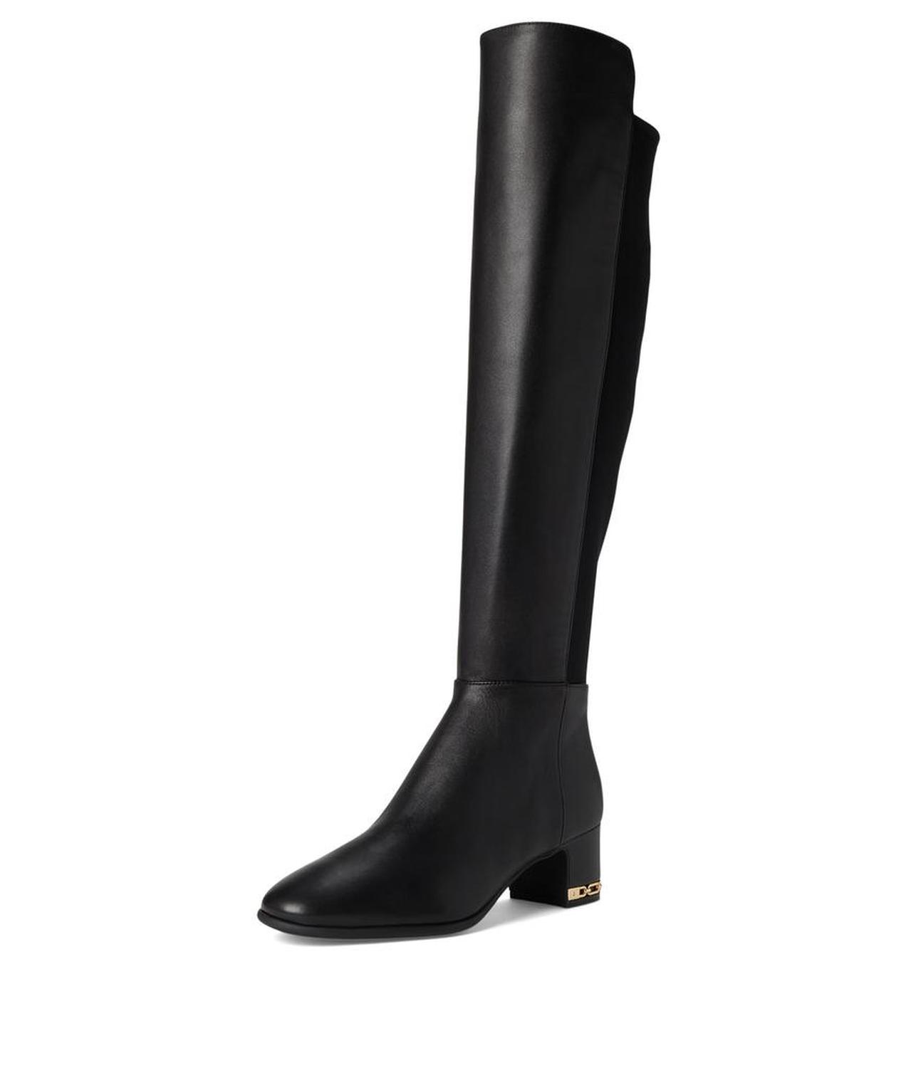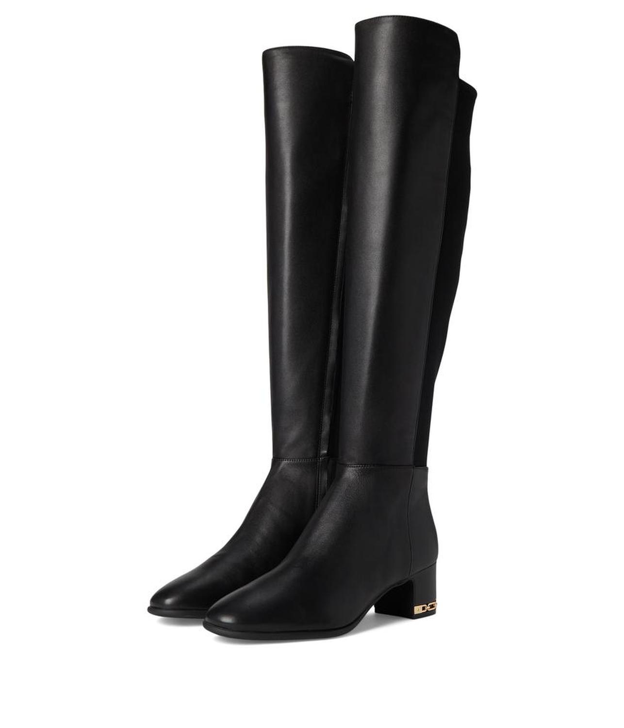 The MICHAEL Michael Kors® June Flex Boots are designed with comfort in mind, from flex construction to extra cushioned insoles detailed with elevated empire chain hardware on the heel, adding a sophisticated touch. The long boots have a leather upper, polyester lining, extra-padded socks, and block heels.