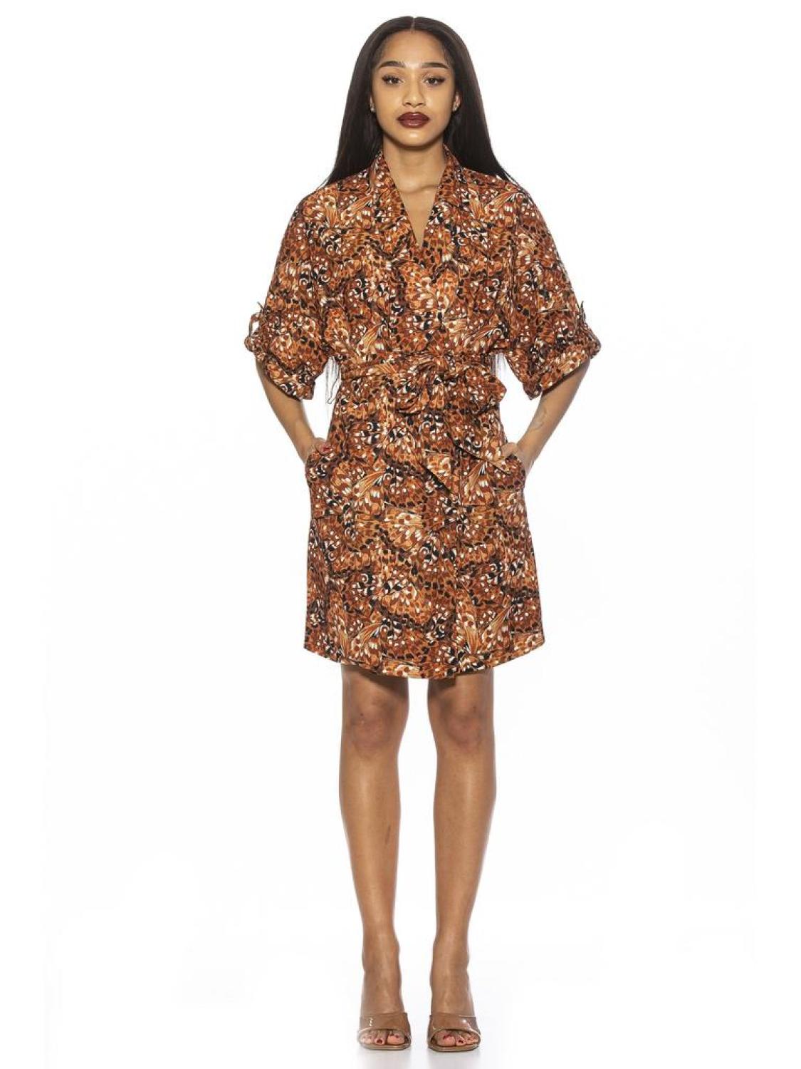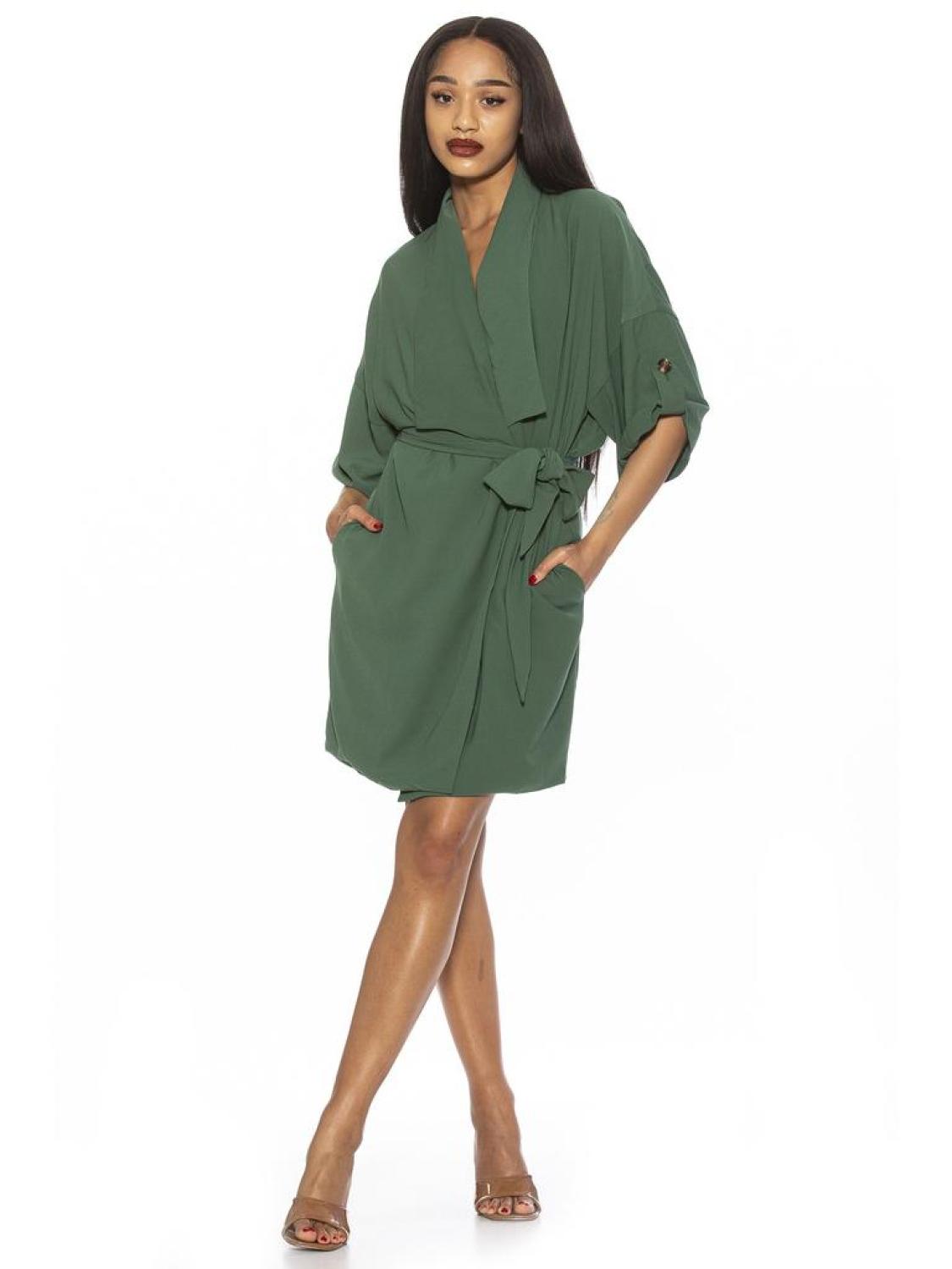 May cause compliments. The June is a 3/4 sleeve, mini dress with a collared neckline. The dress features a wrap skirt for a figure-flattering fit.PRODUCT FEATURES Thick Collar?� Tie Waistband Elbow Length Sleeve?� Oversized Look?� Wrap Dress Mini Dress 100% Polyester Lining - 97% Polyester, 3% Spandex Machine Wash Imported Style D3985