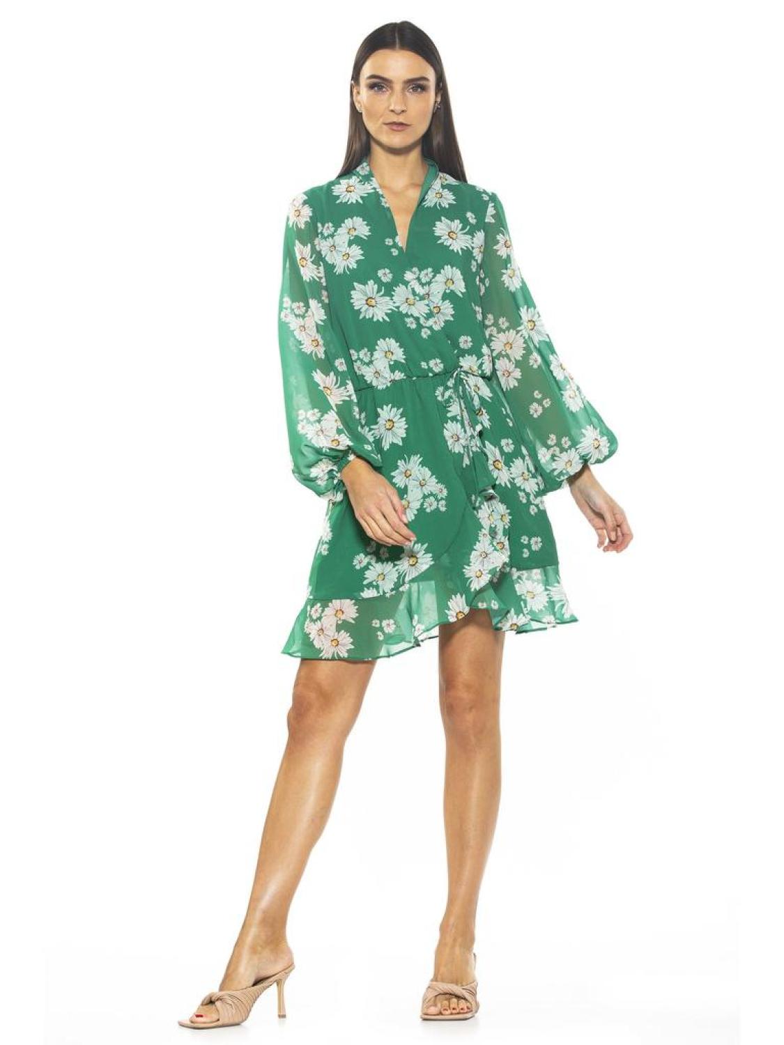 PRODUCT FEATURES Surplice V-neck Long blouson sleeves Slips-on overhead Elasticized waist Ruffle Skirt 100% Polyester Lined - 100% Polyester Machine wash Imported Style D3907