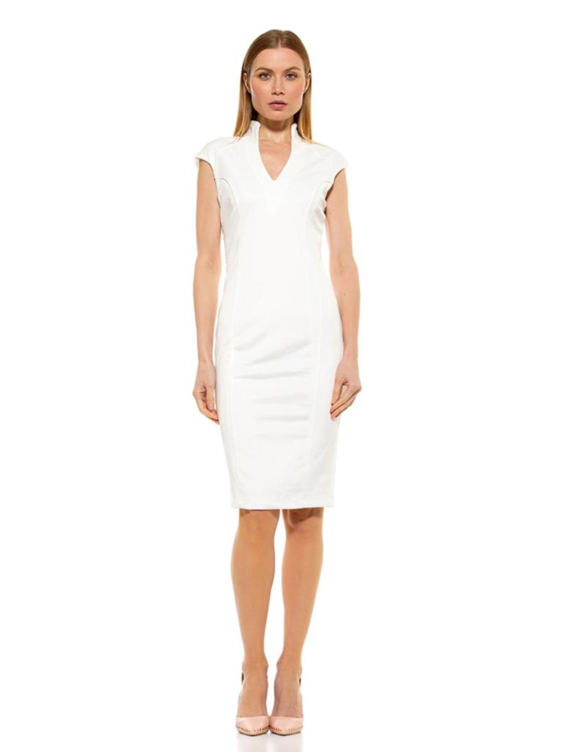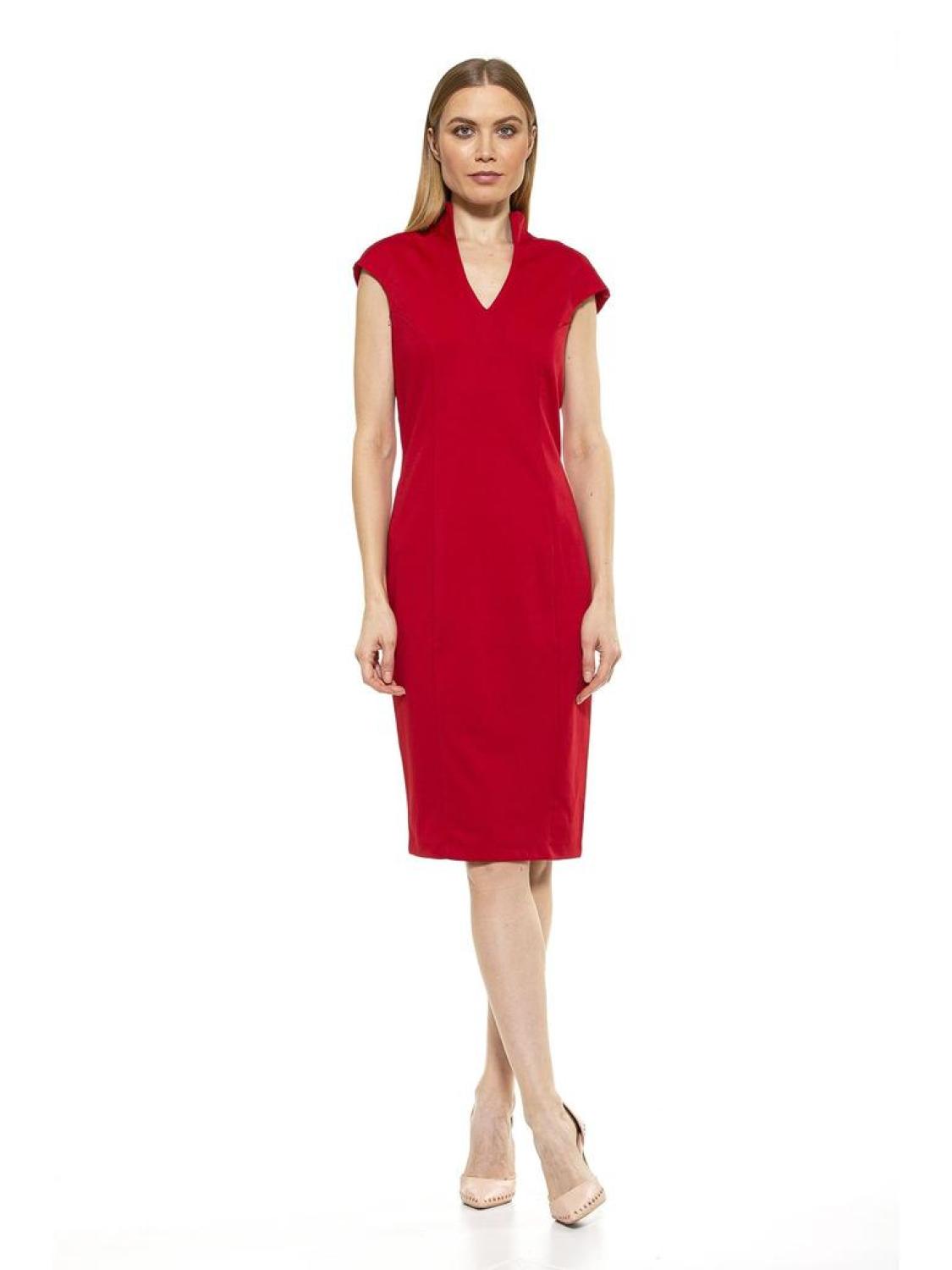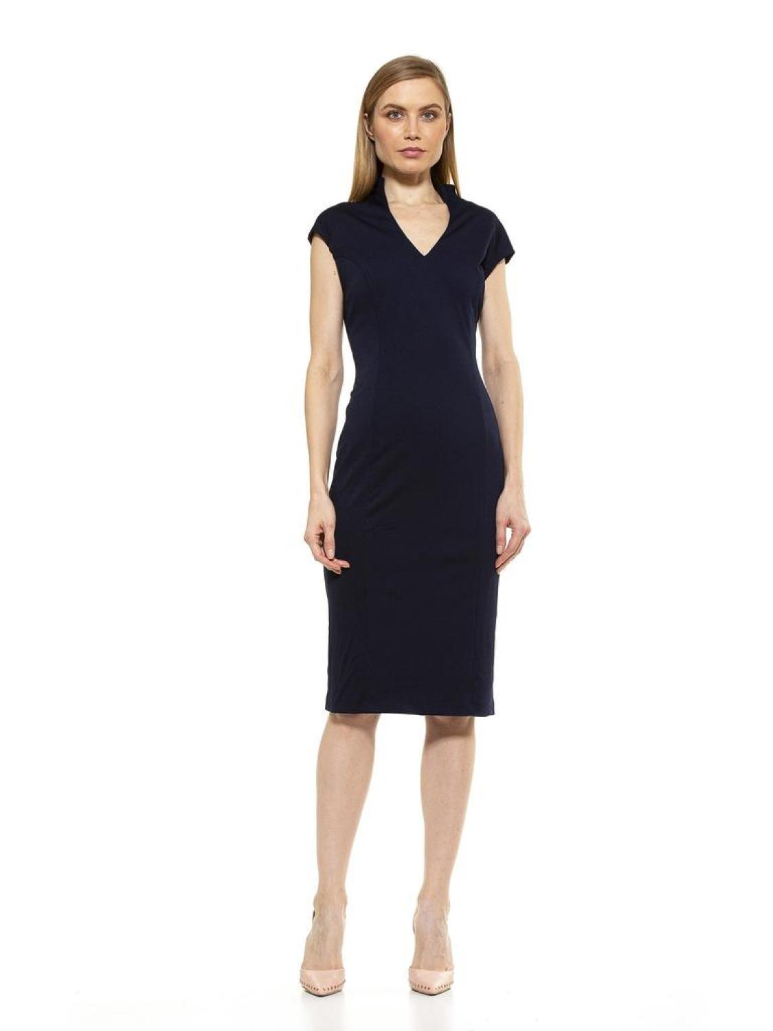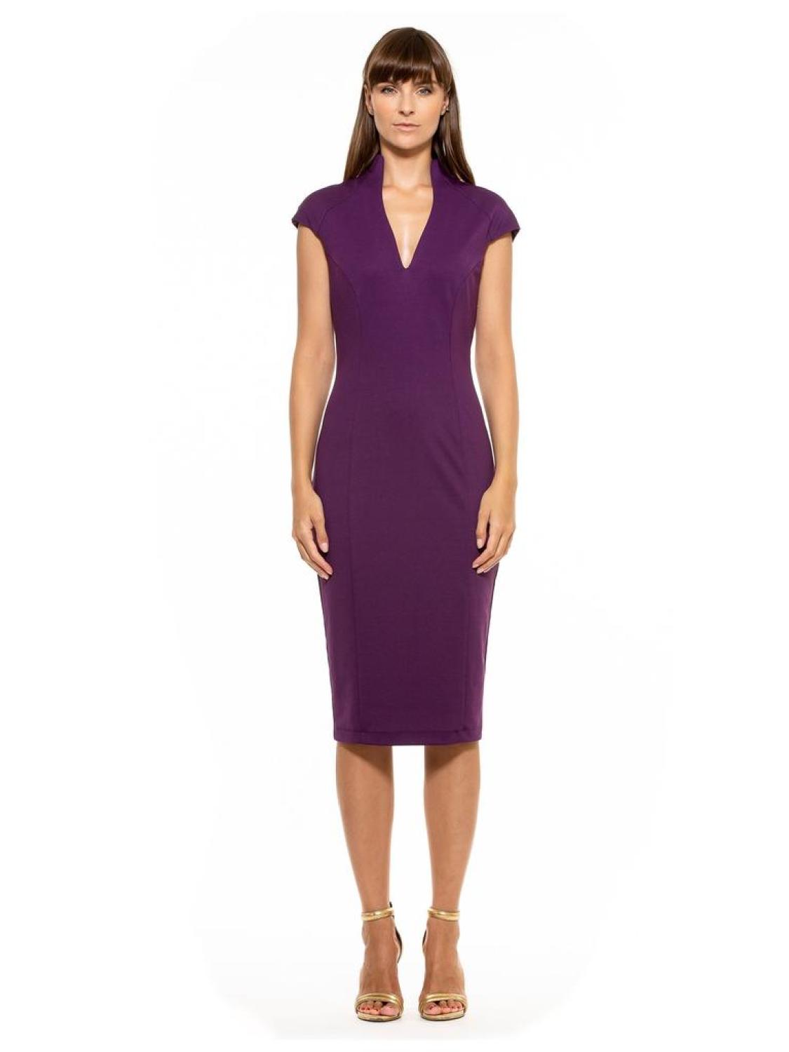 PRODUCT FEATURES Stand-up collar V-neckline Cap sleeves Exposed back zip closure Princess seams Contrast lining Center back vent Tonal topstitching Panel seaming Stretch Ponte 95% Polyester, 5% Spandex Lining - 100% Polyester Dry clean recommended Imported Style PL0001