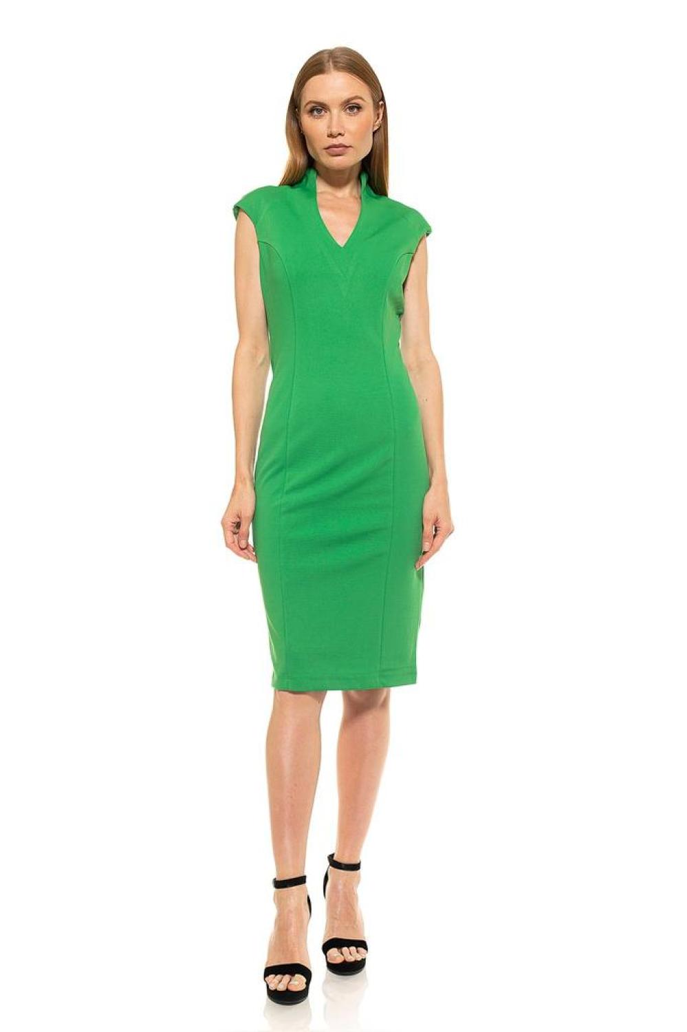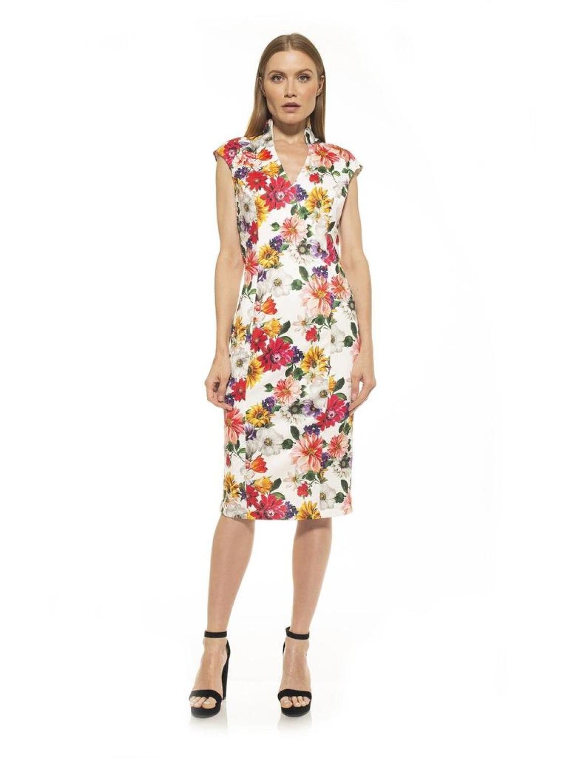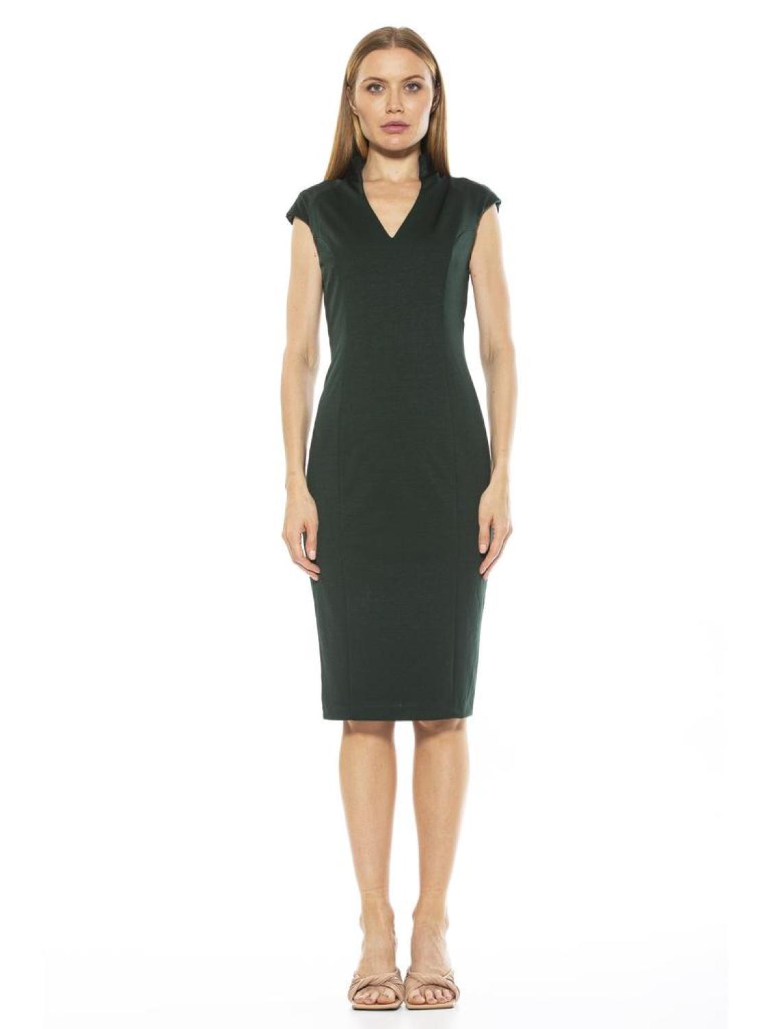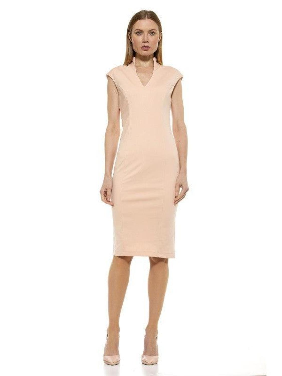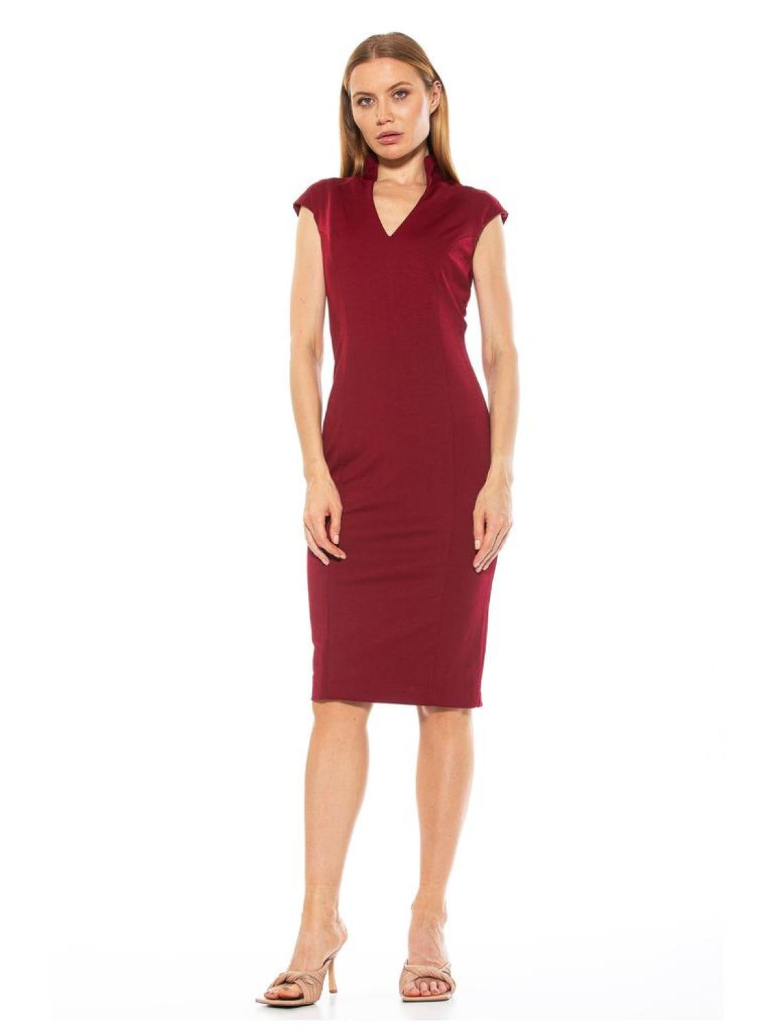 PRODUCT FEATURES Stand-up collar V-neckline Cap sleeves Exposed back zip closure Princess seams Contrast lining Center back vent Tonal topstitching Panel seaming Stretch Ponte 95% Polyester, 5% Spandex Lining - 100% Polyester Dry clean recommended Imported Style PL0001