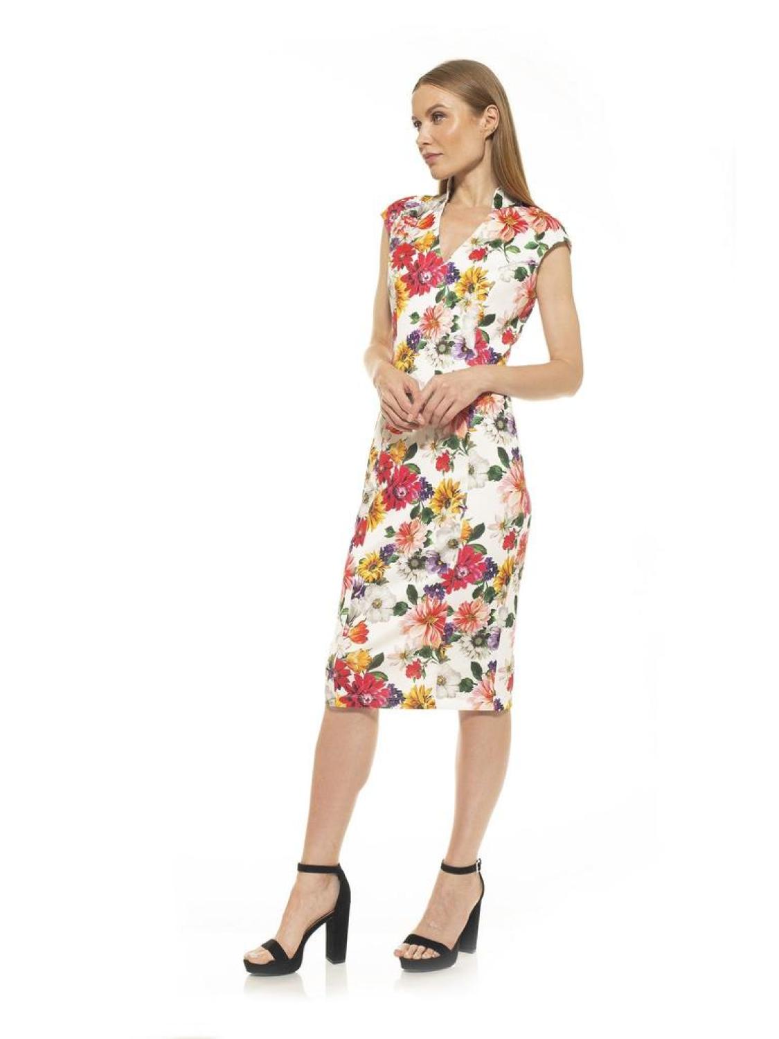 PRODUCT FEATURES Stand-up collar V-neckline Cap sleeves Exposed back zip closure Princess seams Contrast lining Center back vent Tonal topstitching Panel seaming Stretch Ponte 95% Polyester, 5% Spandex Lining - 100% Polyester Dry clean recommended Imported Style PL0001