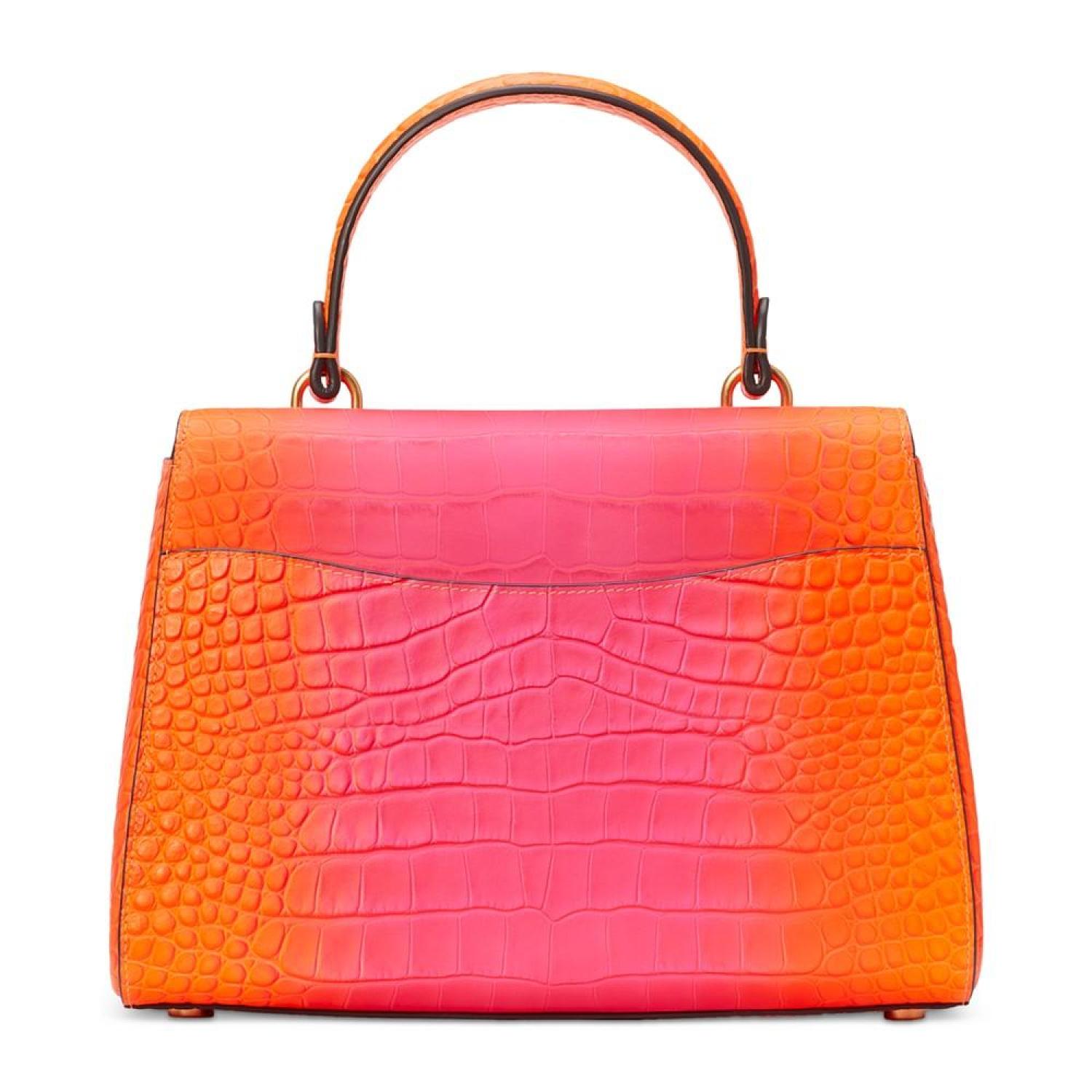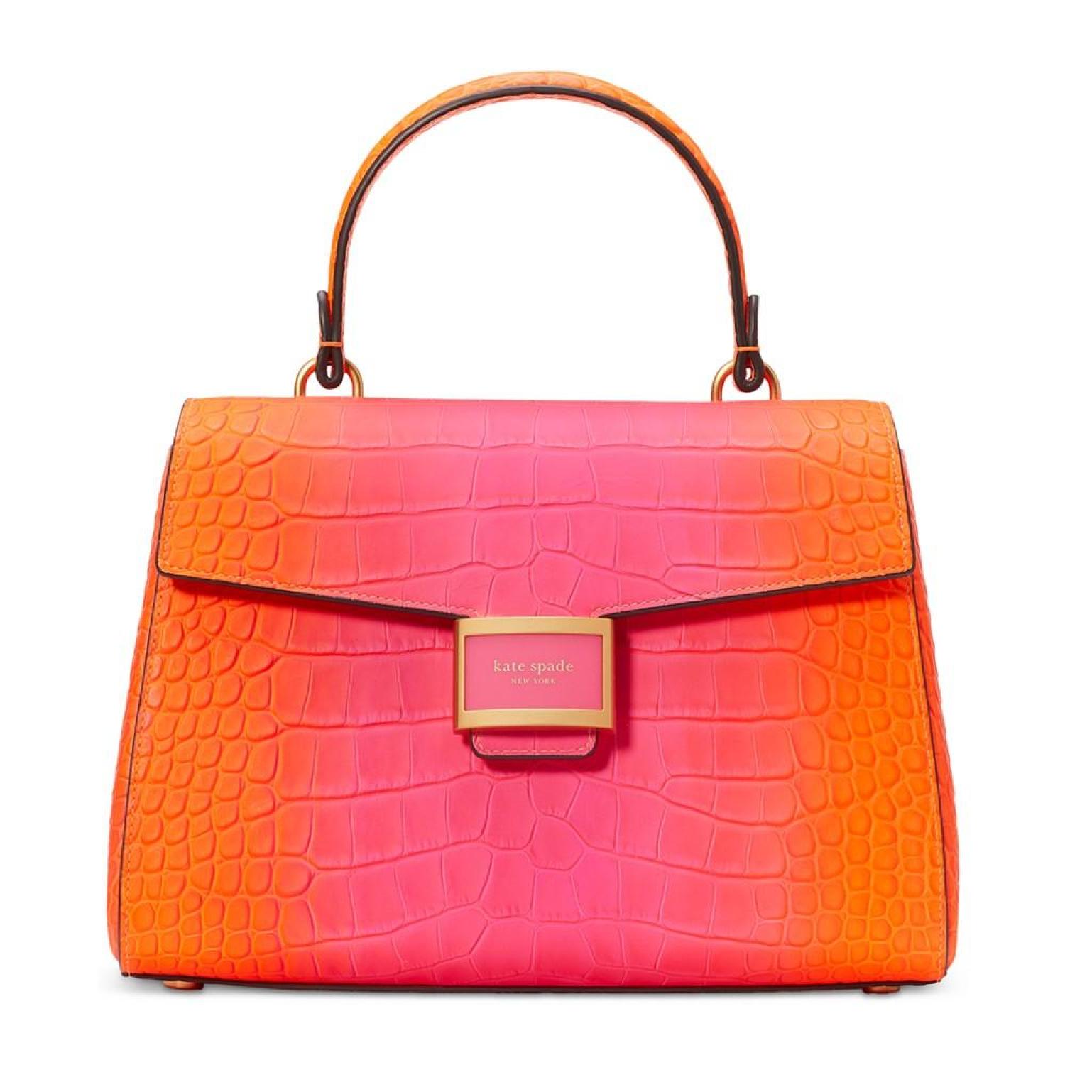 The Katy bag gets a new look with a polished top-handle design. Done in juicy tropical ombre croc-embossed leather, it's the go-to bag for days when you want to feel perfectly put together. By kate spade new york. Small sized bag; 10-2/5"W x 7-7/10"H x 4-1/2"D (width is measured across the bottom of handbag) Silhouette is based off 5'9" model 4"L handle; 22"L adjustable, removable strap Flap with magnetic snap closure Gold-tone hardware, interior zip & slip pockets Leather Spot clean Imported