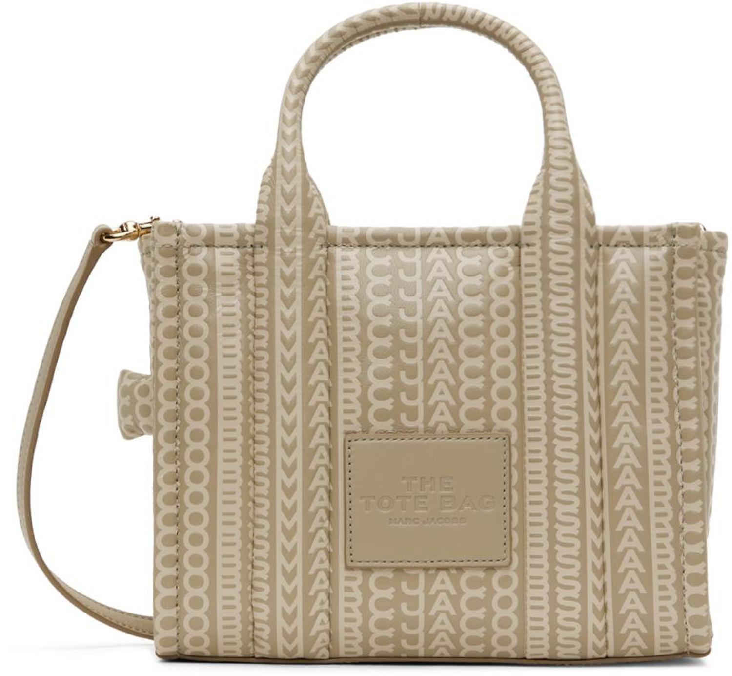 Marc Jacobs Khaki 'The Monogram Leather Small' Tote Lambskin tote in khaki. Logo pattern embossed throughout. · Twin rolled carry handles · Detachable and adjustable shoulder strap · Carry handle at side · Logo patch at back face · Zip closure · Card slot and zip pocket at interior · Faille lining · H8 x W9.75 x D4.75 In Supplier color: Khaki Lambskin. Made in Viet Nam. 232190F049068
