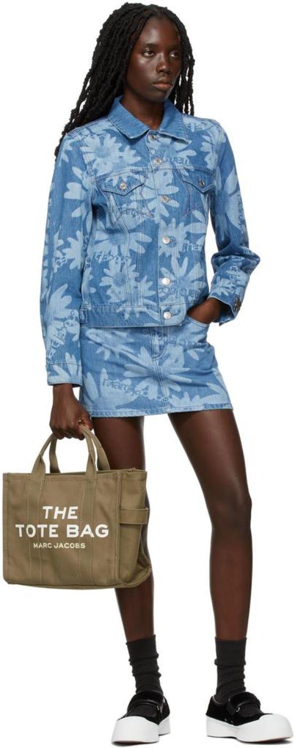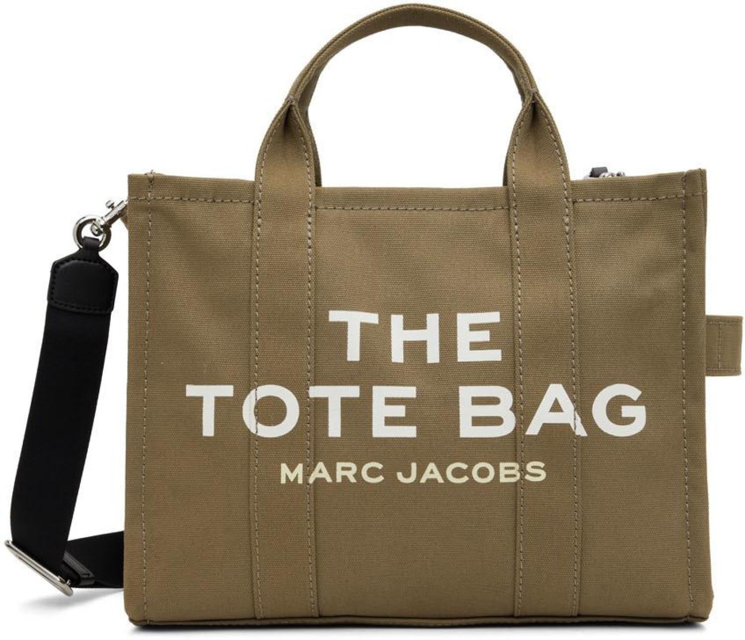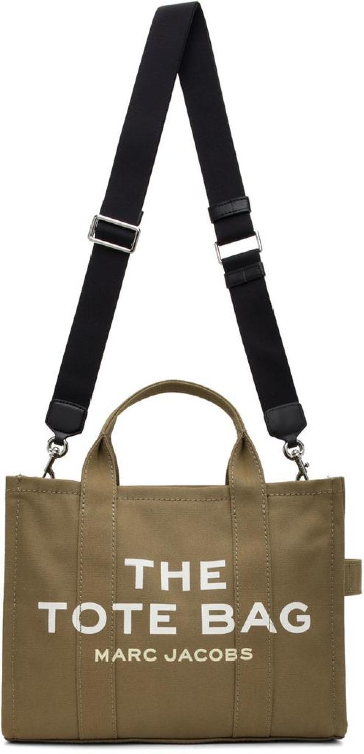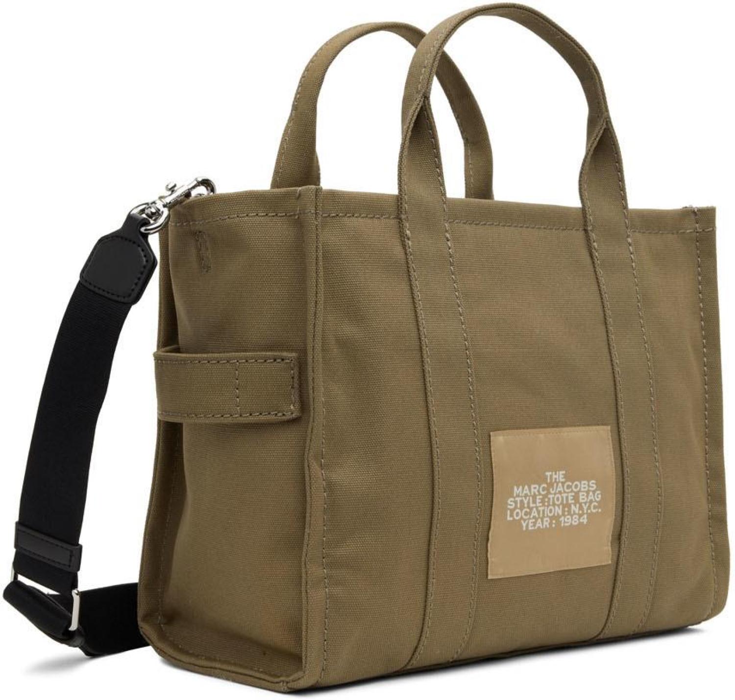 Cotton canvas tote in khaki. Features logo printed in white at face and textile logo patch in beige at back.