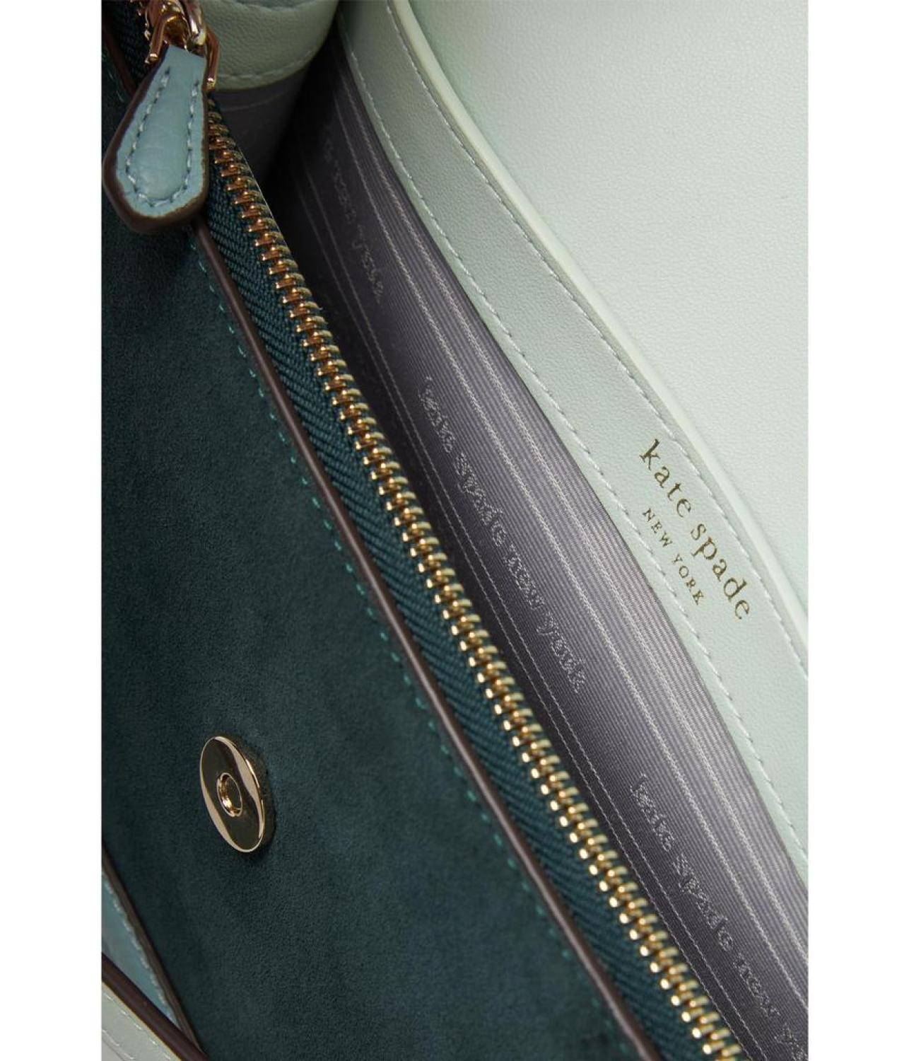 • Make your boring and dull attire vibrant carrying the Kate Spade New York® Knott Color-Blocked Pebbled Leather and Suede Leather Flap Crossbody. This handbag features a magnetic snap closure, one zippered interior pocket, and one chain-link detailing adjustable crossbody strap.