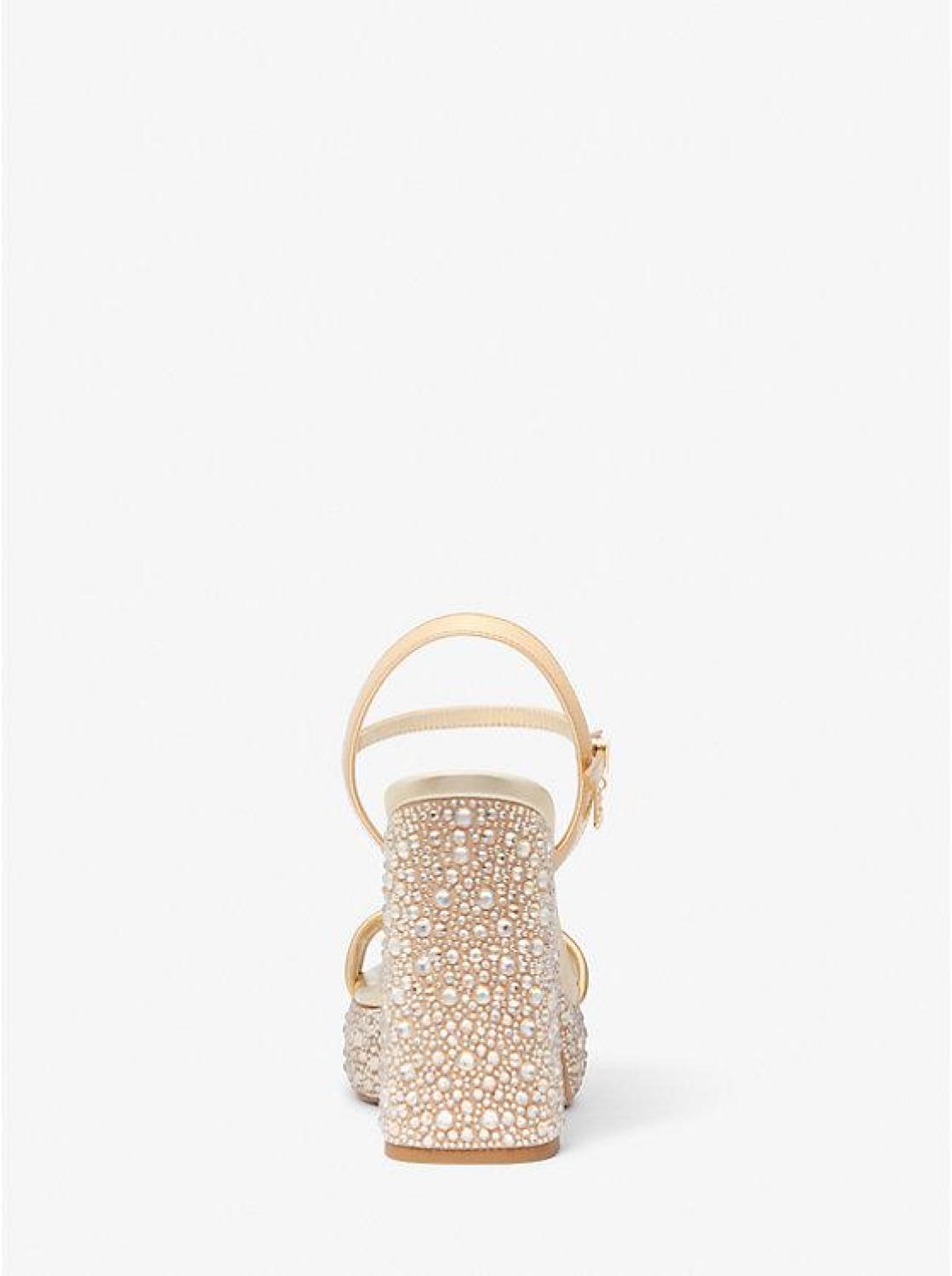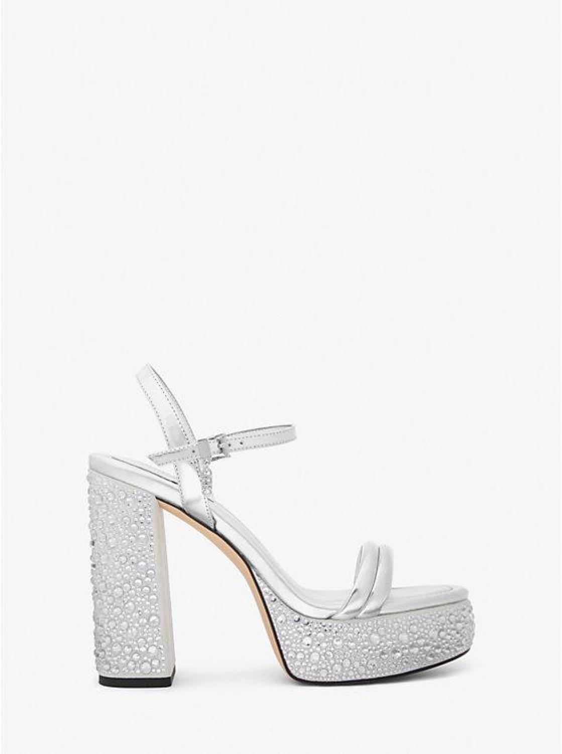 Hit the town in style in our show stopping Laci sandal. Crafted from high-shine metallic leather, they’re designed with a leg-lengthening platform and towering back heel covered in eye-catching embellishments. A dainty MK charm hangs from the buckle strap for a final touch of glamour. • Sandal • Metallic leather • 100% leather • Sole: rubber • Open toe • Buckle fastening • Heel height: 4.5” • Heel type: wrapped • Imported • Sandal • Metallic leather • 100% leather • Sole: rubber • Open toe • Buckle fastening • Heel height: 4.5” • Heel type: wrapped • Imported