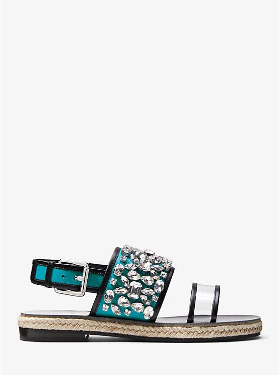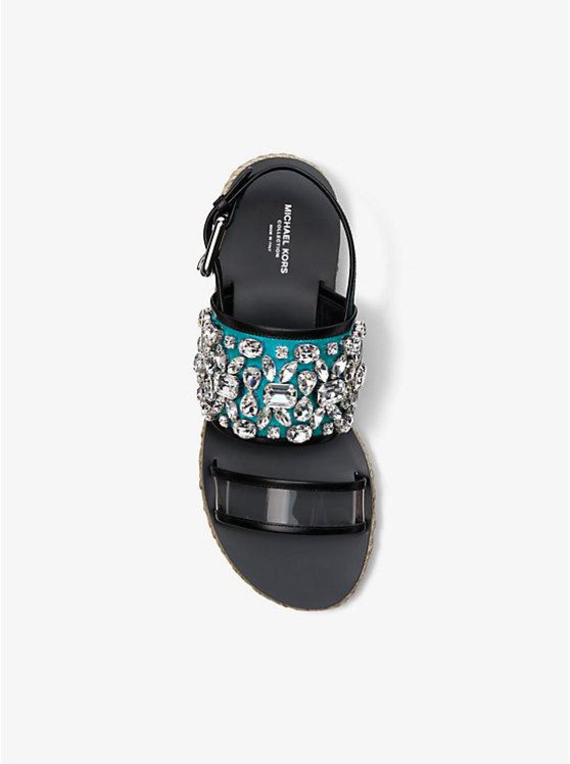 • The perfect blend of polish and functionality, the Lafayette sandal is crafted in Italy from calf leather and PVC with crystal embellishment and jute trim. A stylish daytime shoe that also works as a surprise statement after dark—how’s that for versatility?