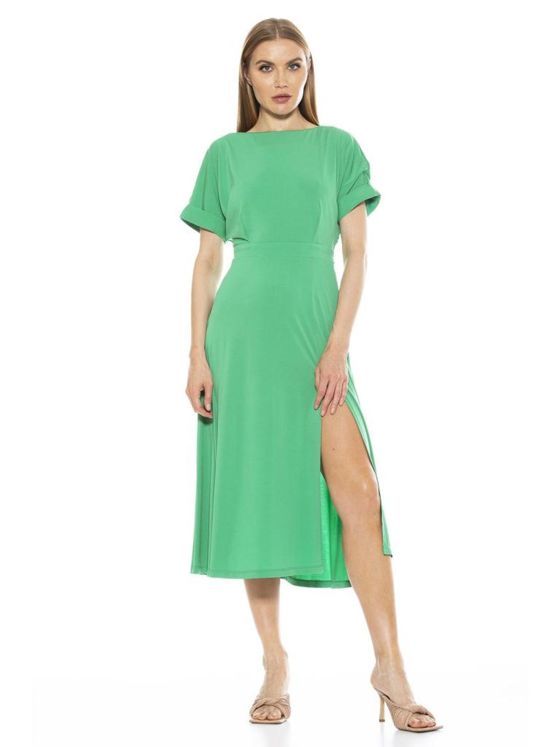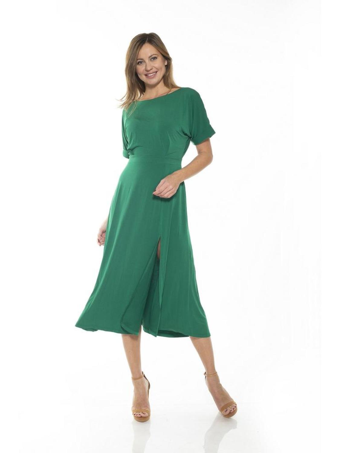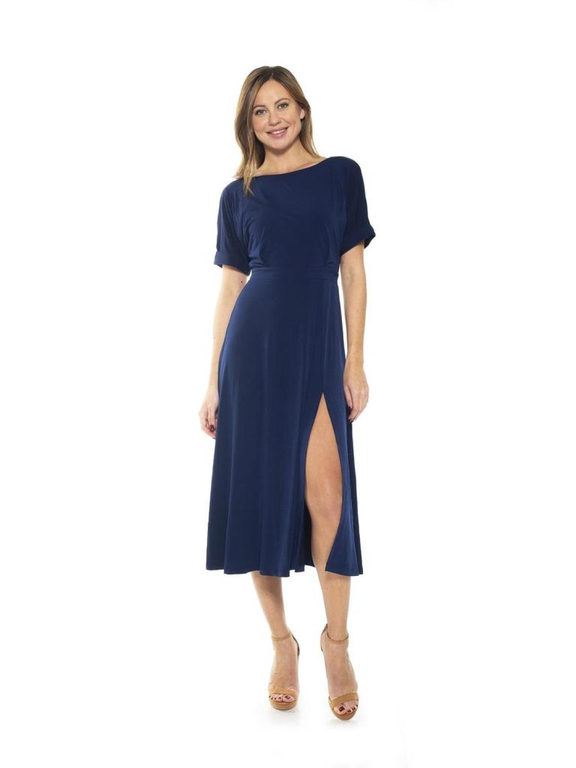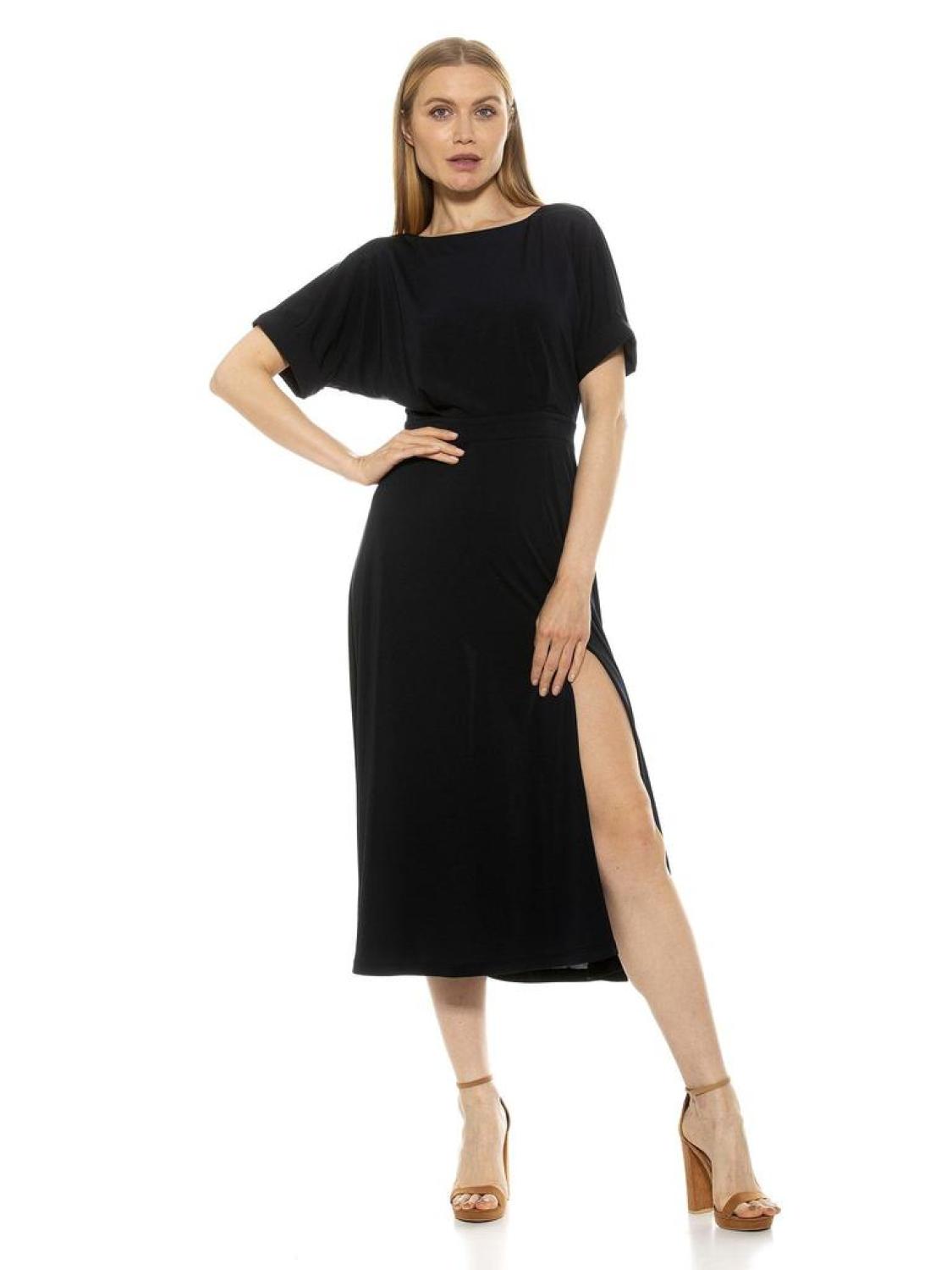 PRODUCT FEATURES Boatneck Dolman short sleeves V-back Soft drapery stretch material Leg slit Midi Length 95% Polyester, 5% Spandex Lined - 100% Polyester Machine wash Imported Style D3789
