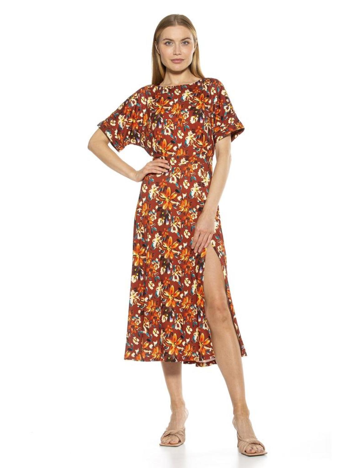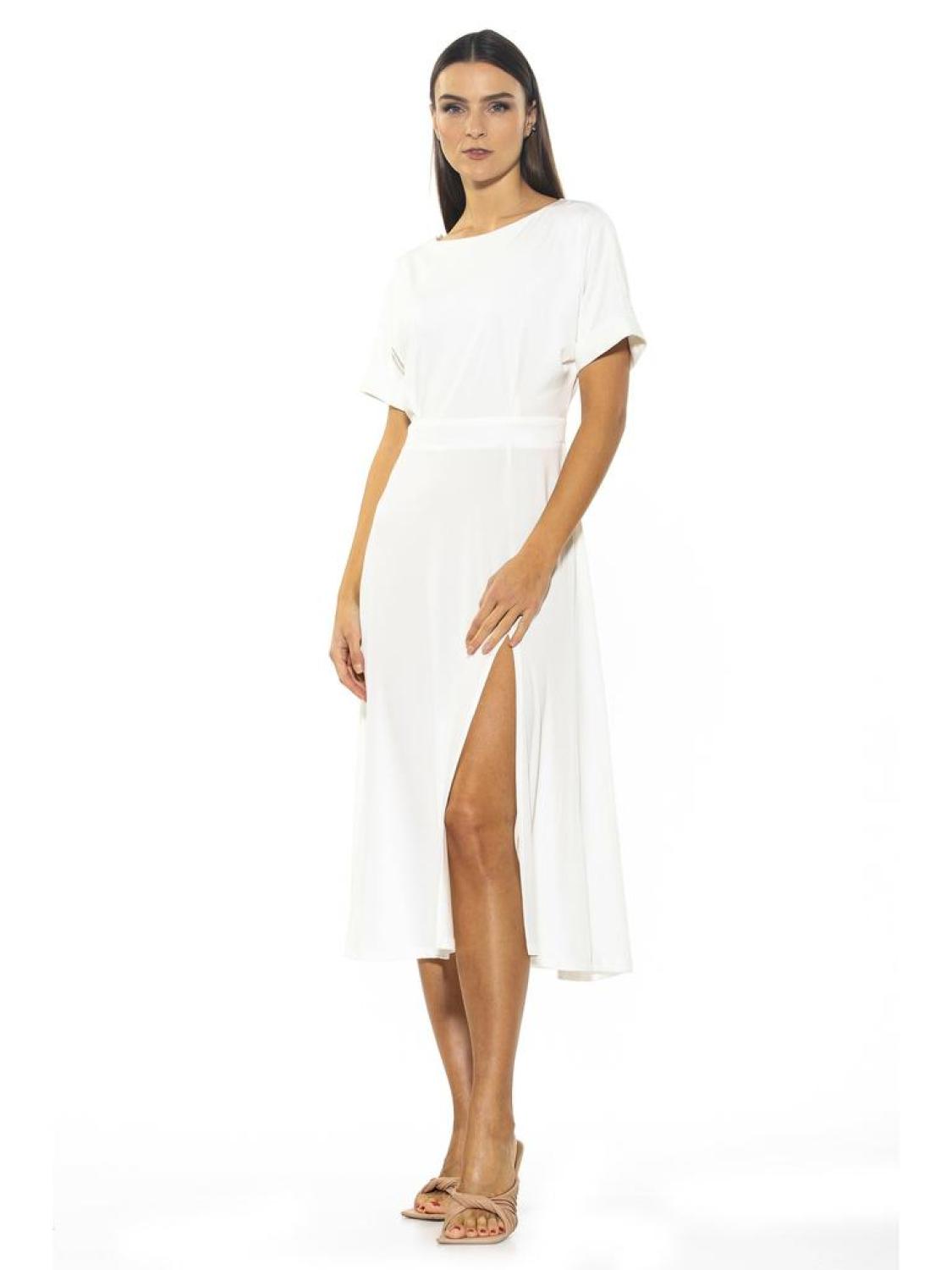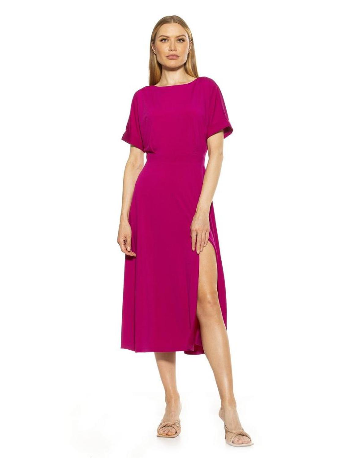 PRODUCT FEATURES Boatneck Dolman short sleeves V-back Soft drapery stretch material Leg slit Midi Length 95% Polyester, 5% Spandex Lined - 100% Polyester Machine wash Imported Style D3789