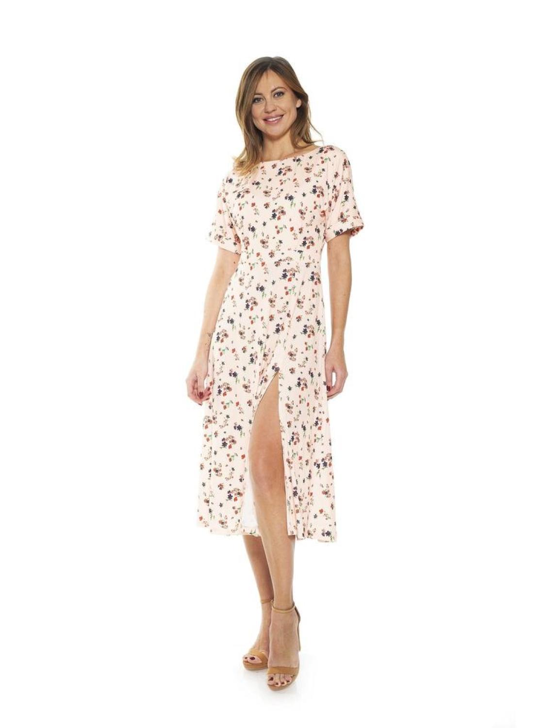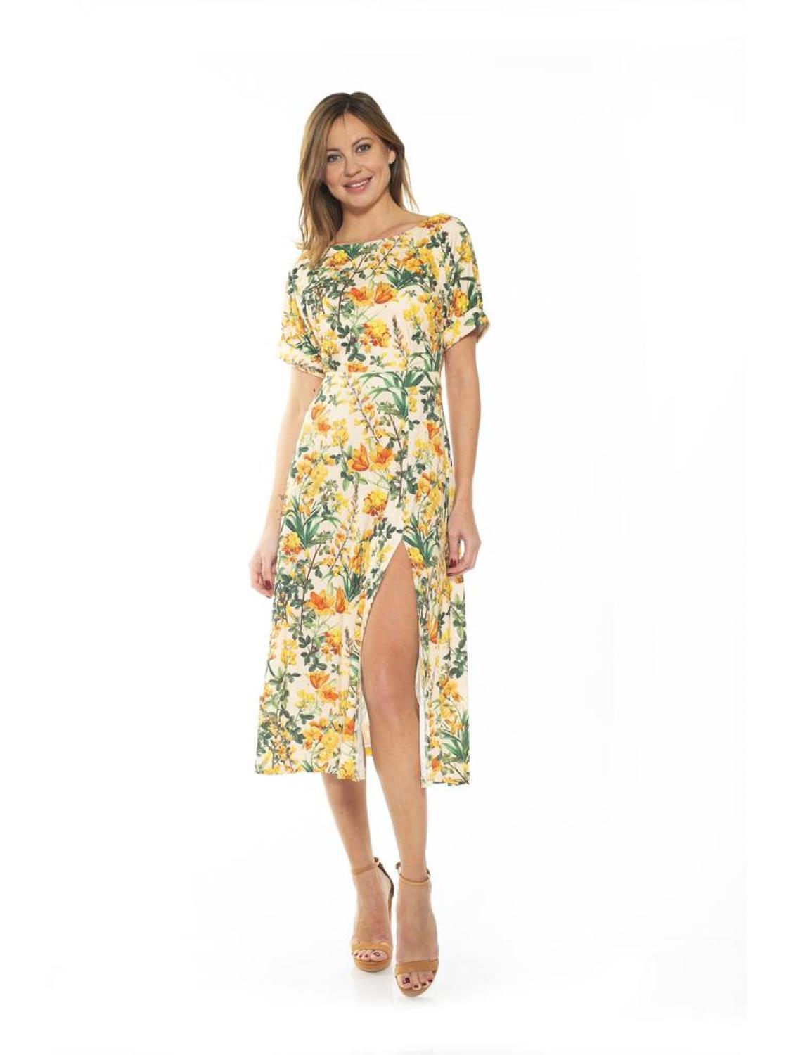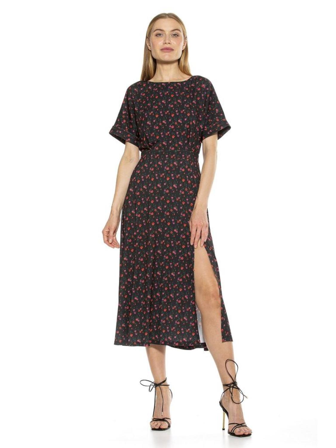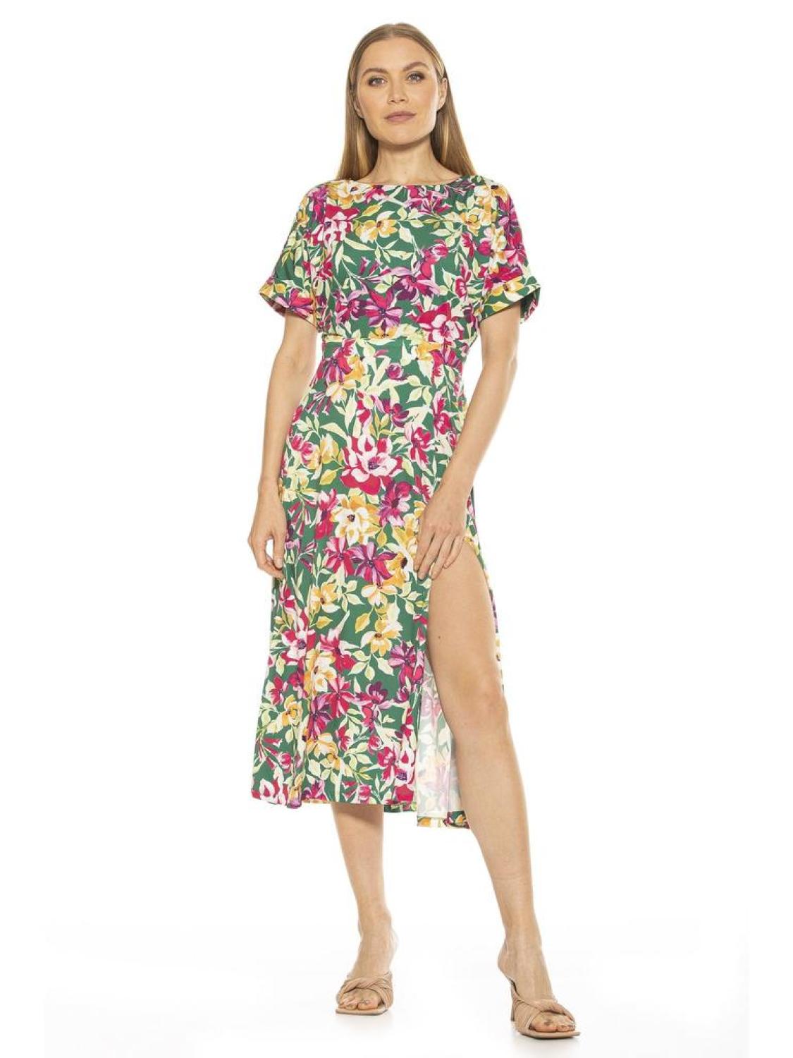 PRODUCT FEATURES Boatneck Dolman short sleeves V-back Soft drapery stretch material Leg slit Midi Length 95% Polyester, 5% Spandex Lined - 100% Polyester Machine wash Imported Style D3789
