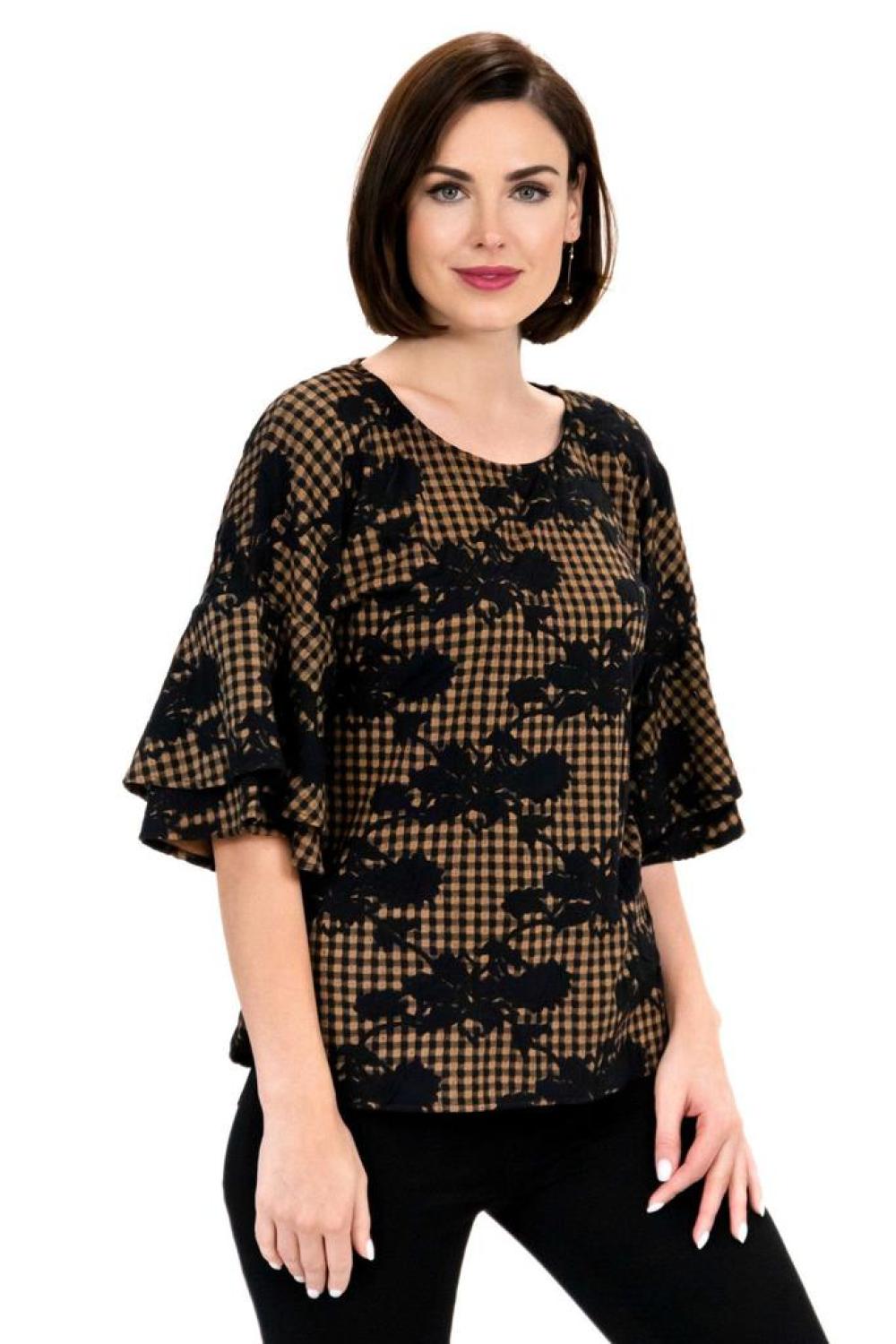 • A lovely soft knit top with an oversized ruffled half sleeve and elastic waist in the back. Pullover styling Round neck Small scale gingham knit fabric